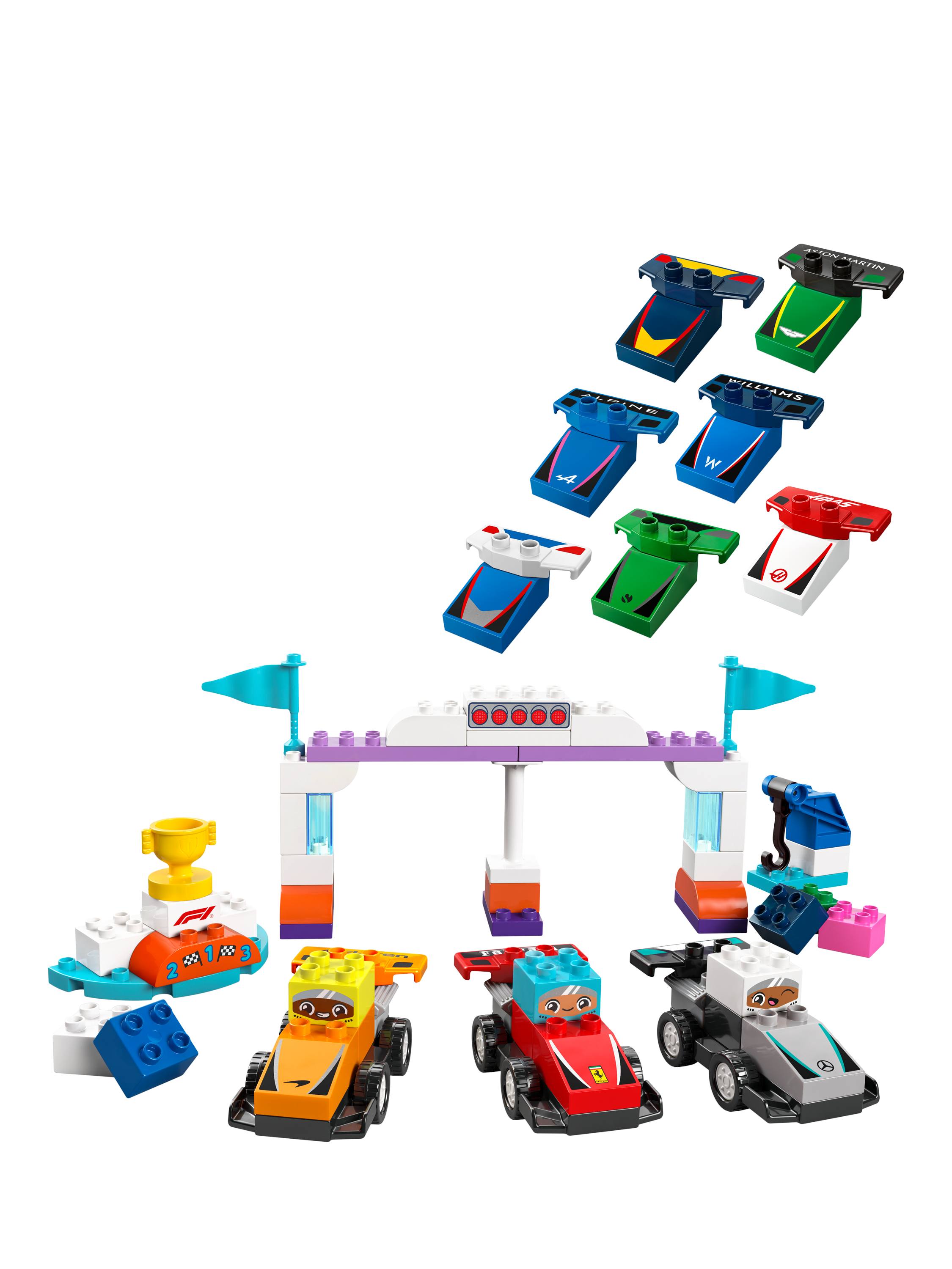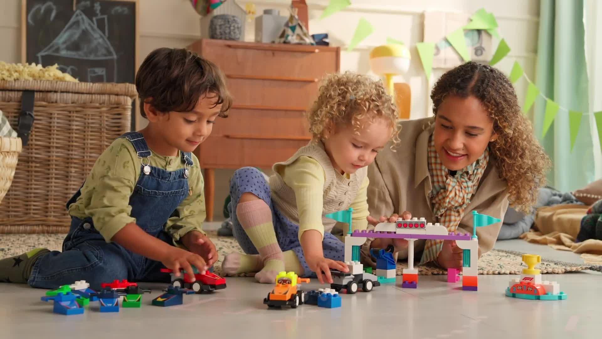 Creative fun for family playtimes — Share your passion for F1® with your preschooler with this toddler toy that includes 10 buildable race cars, 3 driver bricks, a crane toy, start lights and a podium.