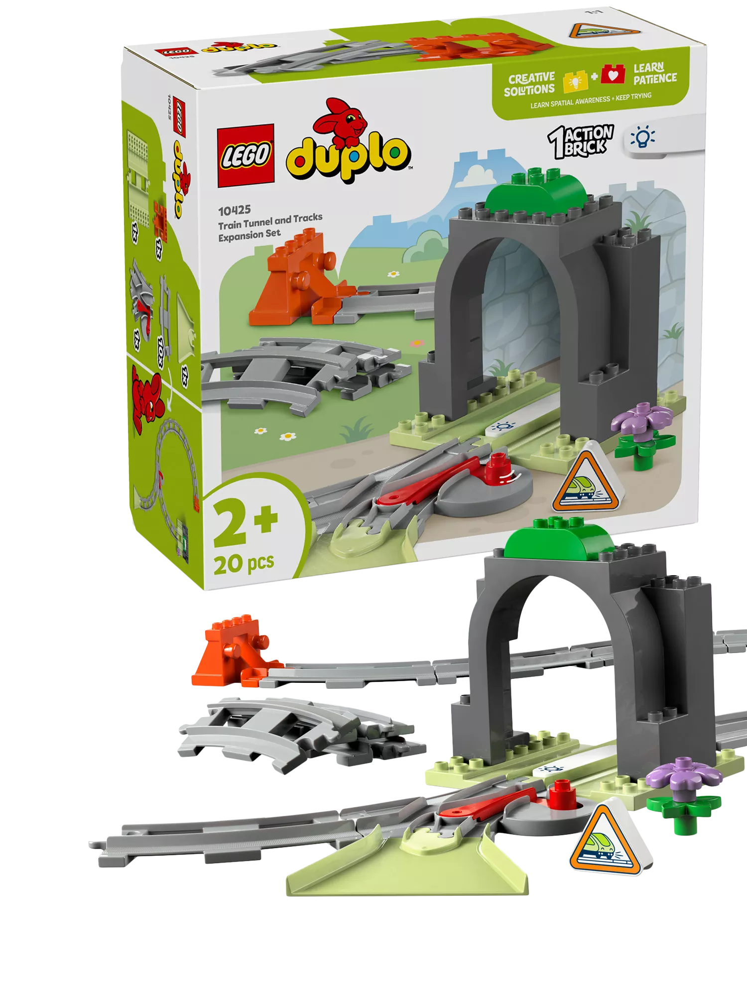 Extend toddlers’ train adventures with the Train Tunnel and Tracks Expansion Set (10425) toy for toddlers. Little ones aged 2+ grow their learning adventures as they add a tunnel and extra track to their LEGO® DUPLO® Town interactive toy train sets (10427 and 10428, sold separately).