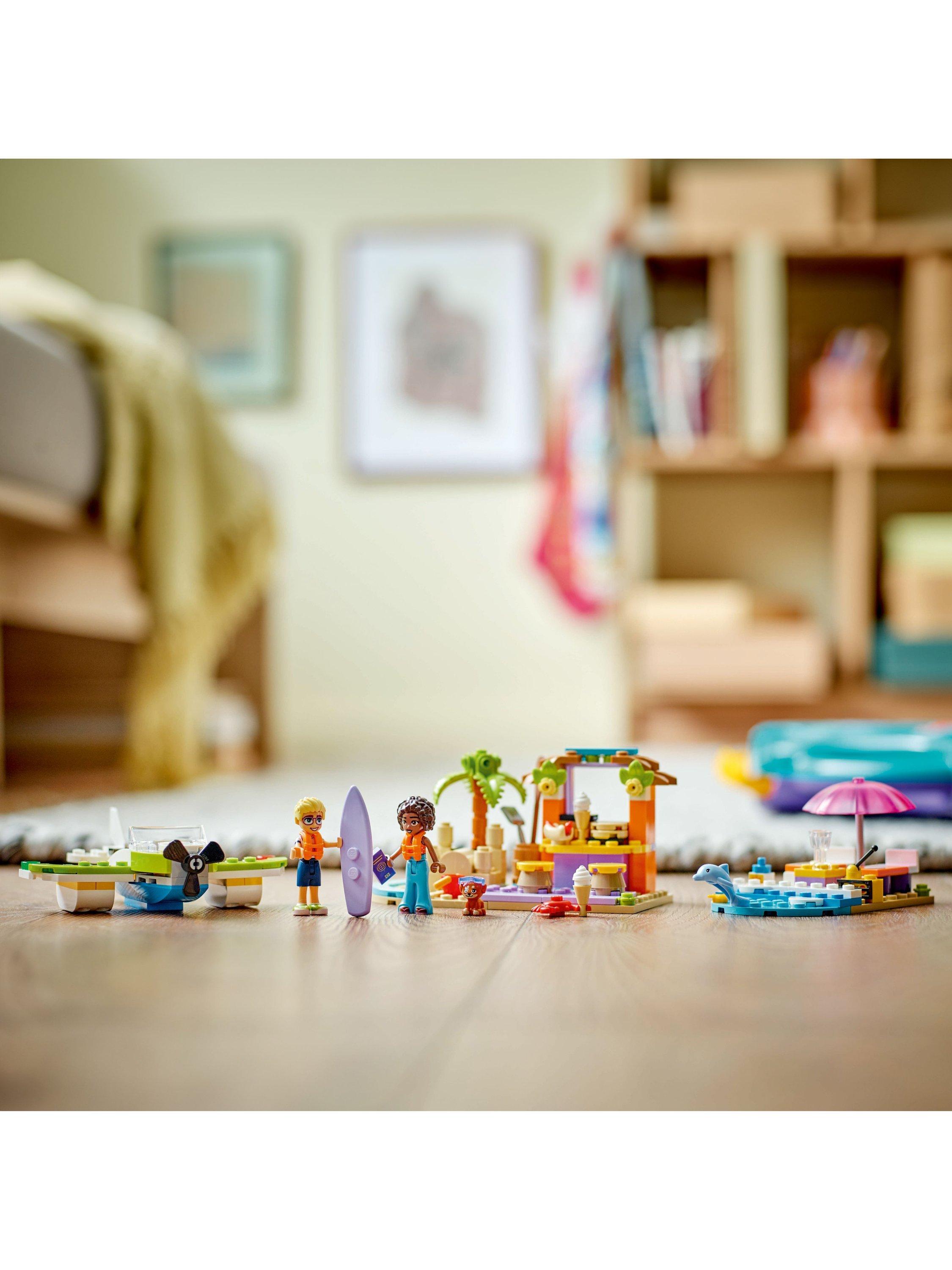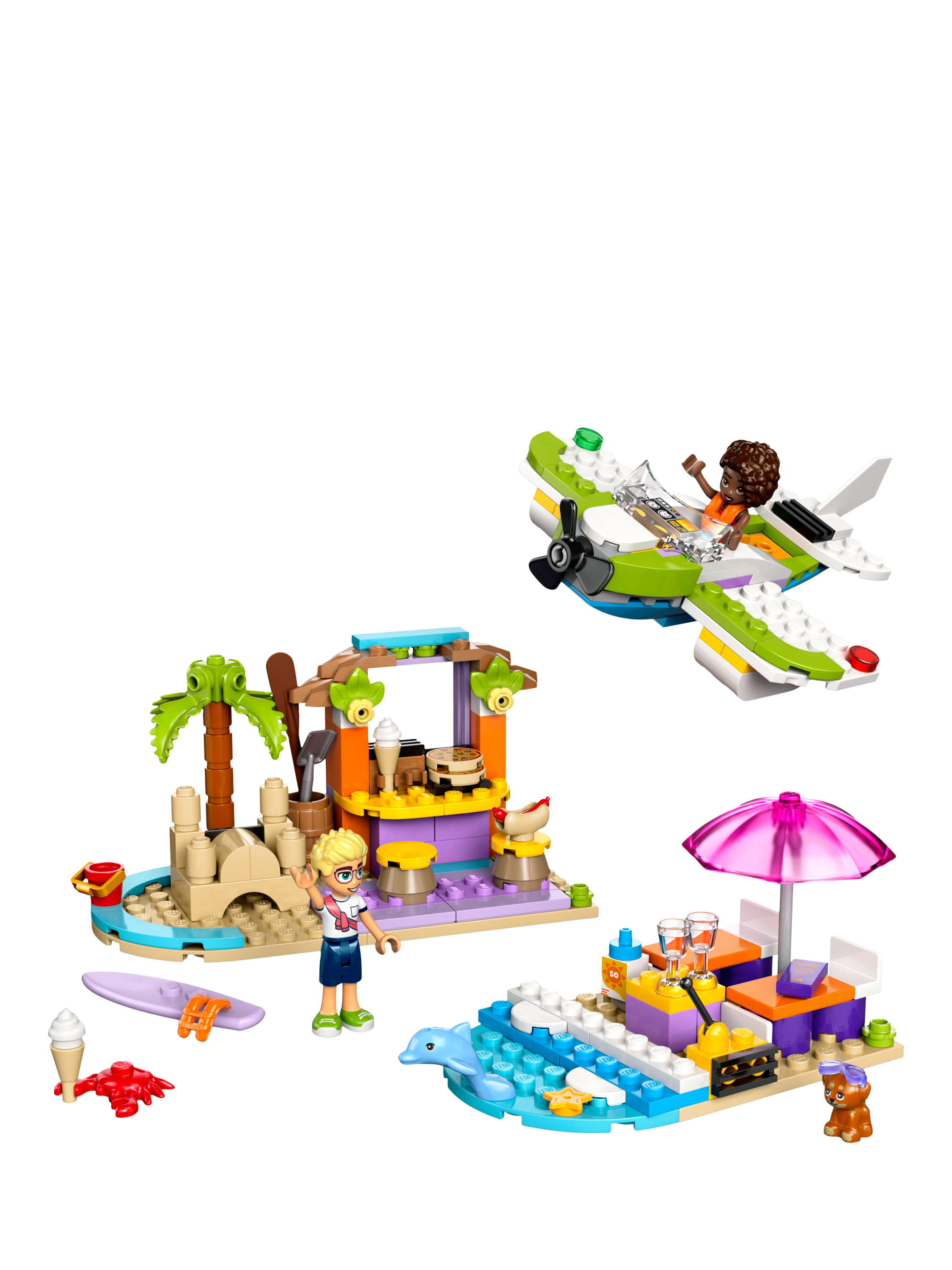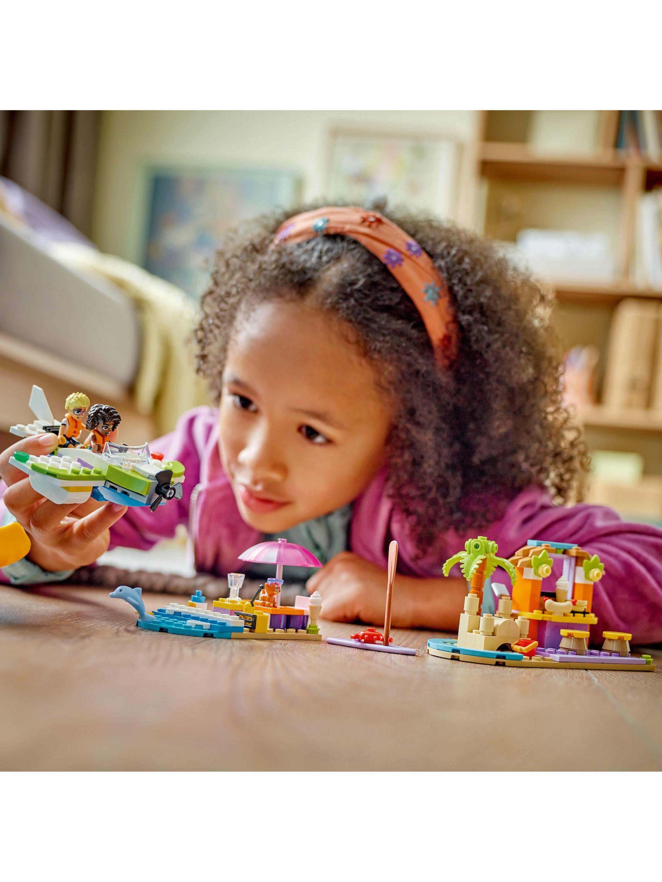 This pretend-play set has everything kids need to build a seaplane toy with spinning propeller, a relaxation area with a surfboard, and a beach café hangout with sandcastles, seating and ice cream accessories. The models rebuild into a speedboat toy, an outside seating area and a pizza shop with a pizza oven. The building toy comes with 2 minidolls and dog and dolphin figures for role play.