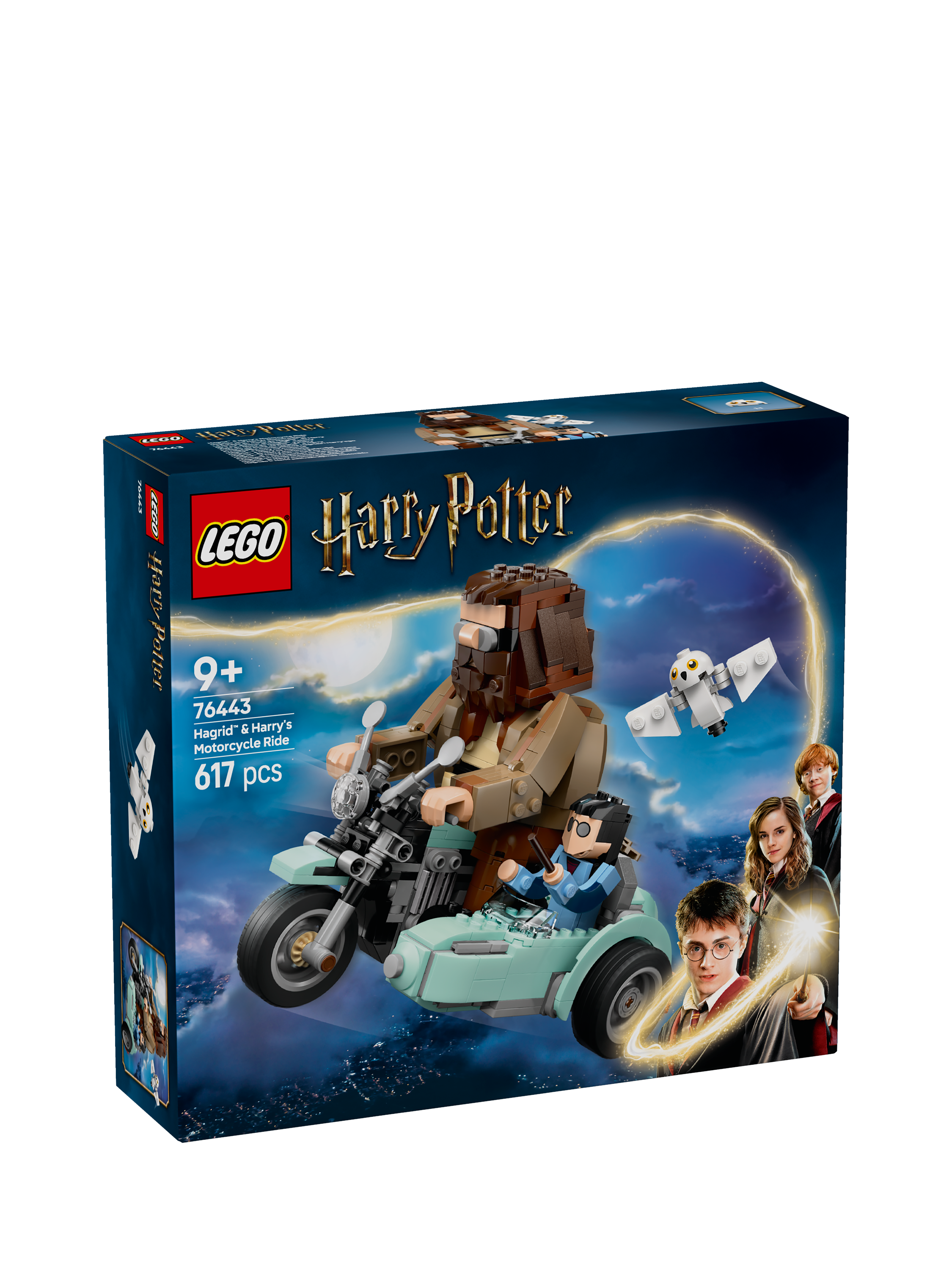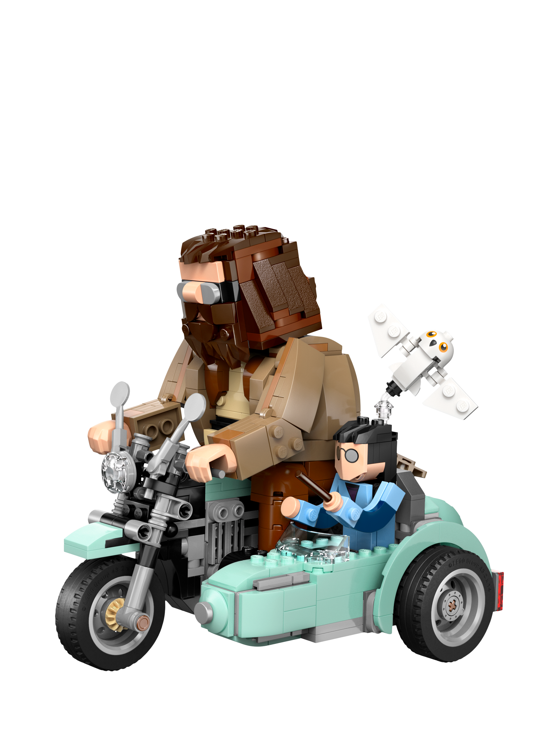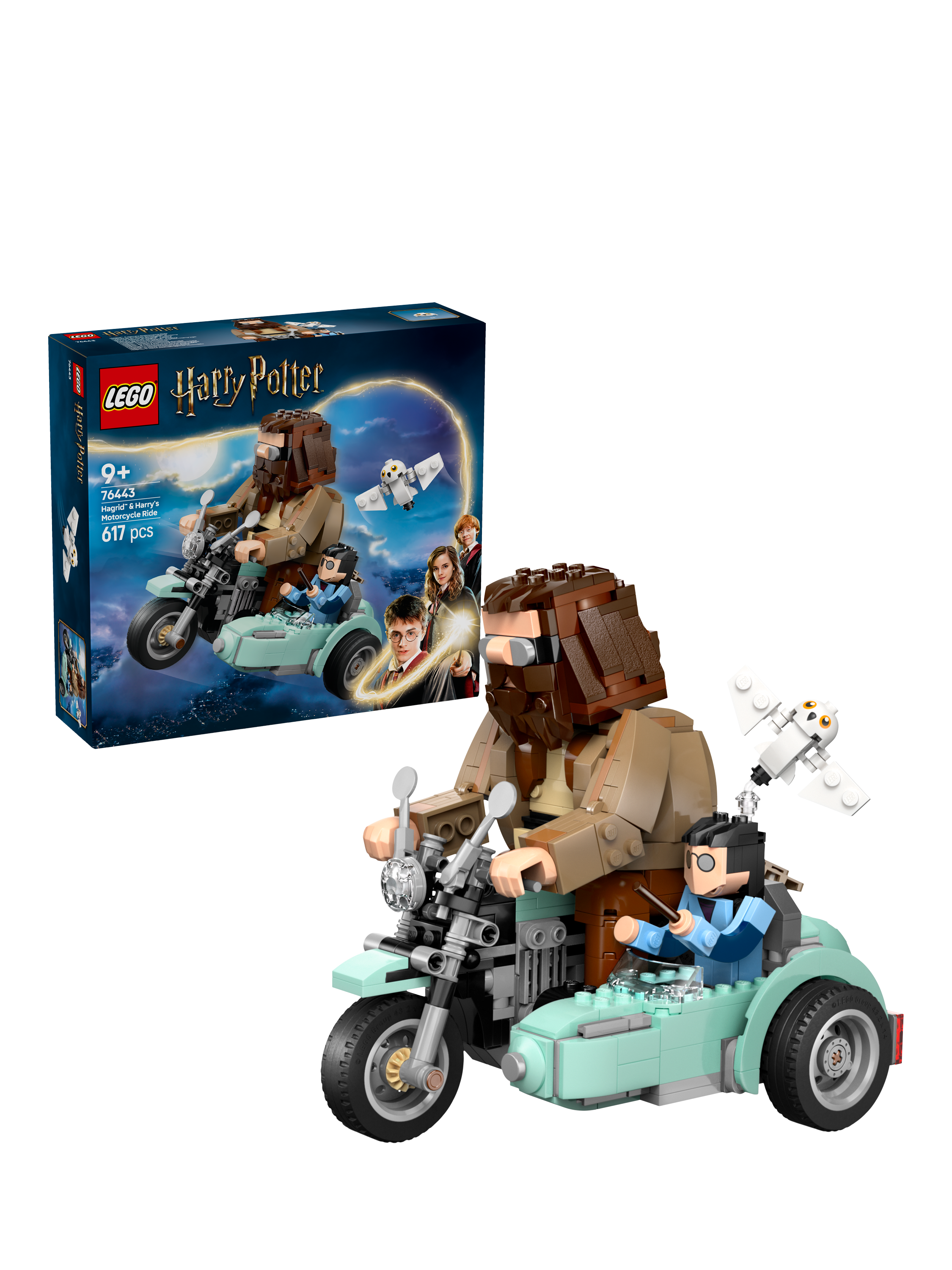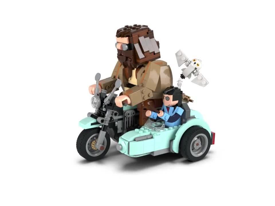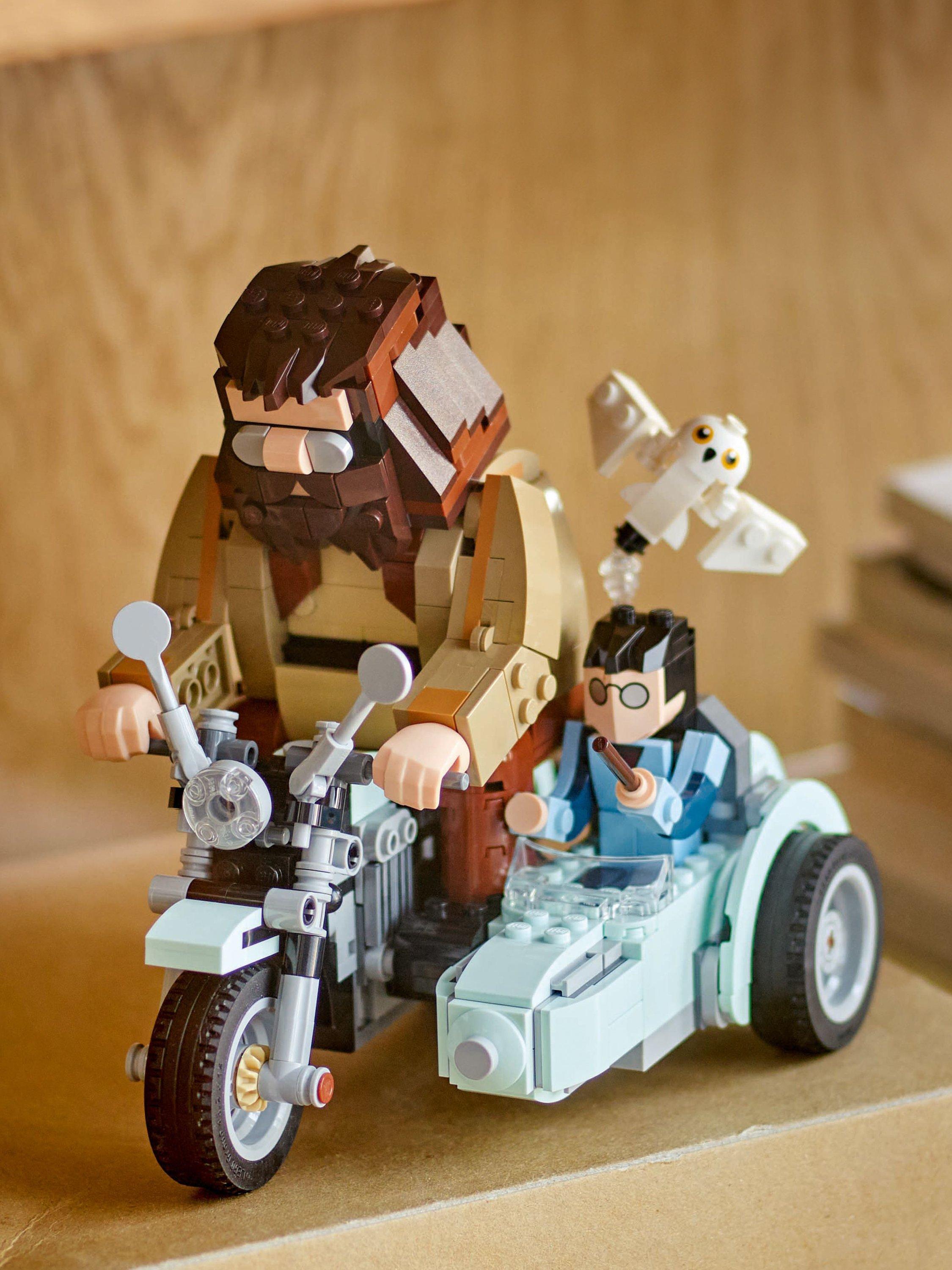 A cool birthday gift for kids aged 9 and over, this LEGO® Harry Potter™ play-and-display set features built-in, posable Harry Potter, Hedwig™ and Rubeus Hagrid toy figures riding on a motorbike and in its sidecar. The LEGO brick-built vehicle toy’s wheels turn so kids can play out iconic Harry Potter and the Deathly Hallows™ scenes, or the model can be displayed as striking Harry Potter room decor.