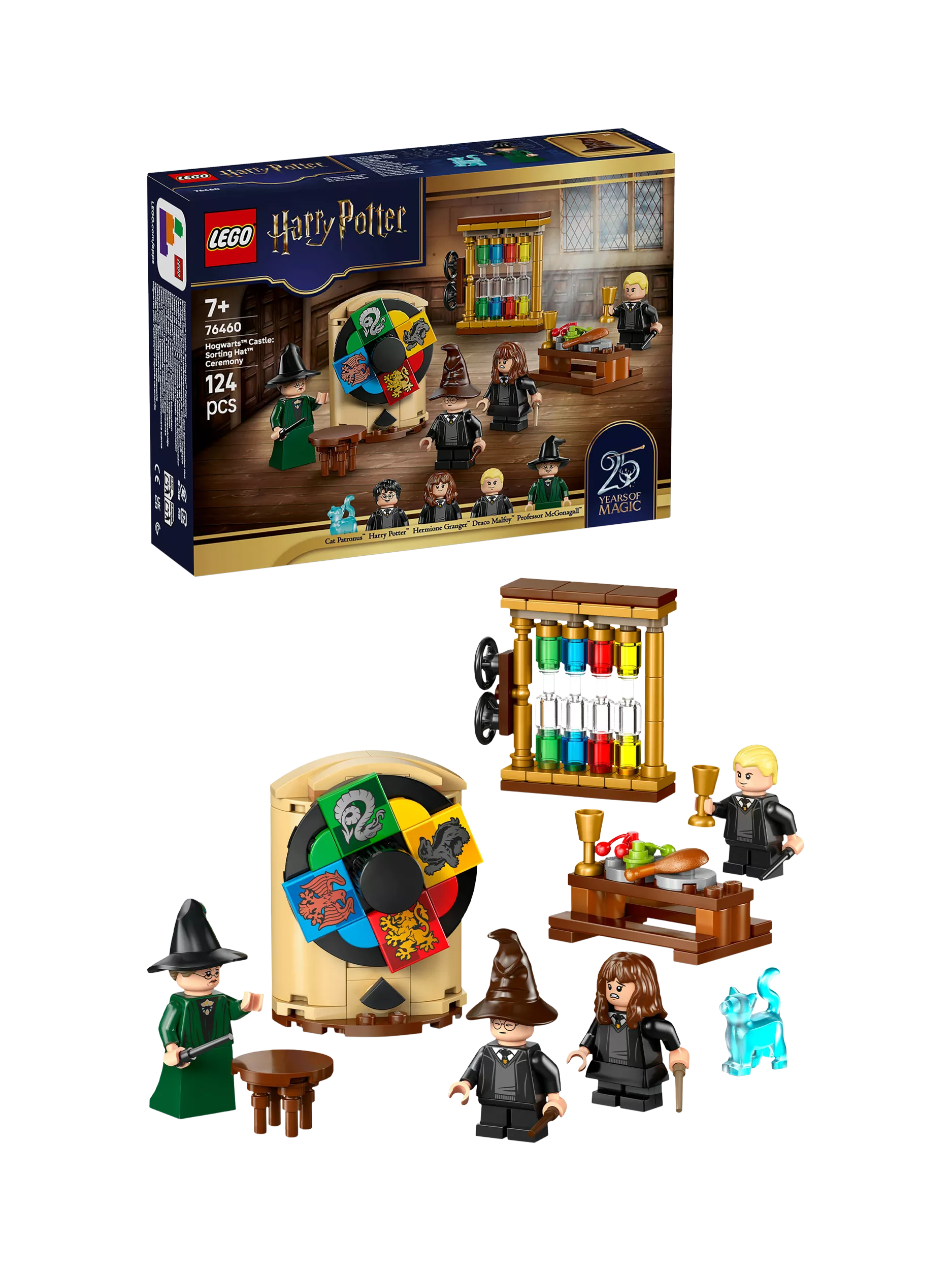 Relive the Sorting Hat ceremony at Hogwarts Castle from Harry Potter and the Philosopher's Stone with this LEGO Harry Potter toy for 7+ year old kids (76460). The building set features four LEGO Harry Potter minifigures: Professor McGonagall, Harry Potter, Hermione Granger and Draco Malfoy. Place the Sorting Hat on each student and spin the 'sorting wheel' to discover which Hogwarts house they will join. A dinner table and house points counter add to the play possibilities.