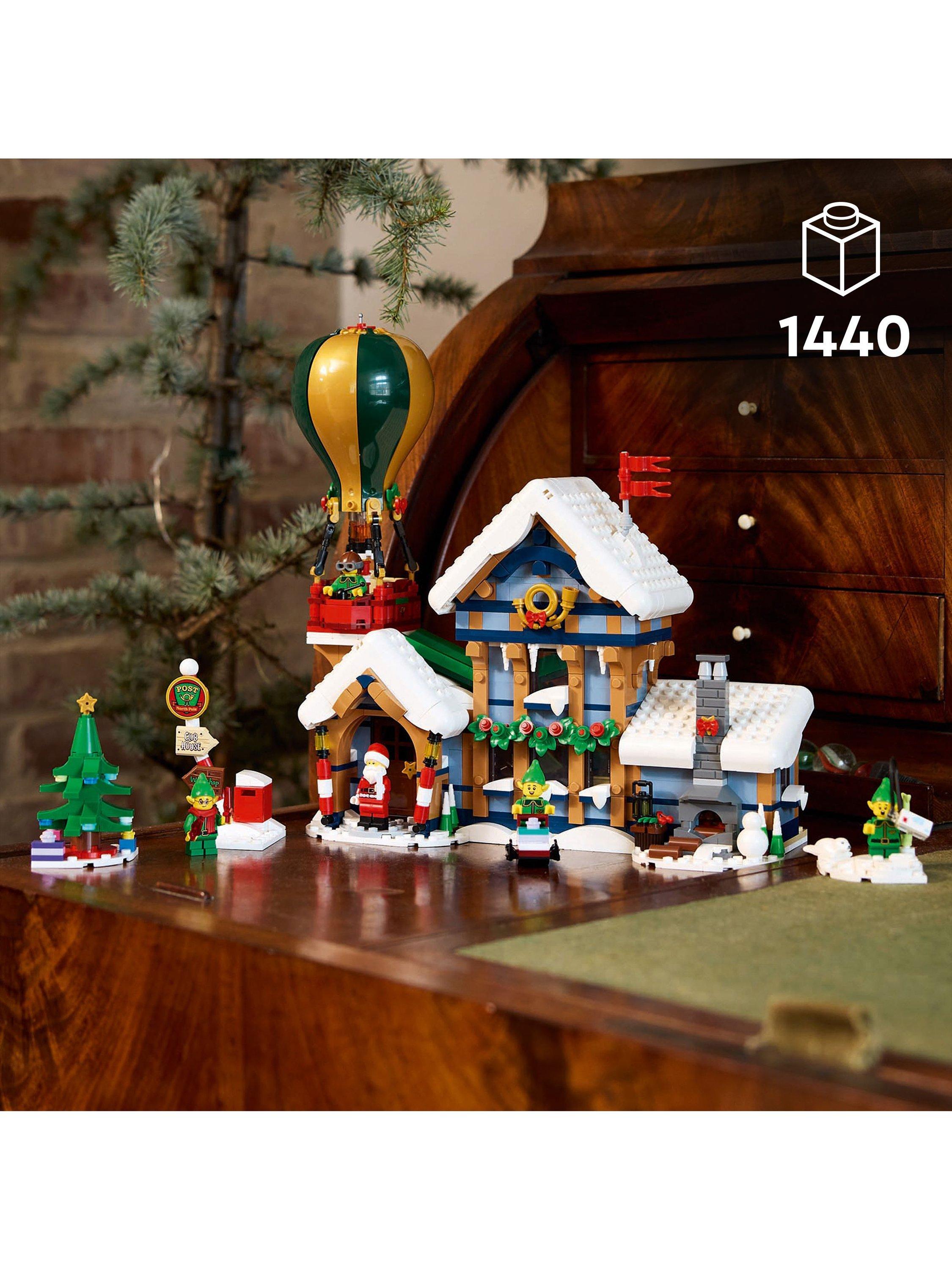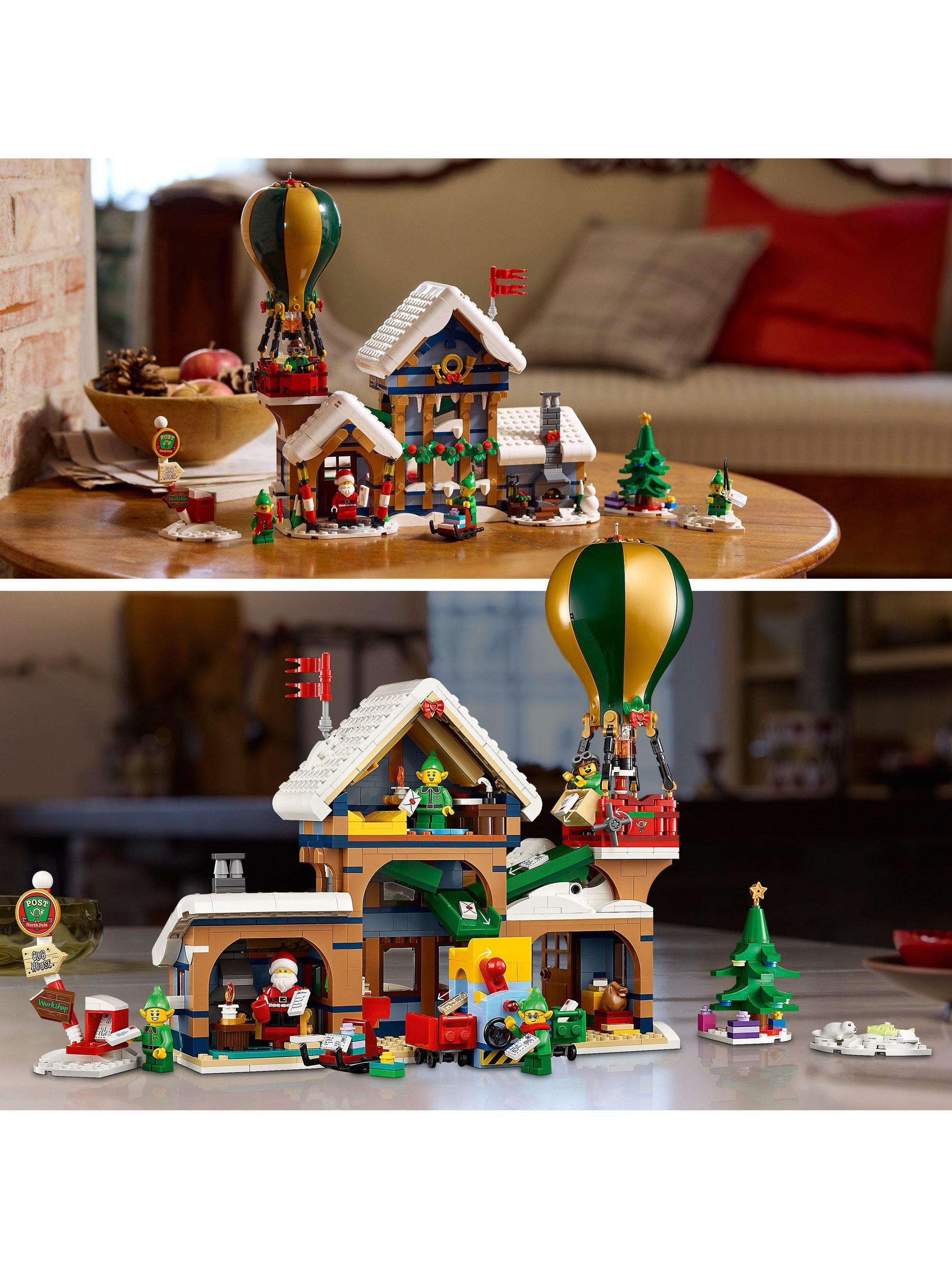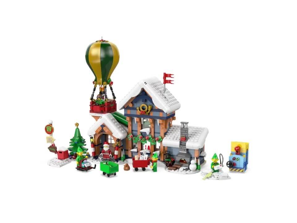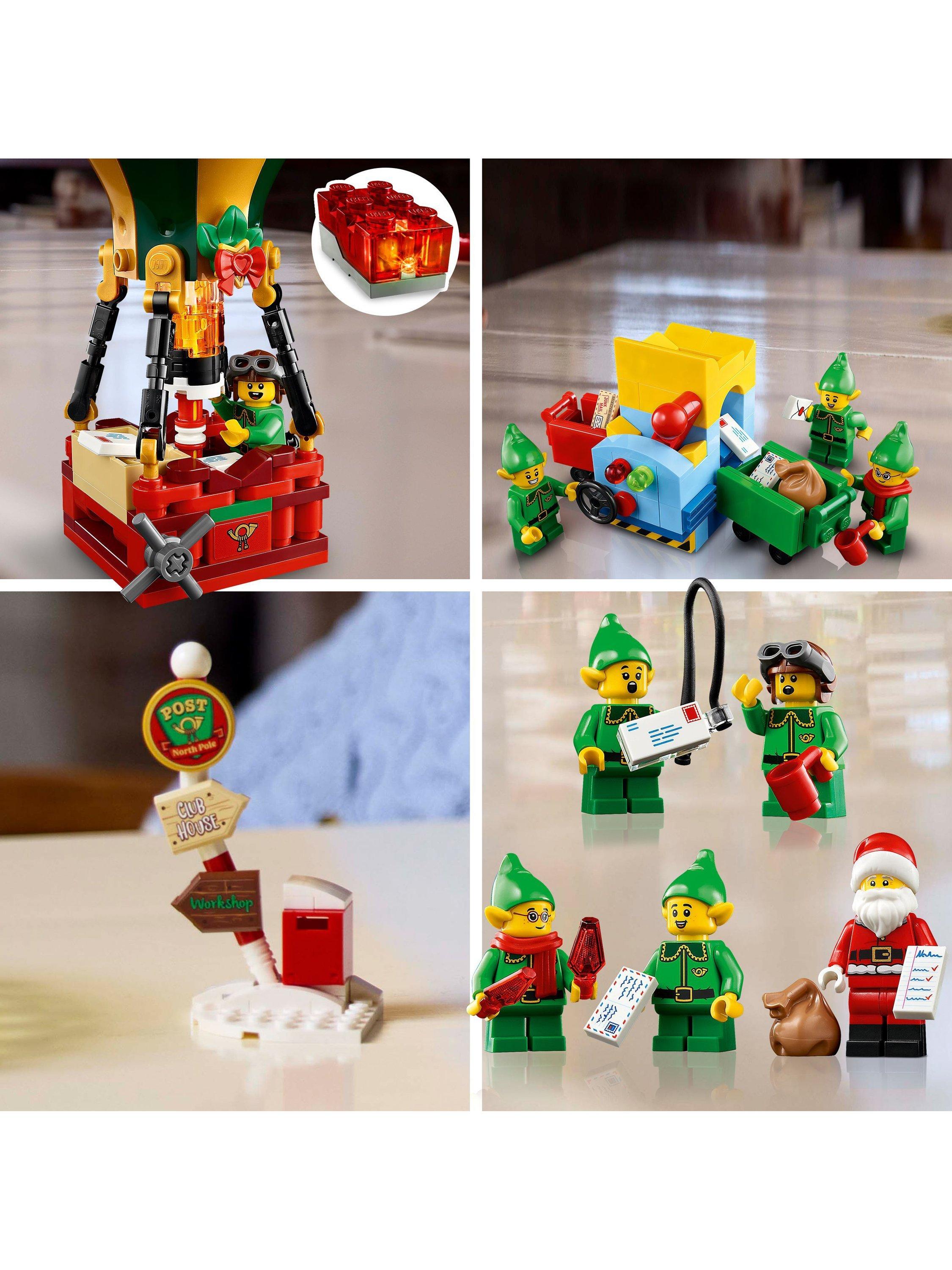 The snow-topped post office houses Santa’s study complete with a cosy log fire, a postal sorting area, an entrance hall with a coffee machine and a first-floor writing area with a letter chute. Other builds include a hot-air balloon with an illuminating burner, a 2-way letter sorter, an ice-fishing scene, Christmas tree, signpost, postbox and sledge, plus a Santa minifigure and 4 elf figures.