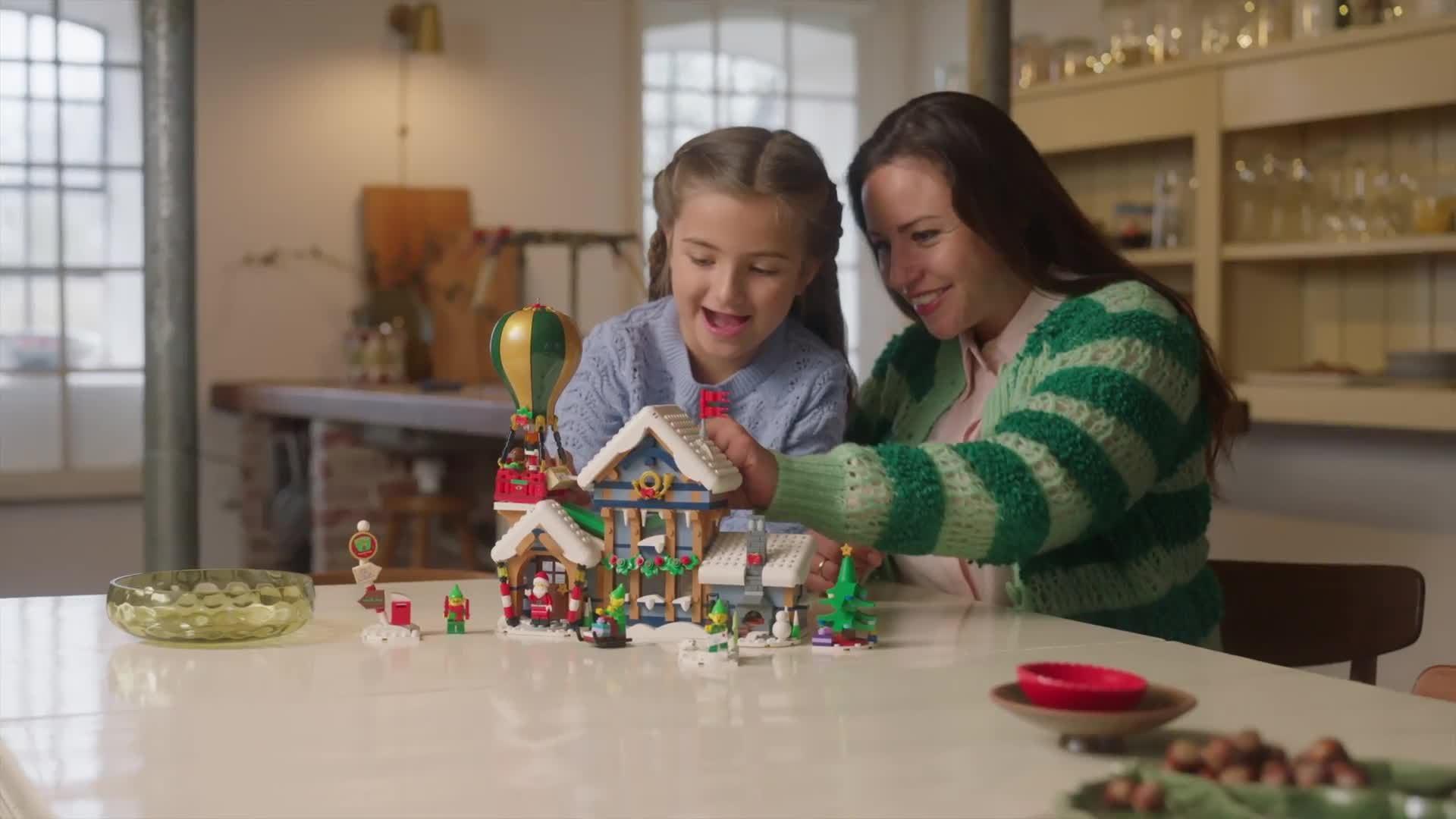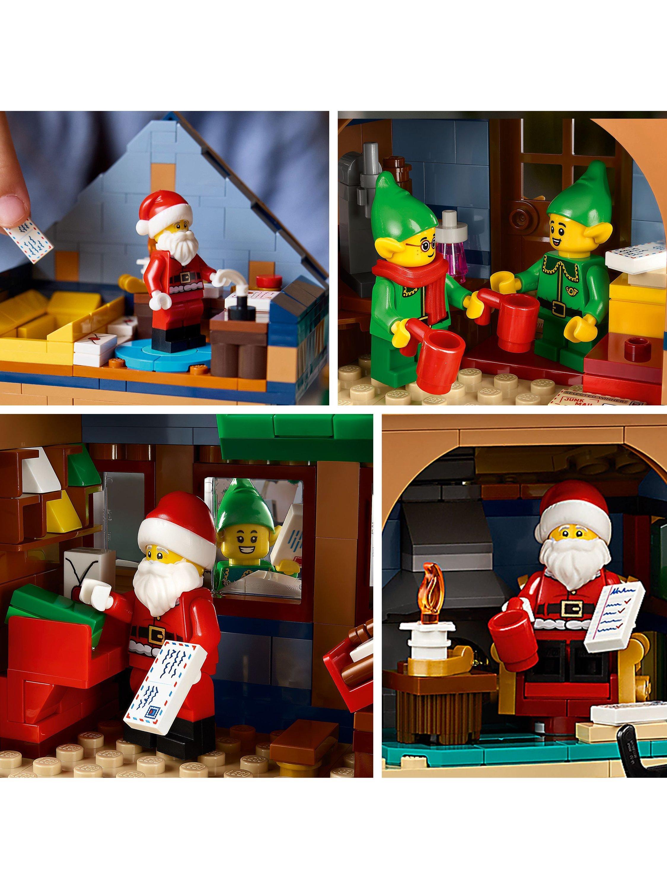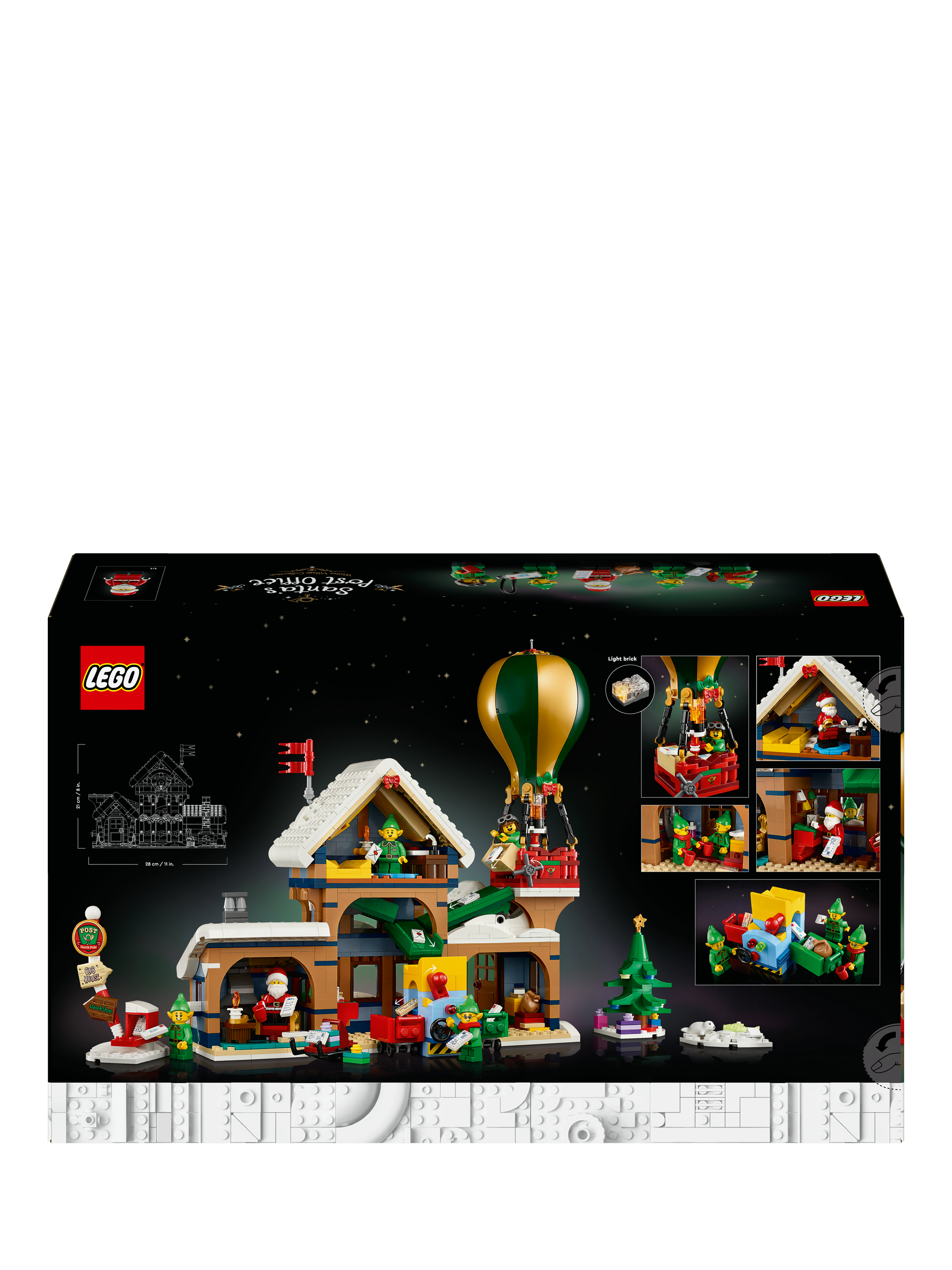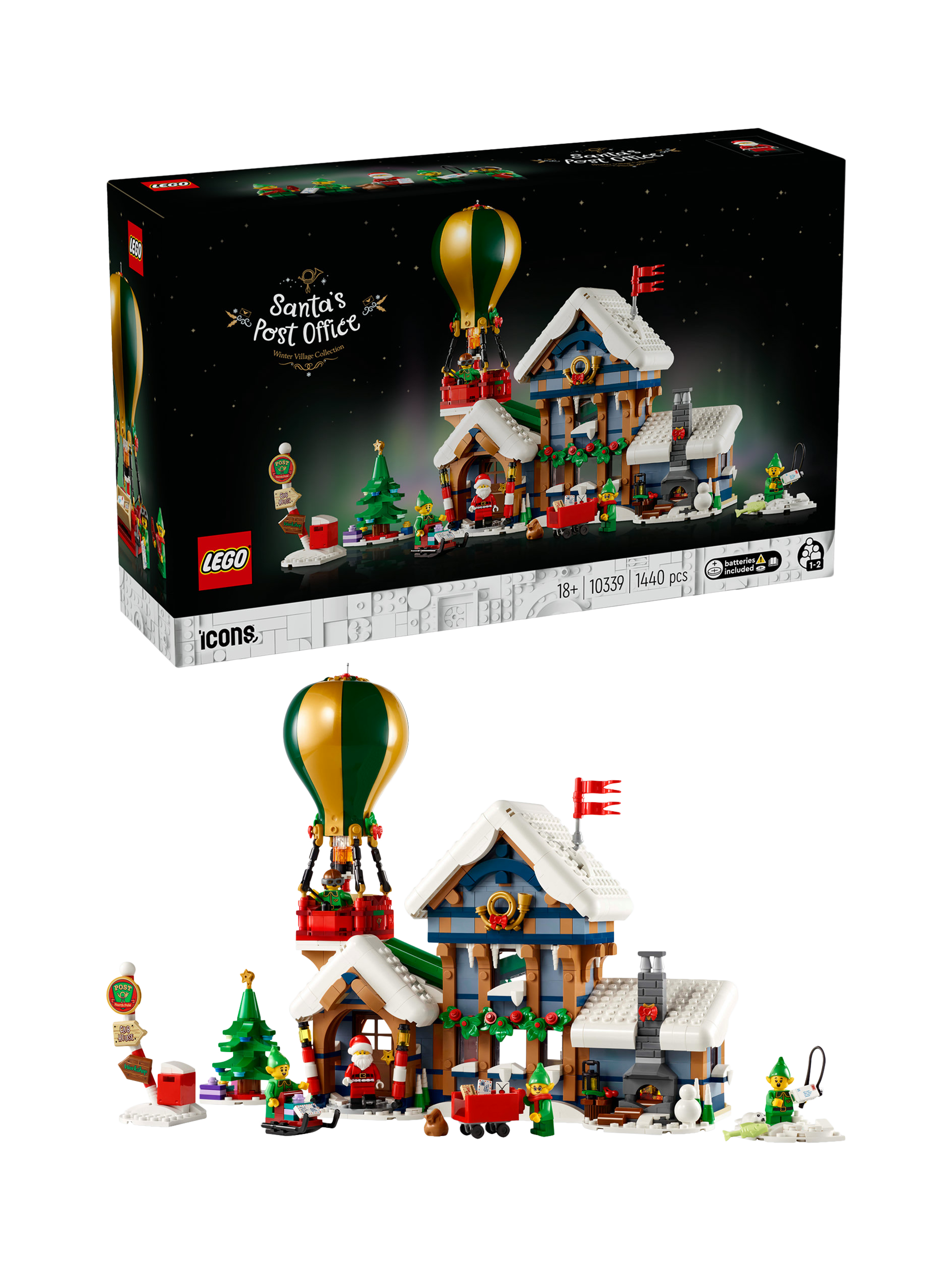 The snow-topped post office houses Santa’s study complete with a cosy log fire, a postal sorting area, an entrance hall with a coffee machine and a first-floor writing area with a letter chute. Other builds include a hot-air balloon with an illuminating burner, a 2-way letter sorter, an ice-fishing scene, Christmas tree, signpost, postbox and sledge, plus a Santa minifigure and 4 elf figures.