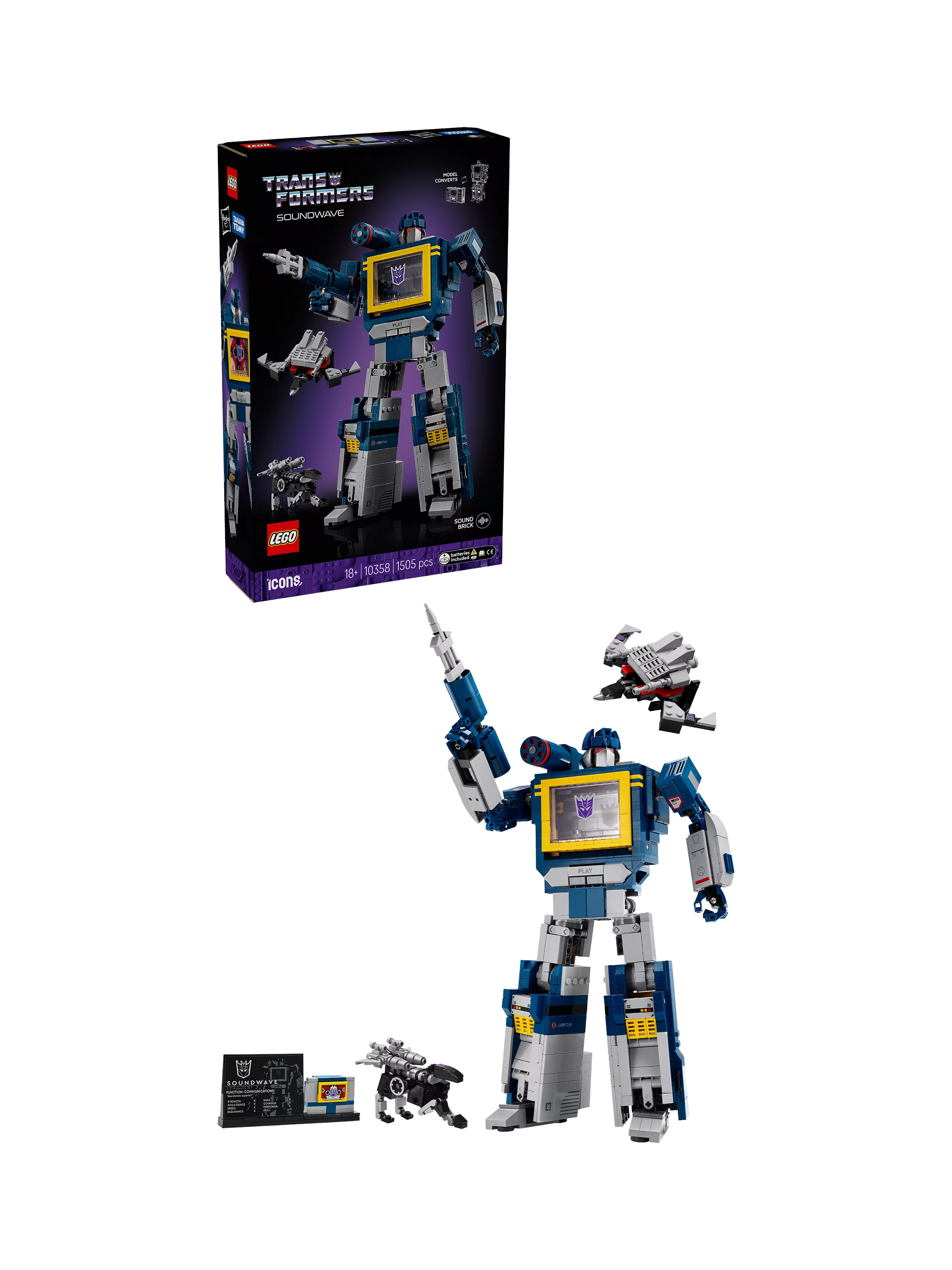 Create a captivating centrepiece or surprise a loved one with this LEGO Icons Transformers: Soundwave (10358) building set for adults and teenage fans of the epic sci-fi film series. Build a detailed LEGO replica of the iconic Decepticon robot figure, along with his trusted companions Ravage and Laserbeak.
