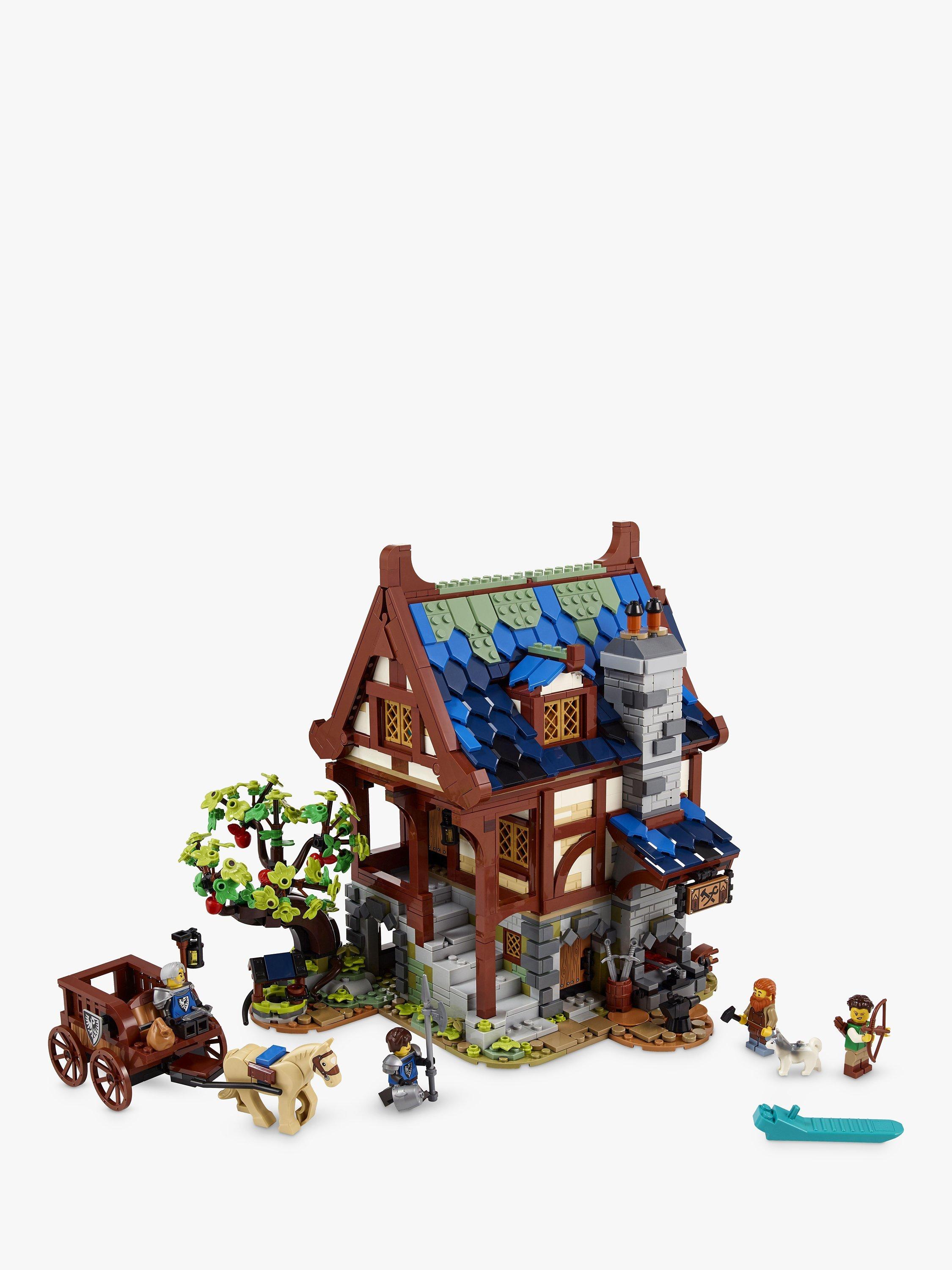 The architectural details of a 3-level building from the Middle Ages are lovingly recreated in signature LEGO style. The roof and top 2 levels lift off for easy viewing of the fully furnished bedroom and kitchen, plus a workshop that is packed with items you’d have seen in a real medieval blacksmith’s smithy.