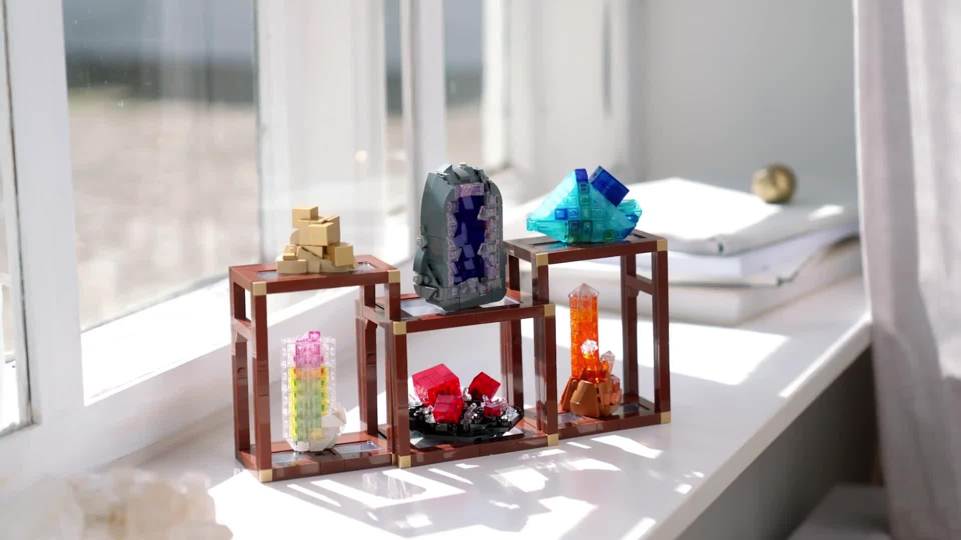 Use clever building techniques and transparent LEGO bricks to create models of golden pyrite, purple amethyst, blue fluorite, watermelon tourmaline, reddish-pink rhodochrosite and tangerine quartz. Assemble the three freestanding shelving units and attach your creations to the shelves. Arrange the units as you wish and swap the minerals to different shelves to change up your display.