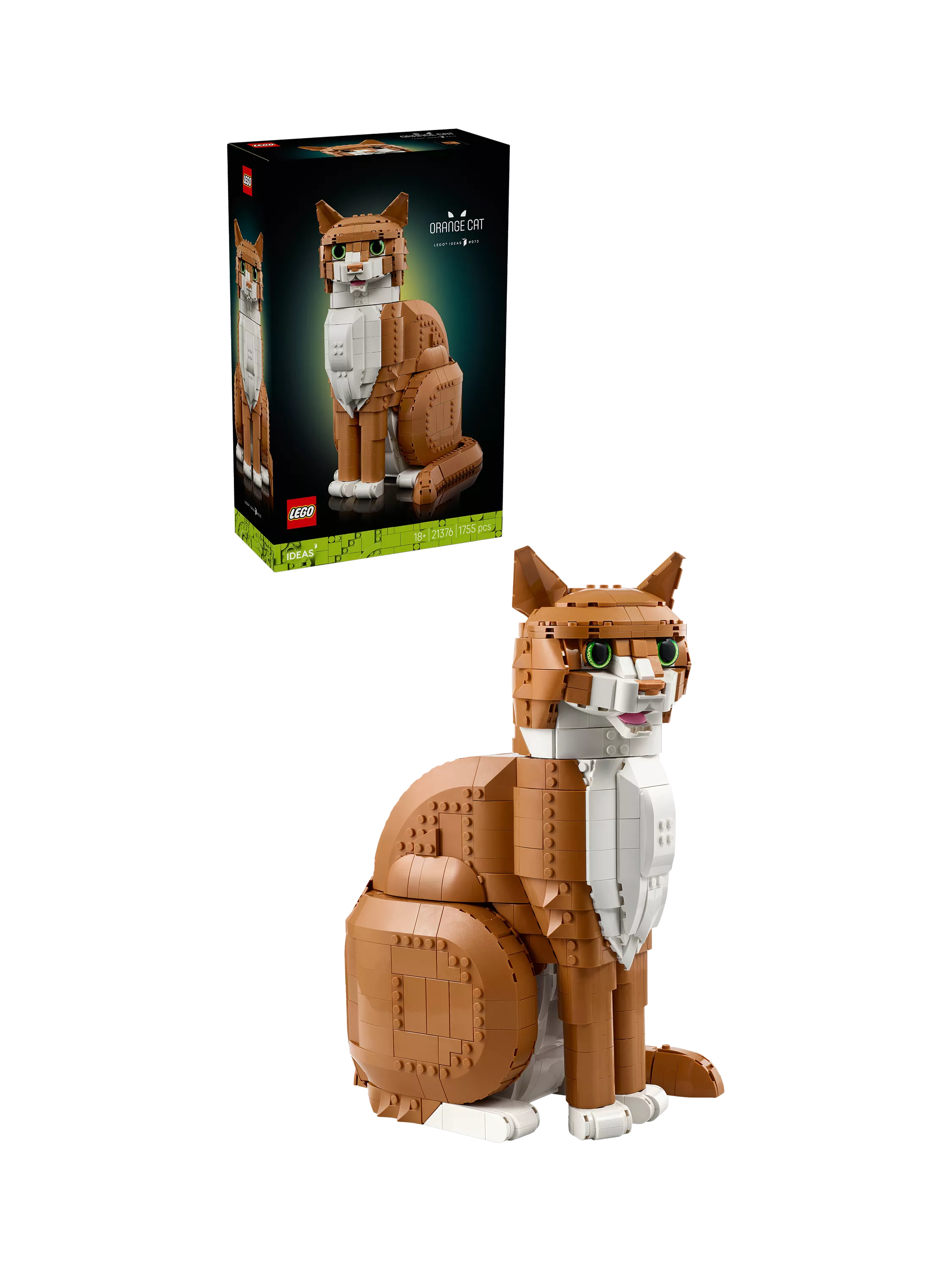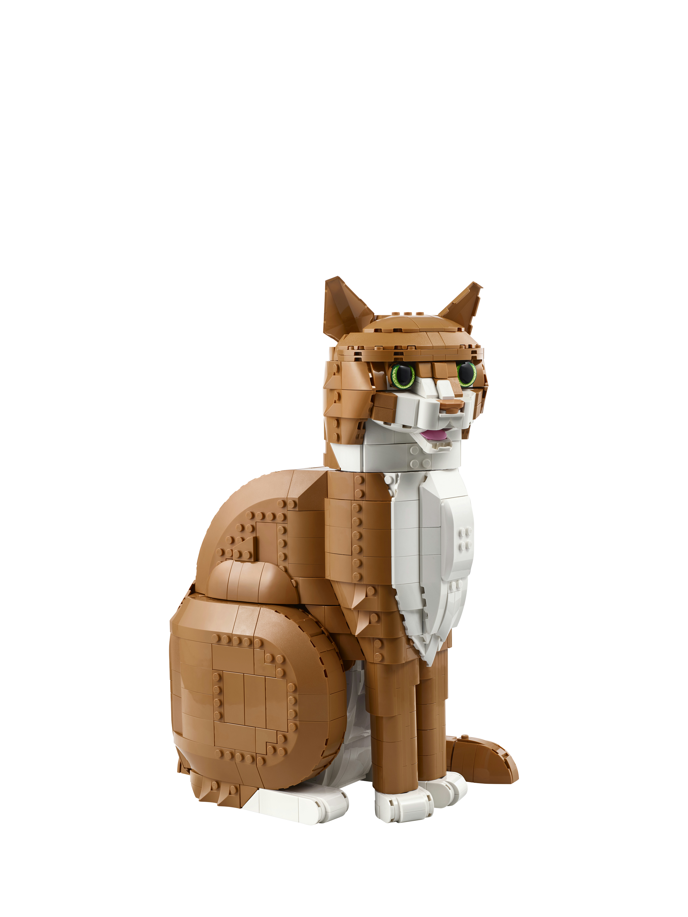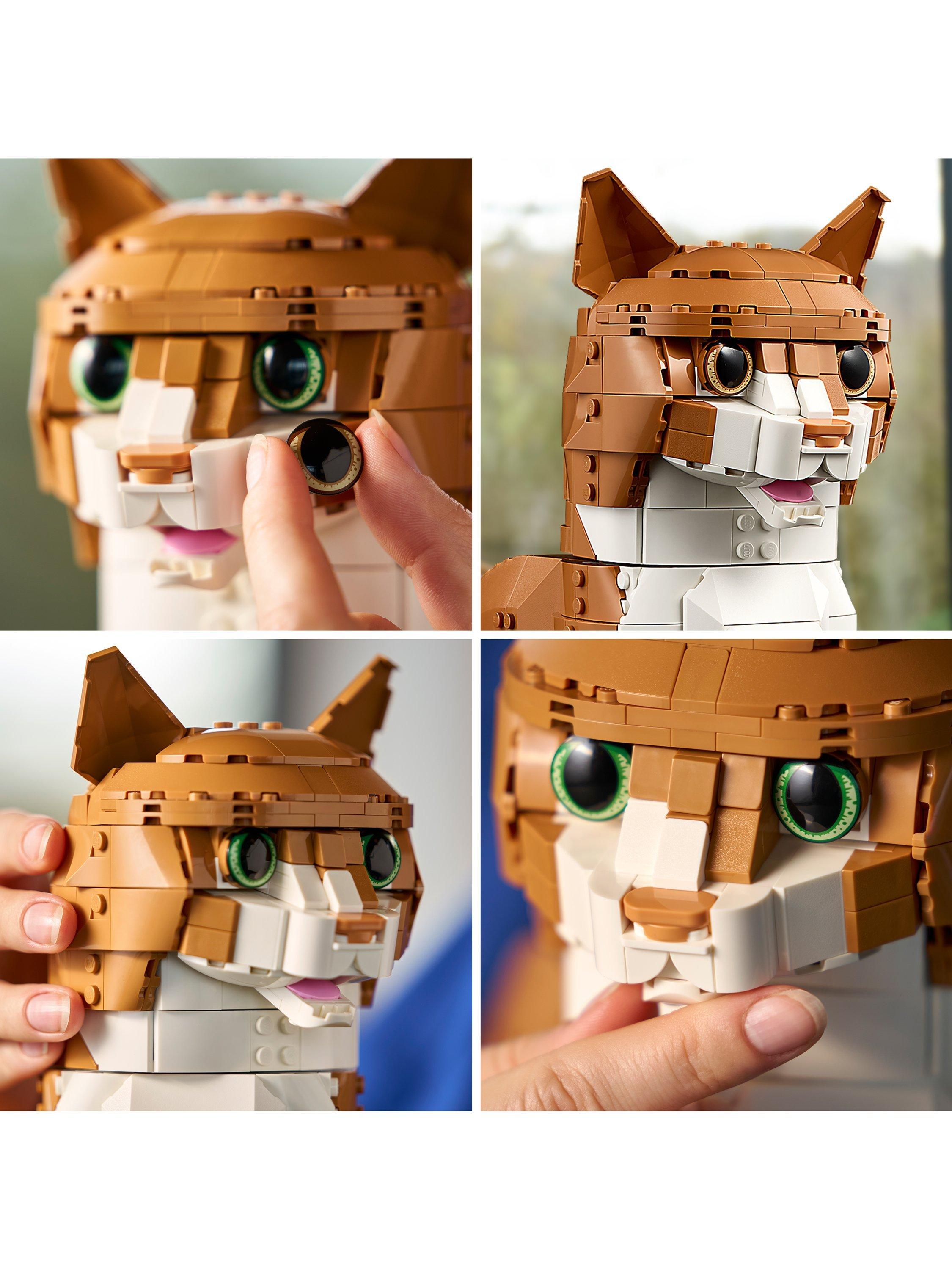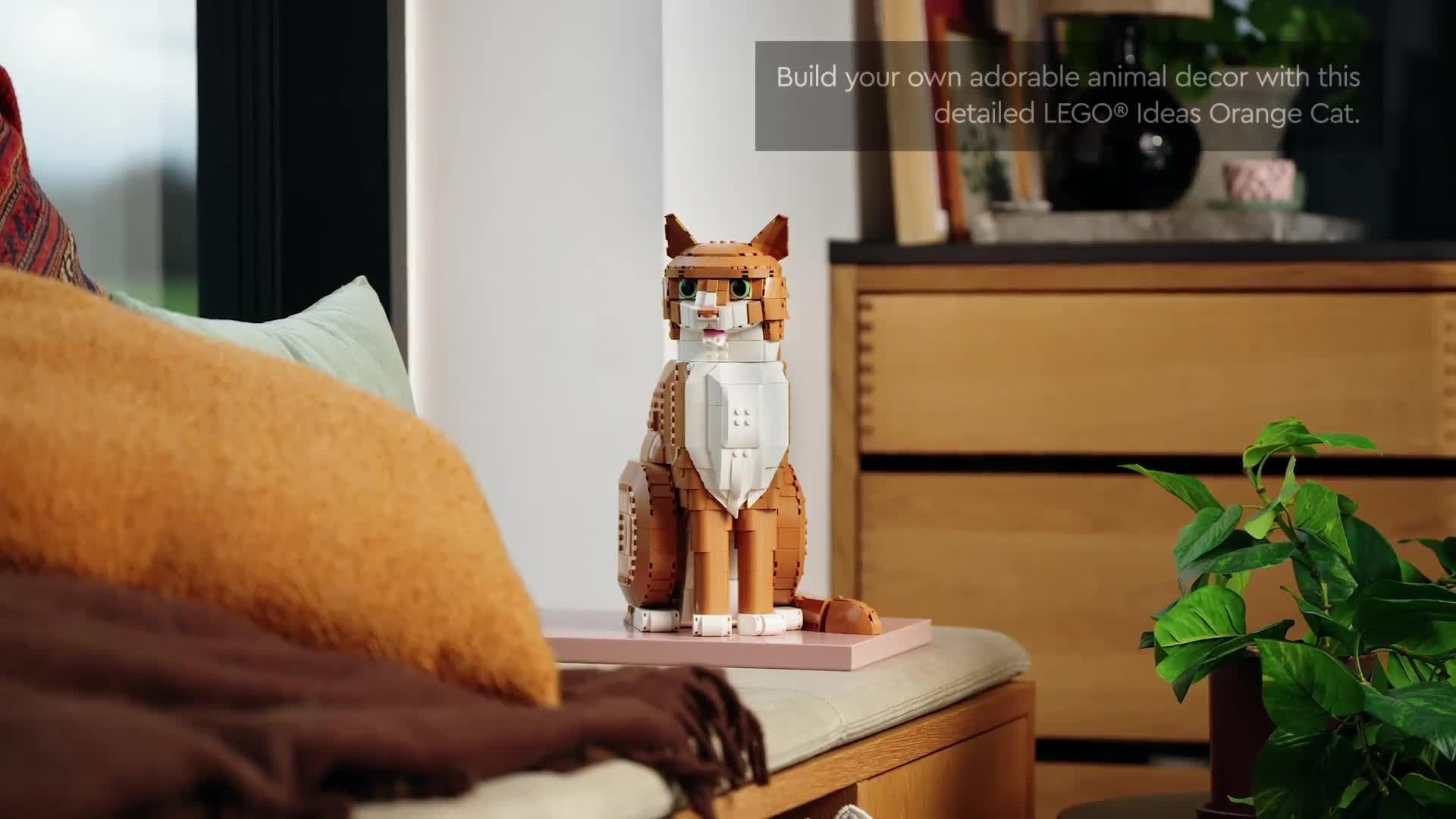 This lifelike, posable orange cat figure creates a playful piece for your home. Use LEGO bricks to capture the orange cat's distinctive look. Select green or brown eyes and pose the head, mouth, ears, paws and tail. It's a suitable feline companion for Tuxedo Cat (21349), sold separately. A great gift for cat lovers, cat owners and any lovers of animals, nature, art or design.