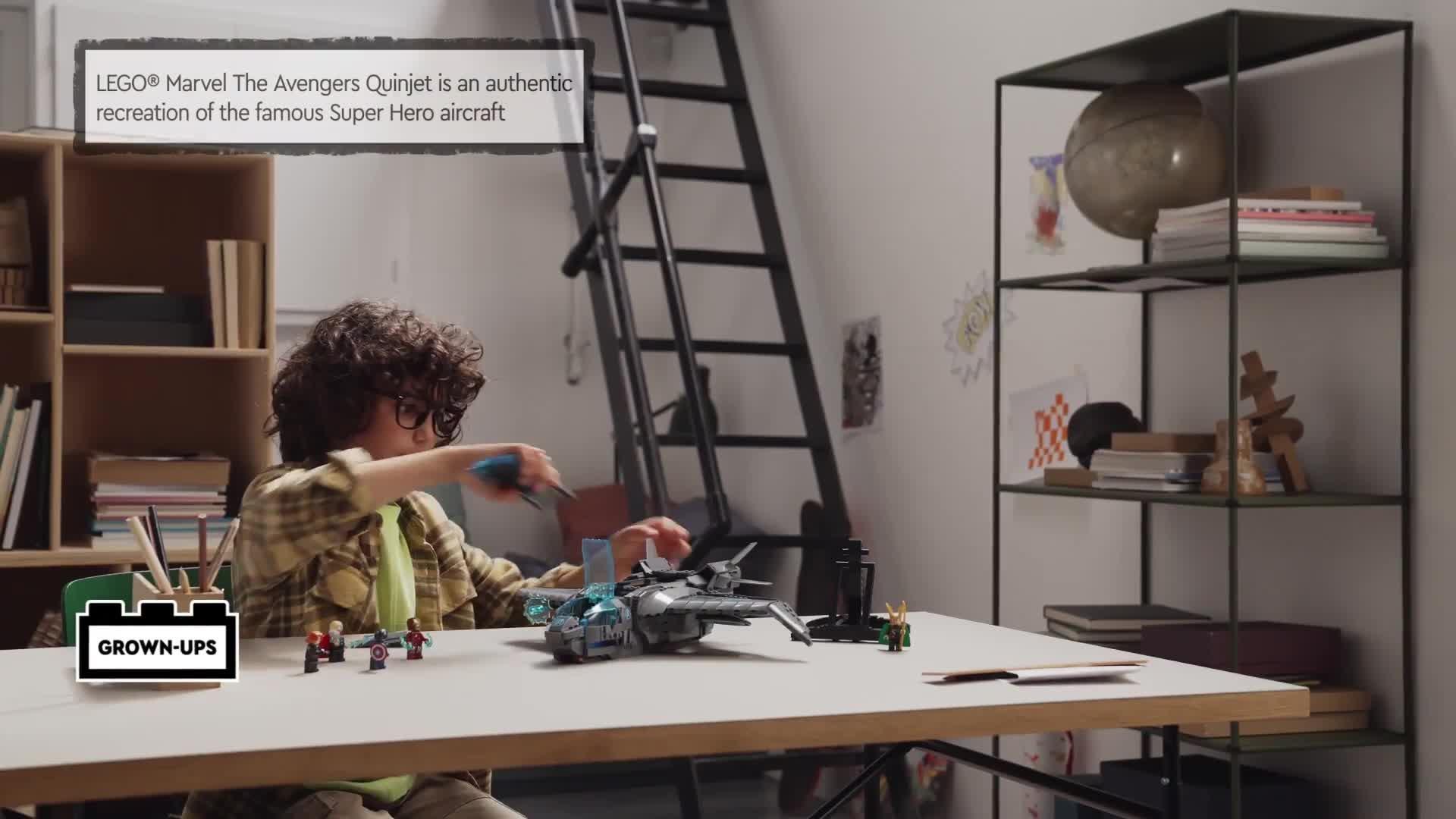 Speed through space aboard the Quinjet for endless Avengers adventures! Open the top section and place Black Widow, Thor, Iron Man and Captain America in their seats, while Loki sneaks in through a rear entrance. Fold the wheels up into the base and adjust the wing position ready for high-speed Super Hero action!