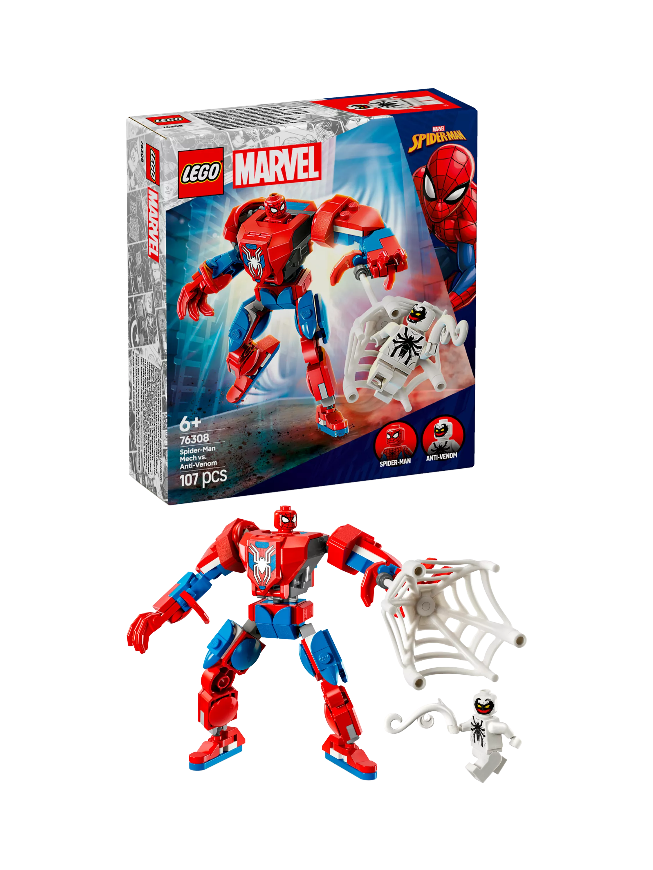 Spider-Man Mech vs. Anti-Venom (76308) is a fun LEGO Marvel building toy for 6 plus year old boys, girls and kids who love mechs, minifigures and Marvel-movie action. This premium-quality LEGO Marvel set will put endless imaginative adventures with a fully jointed buildable Spider-Man figure into the hands of young Super Heroes. This Spider-Man building toy set comes with 2 LEGO Marvel minifigures: Spider-Man, and Anti-Venom with his tentacled hands.
