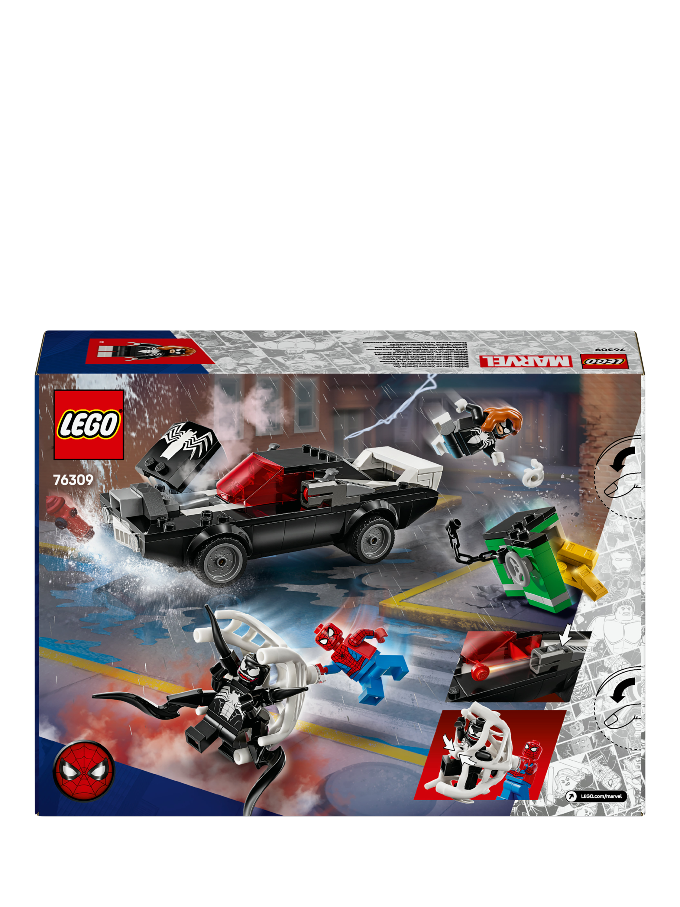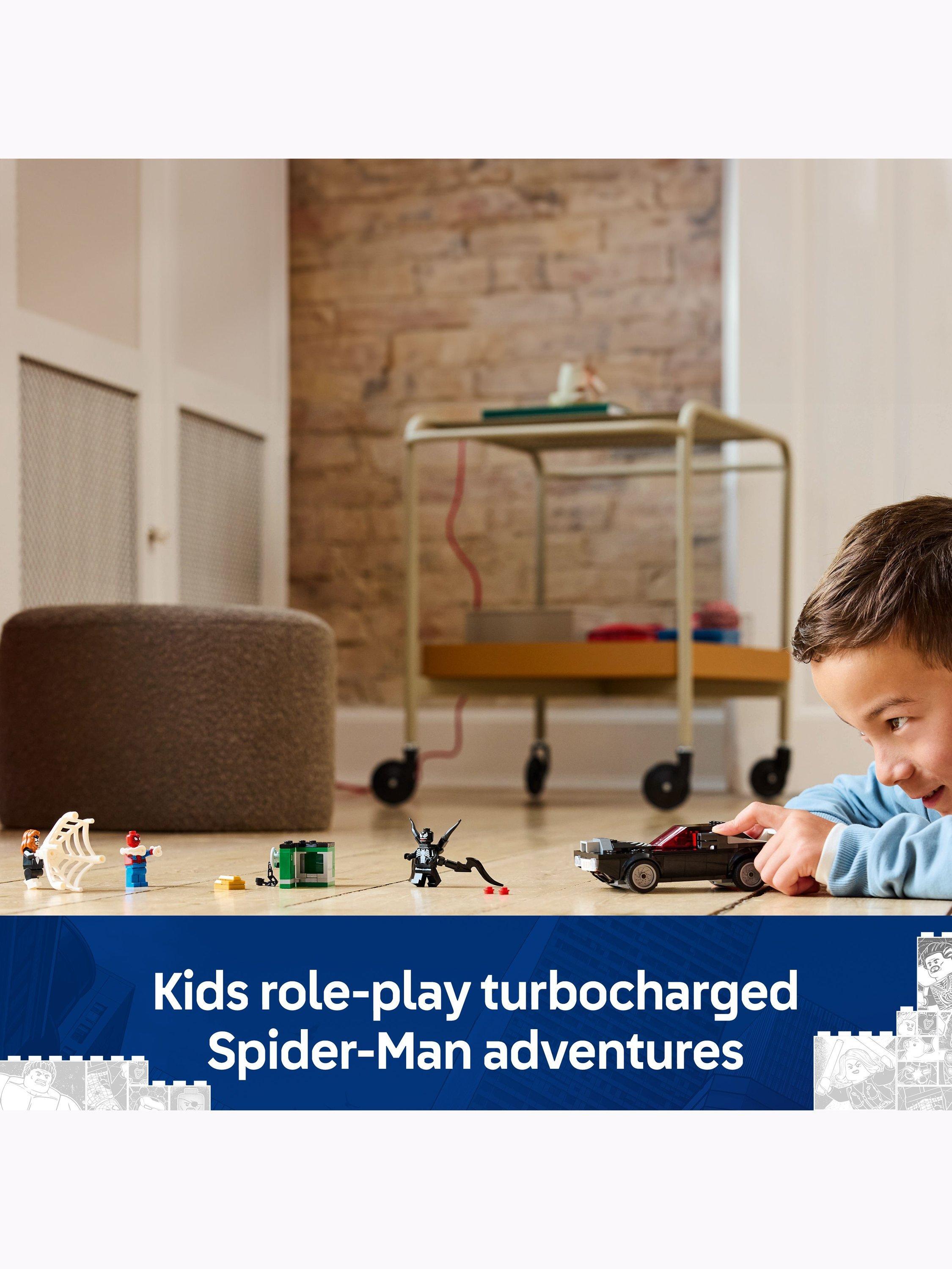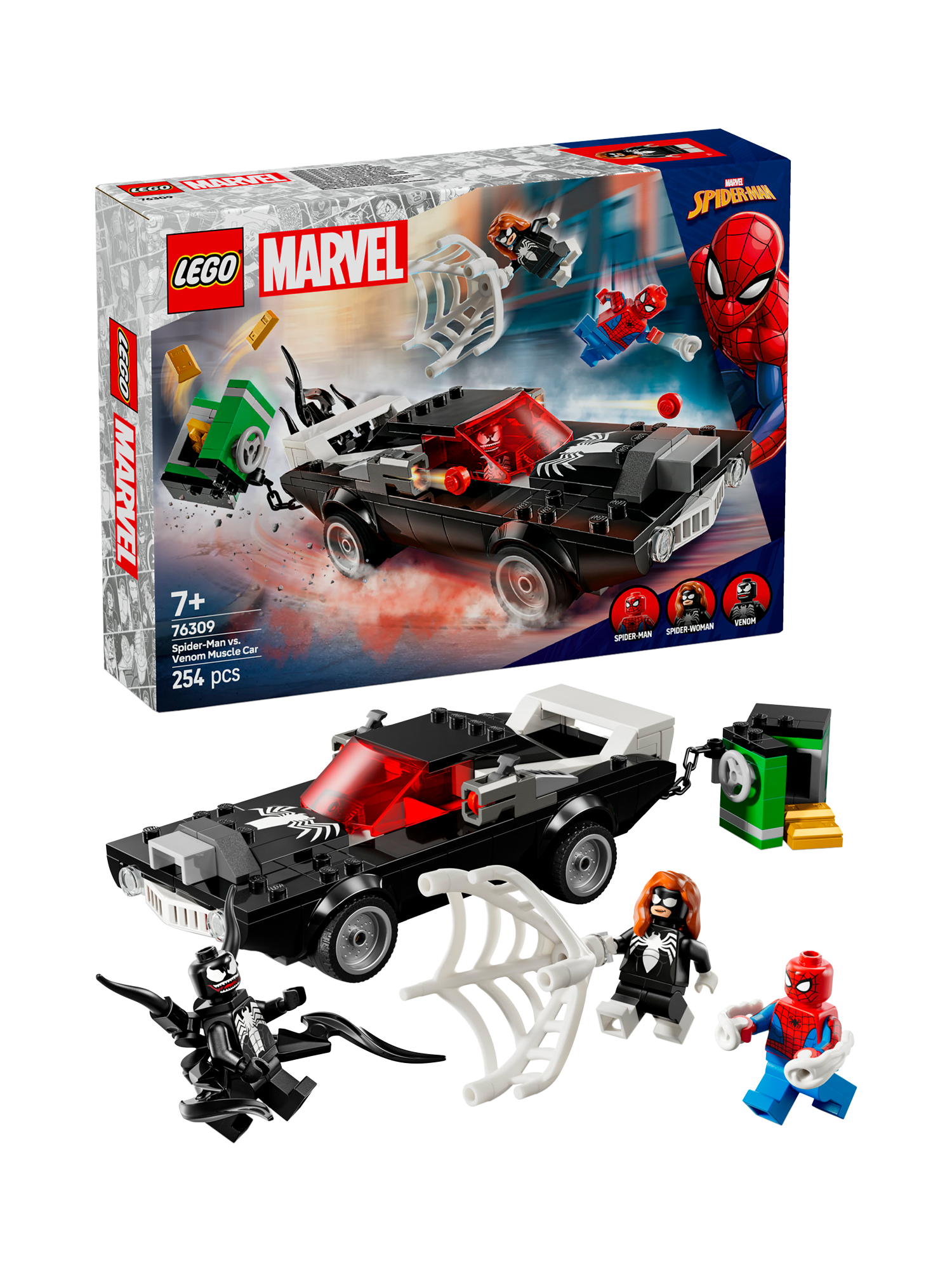 LEGO Marvel Spider-Man vs. Venom Muscle Car (76309) is a high-quality, buildable toy-car playset for 7 plus year old boys and girls. This build-and-play LEGO Marvel set is ideal for young Super Heroes, especially Marvel fans and kids who enjoy hands-on adventure toys. The buildable Venom car toy comes with 3 LEGO Marvel minifigures: Spider-Man with a web blaster, Venom with 4 tentacles and Spider-Woman (Julia Carpenter) with a flexible web that is large enough to ensnare a villain.