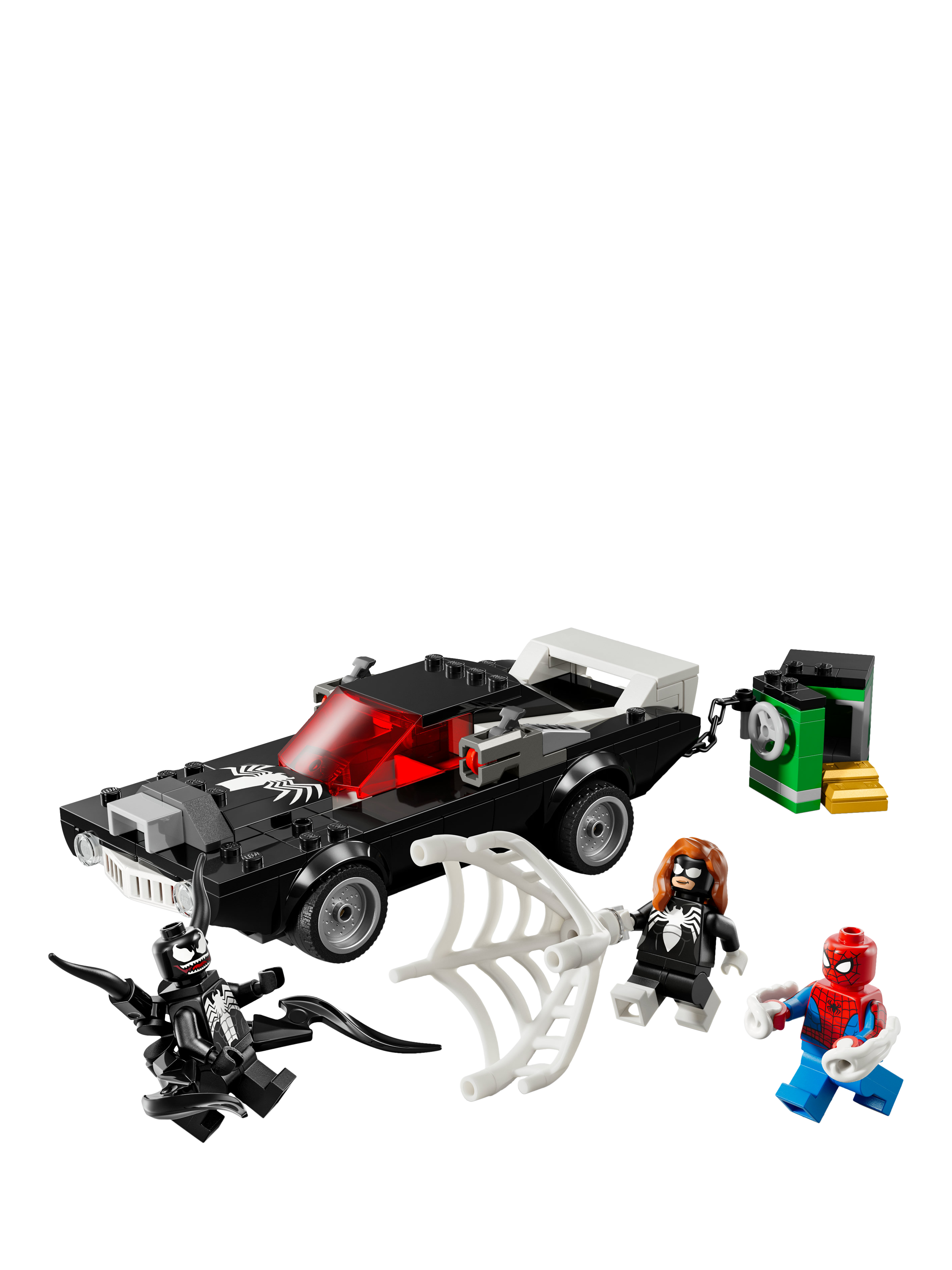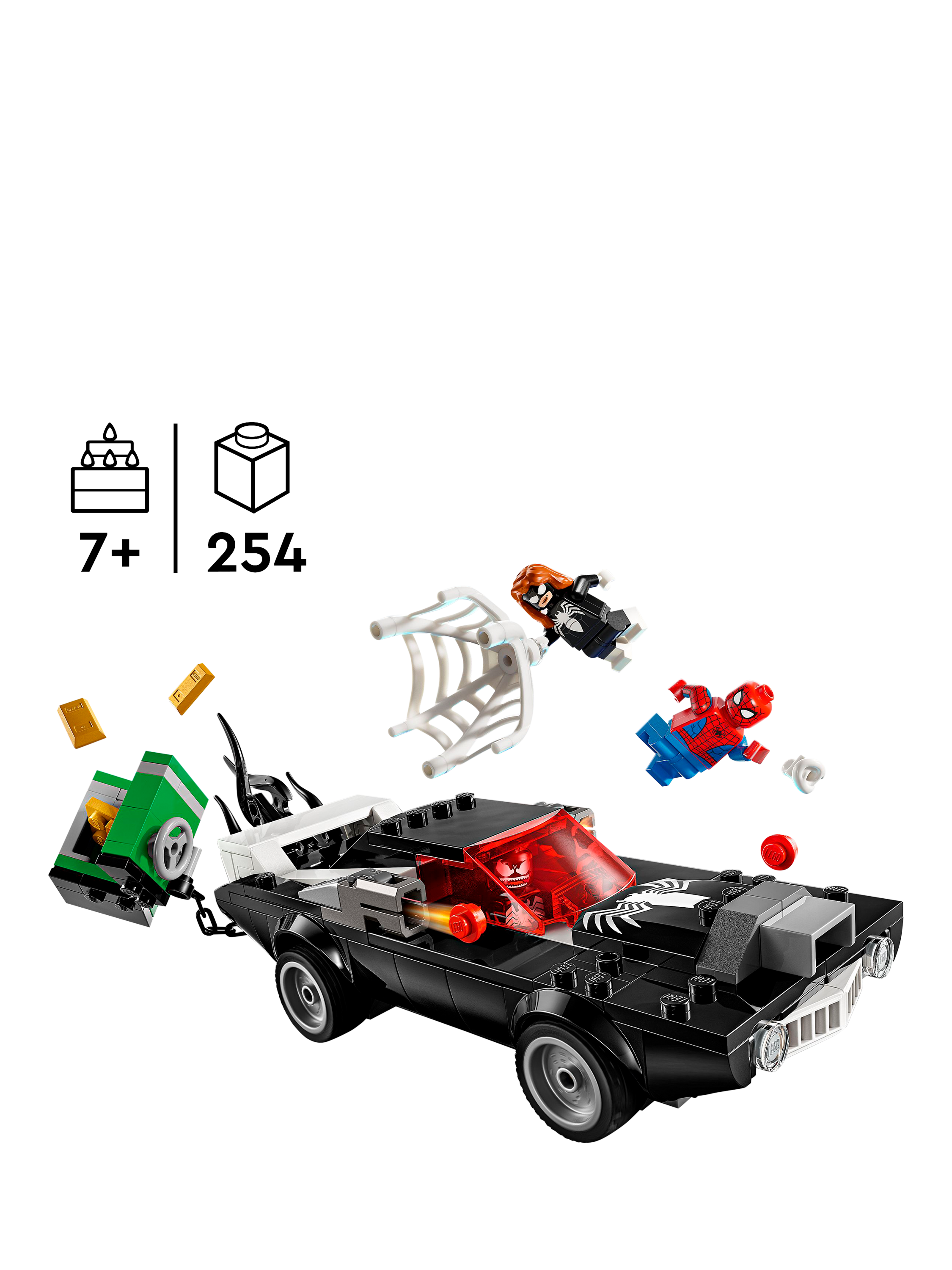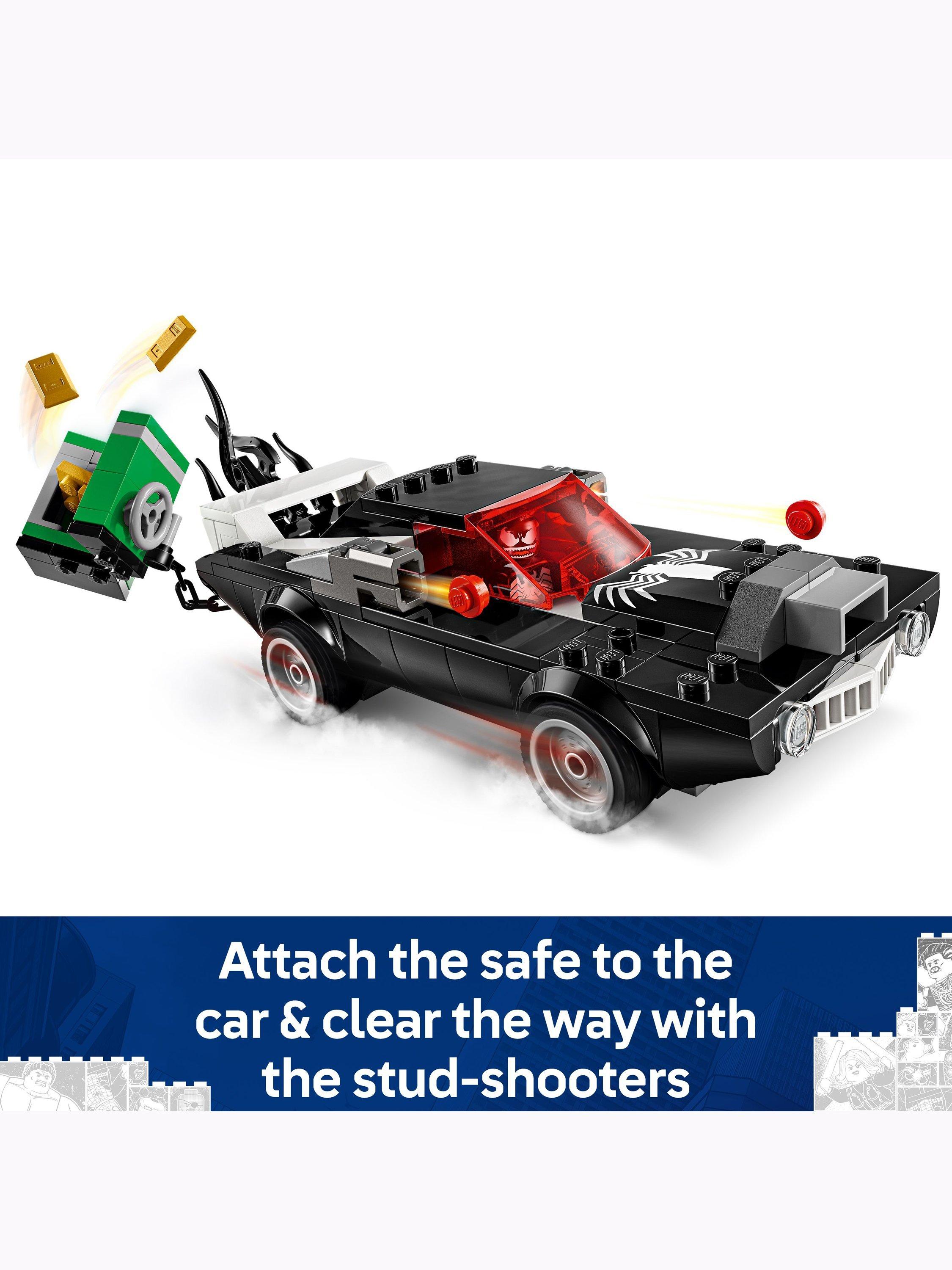 The Venomized car features a shooter on each side, an accessible engine and an opening cockpit. Venom can sit inside the car by removing his 2 lower tentacles, which can be used to further Venomize the car. The buildable Super-Hero toy also includes a safe containing gold bars to inspire role-play action between the heroes and villain. The safe can be dragged away by the car, which also includes a compartment for the gold bars.