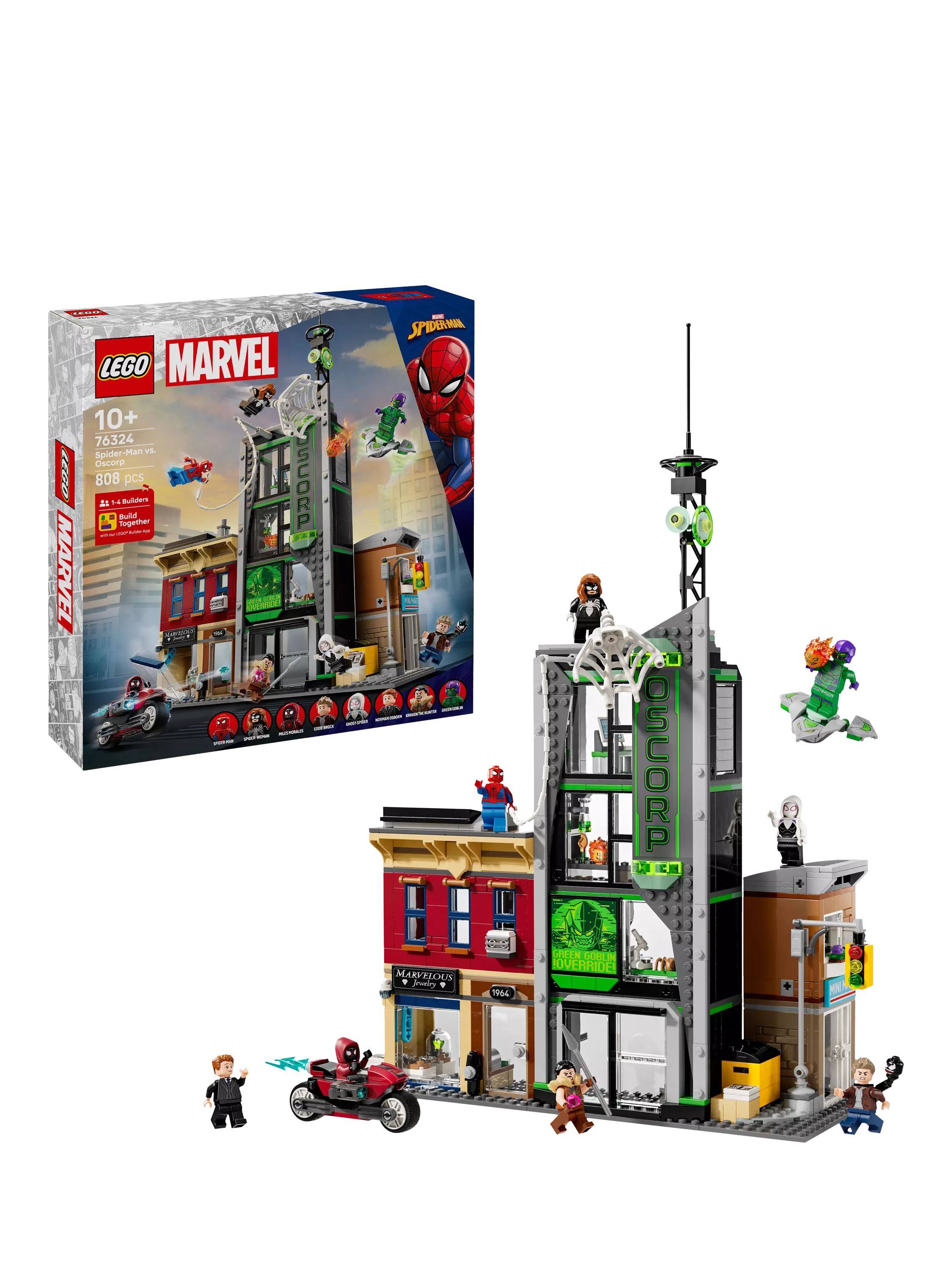 The LEGO Marvel Spider-Man vs. Oscorp (76324) building toy for kids aged 10 and over is a fun build-play-and-display set that's bursting with Super Hero action, iconic characters, and famous locations.