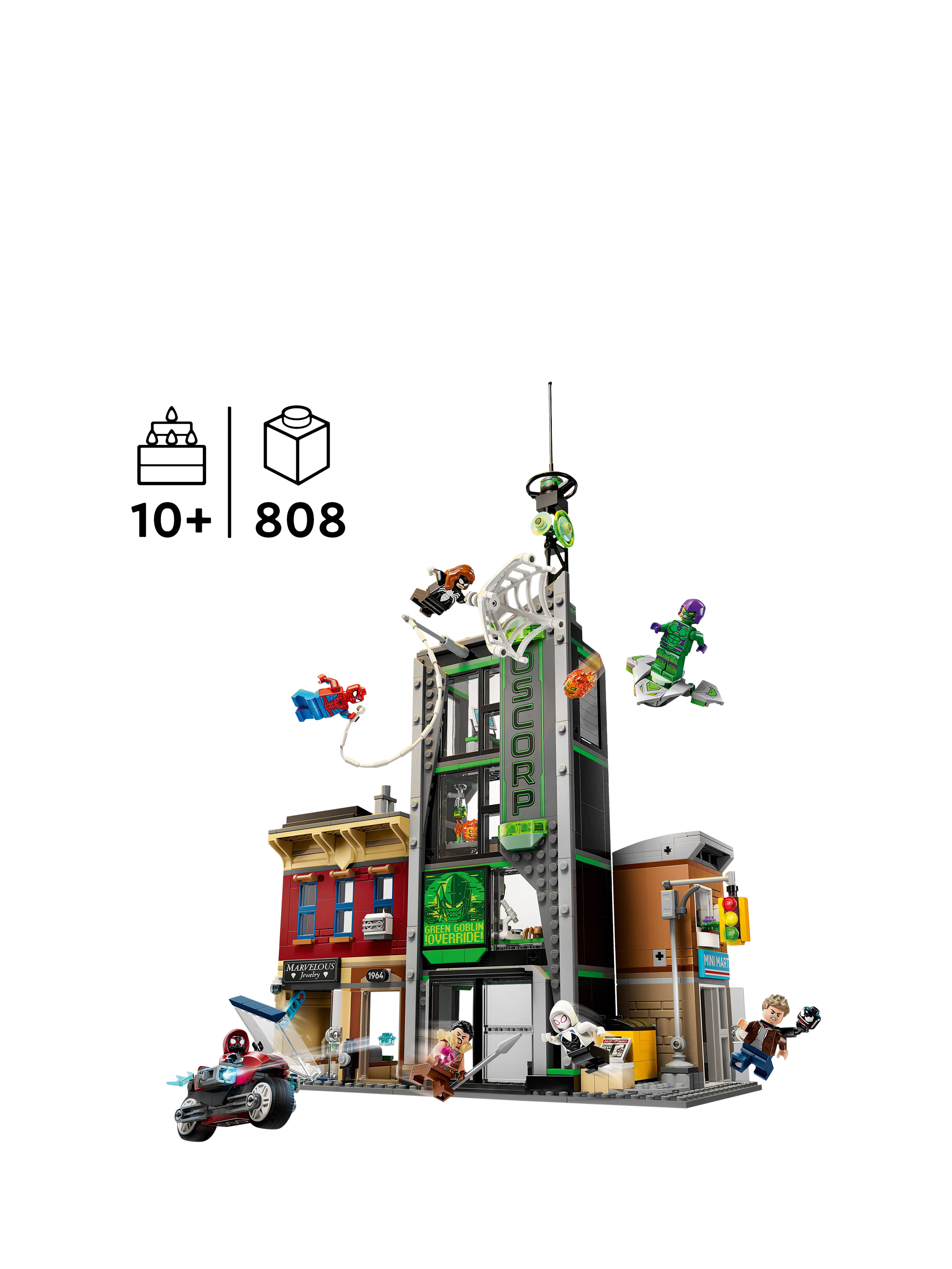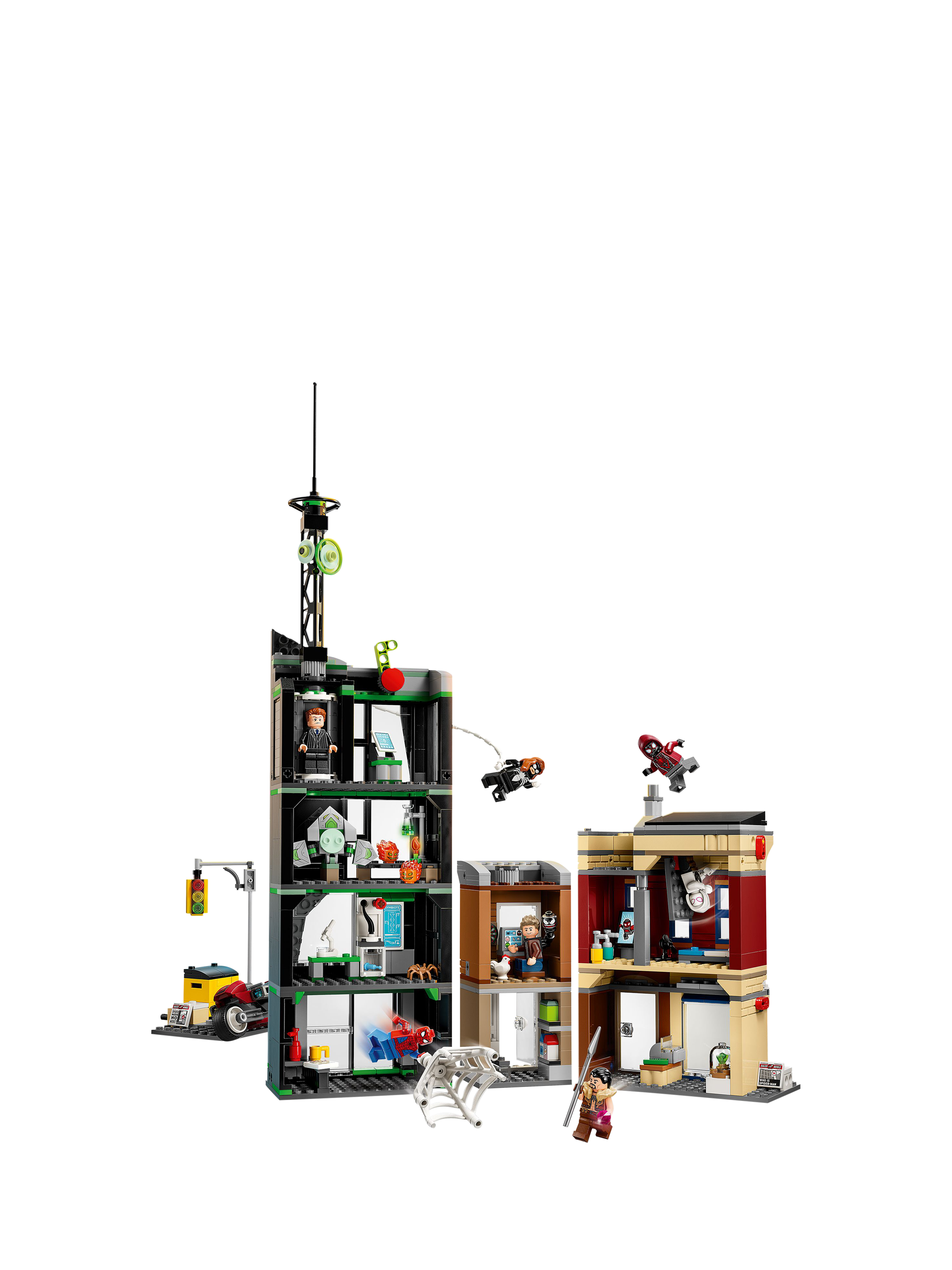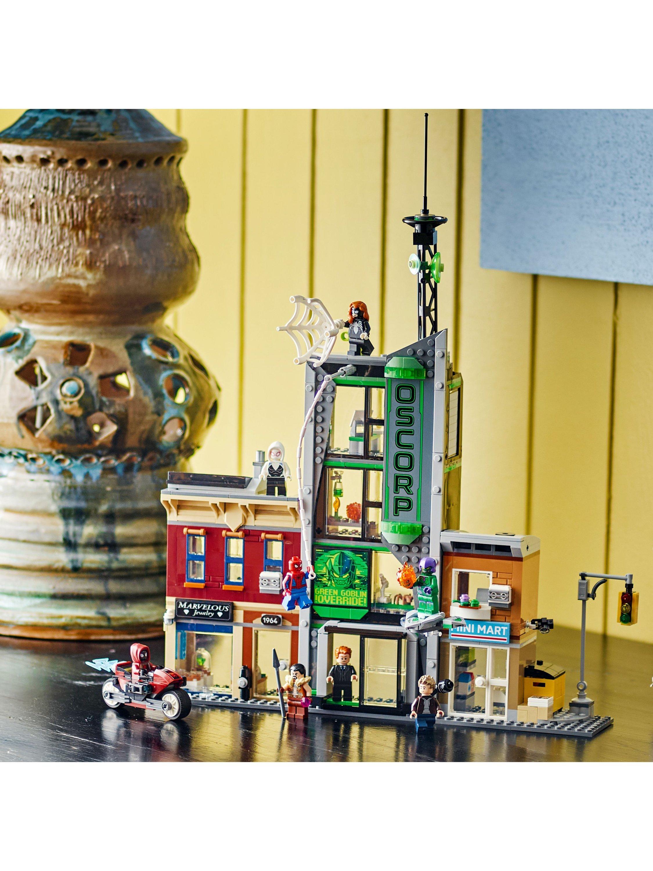 The street scene in this LEGO Marvel set comprises three separate buildings: Miles Morales's apartment with a jewellery shop underneath, the Oscorp building, and Venom's apartment with a newsagent below. Each room is furnished with relevant equipment and accessories.