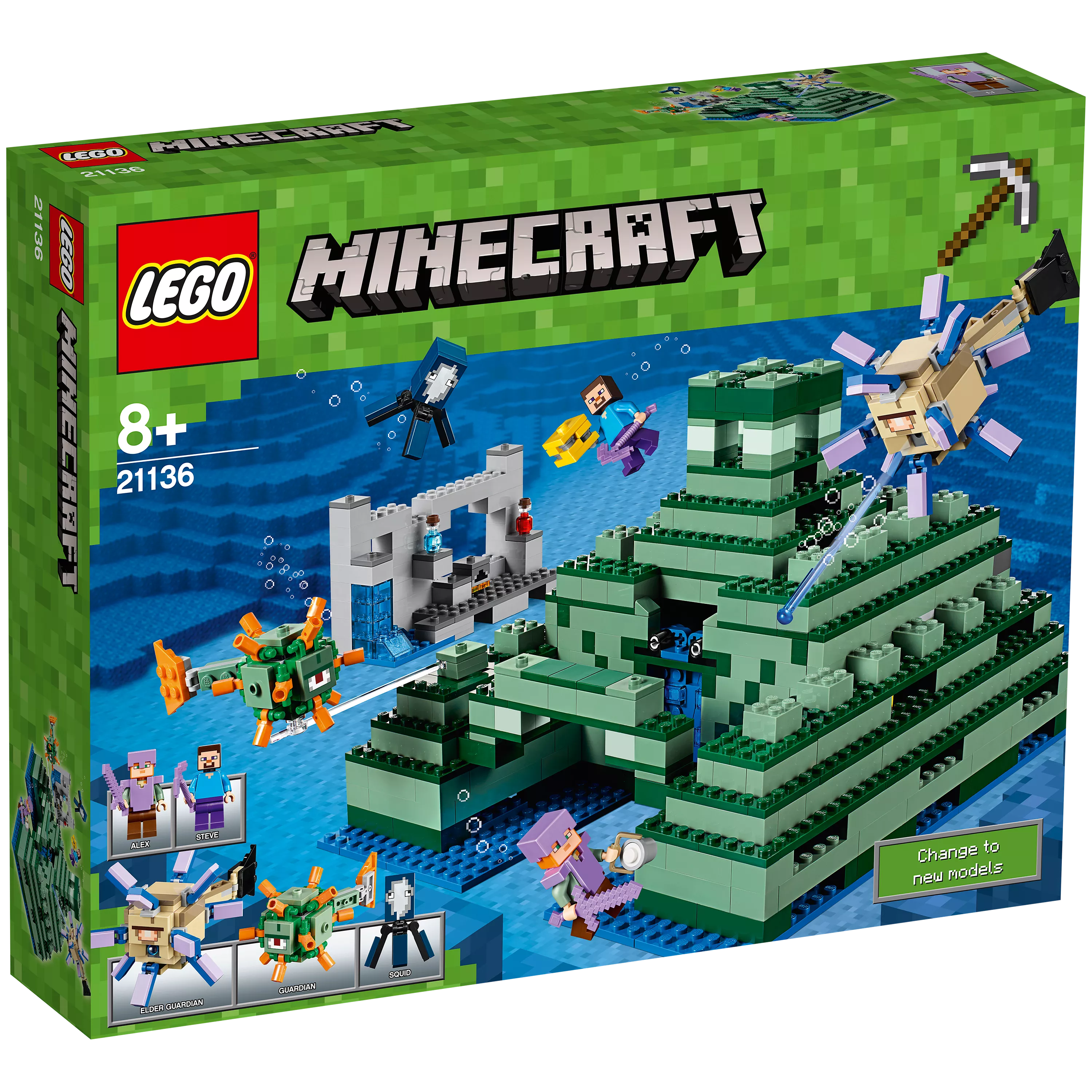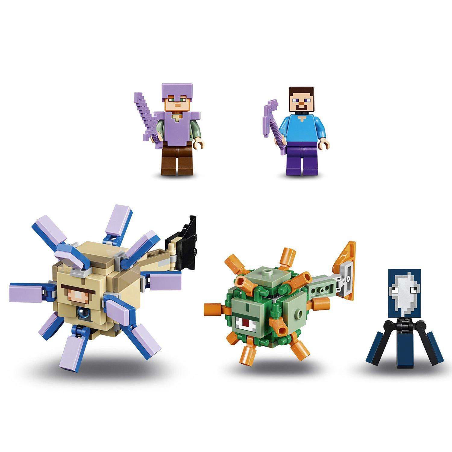Includes 2 minifigures: Steve and Alex, plus squid, guardian and elder guardian figures.