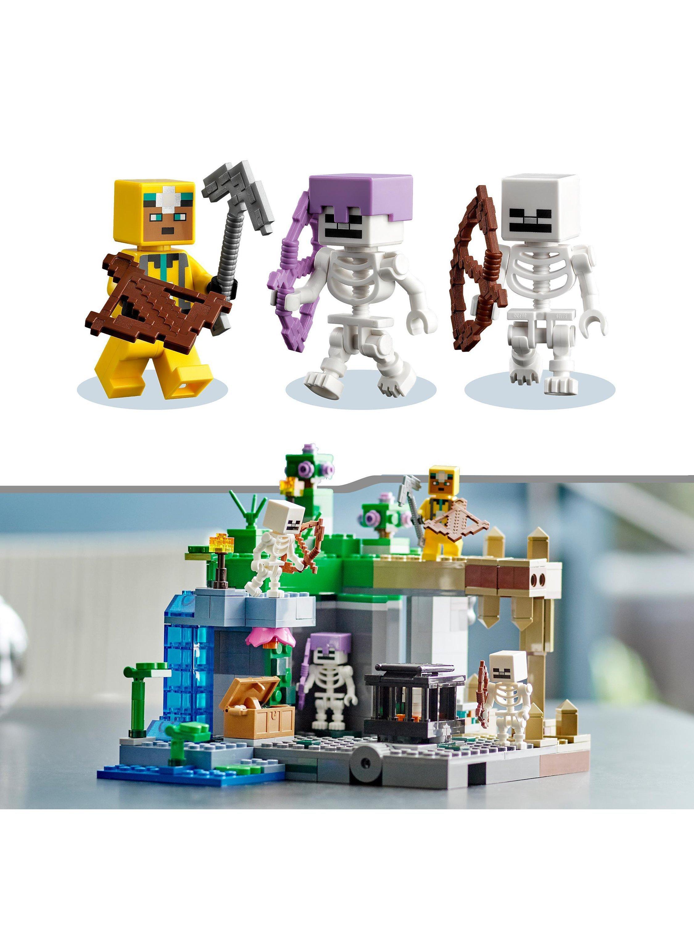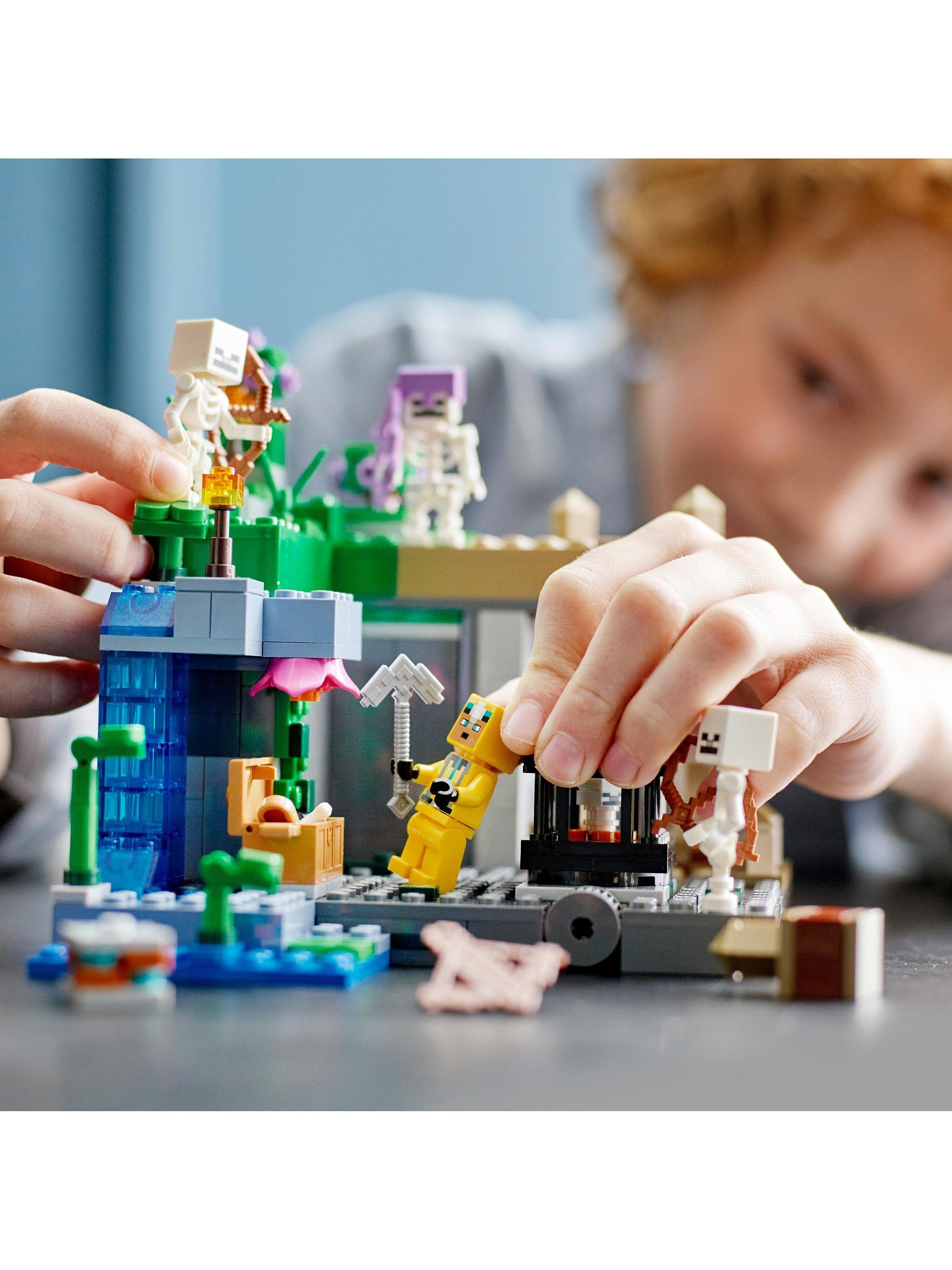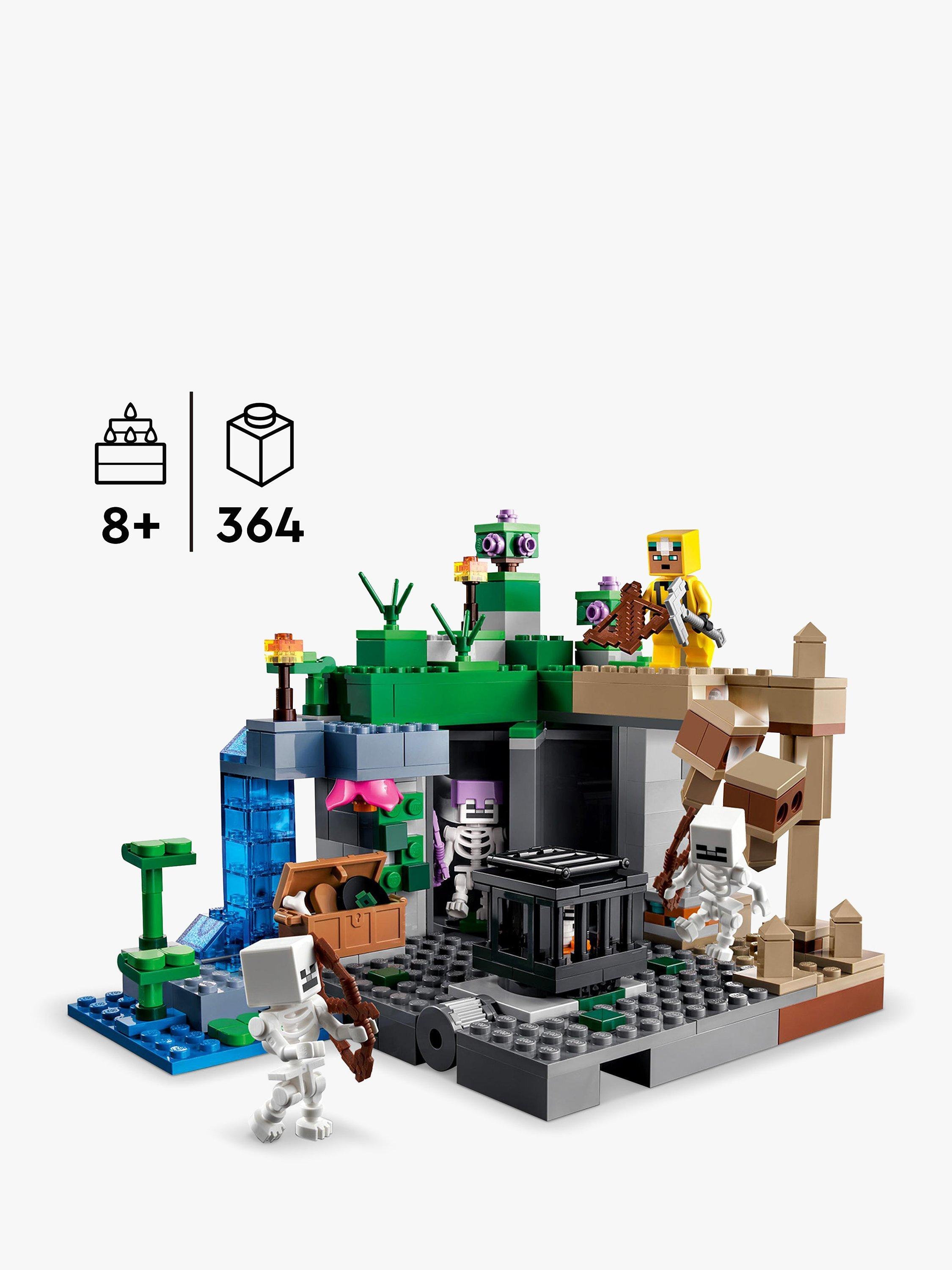 - Includes 364 bricks and includes a cave explorer, 3 skeletons and 3 biomes: a dripstone cave with a rock-fall function; a lush cave with bushes, clay and torches; and a dungeon with a skeleton spawner