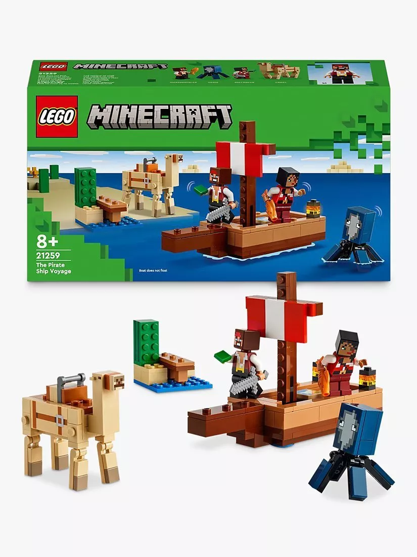 Board the ship with two LEGO® Minecraft® pirates and set sail for adventure in the Desert biome. What's that lurking in the water? It's a squid! Head for dry land, where you can consult the map, saddle up the camel and take a ride to your next epic Minecraft adventure.