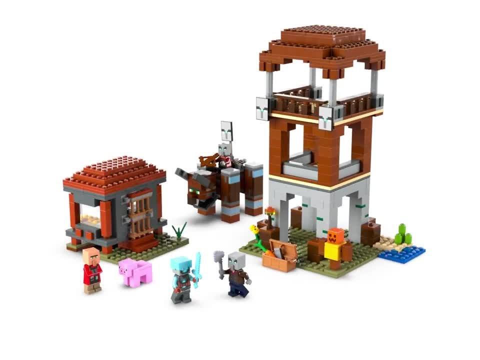The building set includes four LEGO Minecraft figures: a Space Sentinel, Raid Captain, mason villager and a Vindicator. A buildable ravager figure has a lever-operated function that lets kids make jaw-snapping and head-butting movements. A watchtower includes ladders to provide access between the three floors, banners showing pillager faces and a chest of precious loot. The mason's house has an opening door and a furnished interior with a bed and a stonecutter.