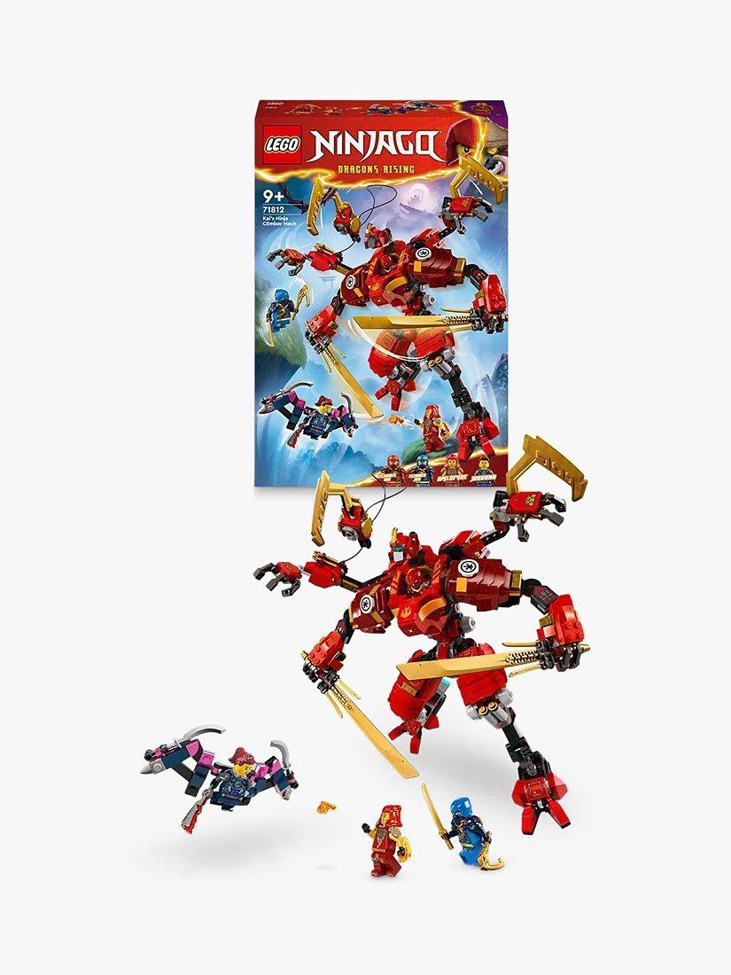 Jump into the action with Kai's Ninja Climber Mech as you swing between the trees high up in the Shadow Forest. Climber Kai is in the cockpit, operating its hooks and 2 large katanas as he battles with the evil Jordana in her powerful glider! Both Climber Jay and Wyldfyre lend support but need to watch out for her katana! Can you help them triumph?