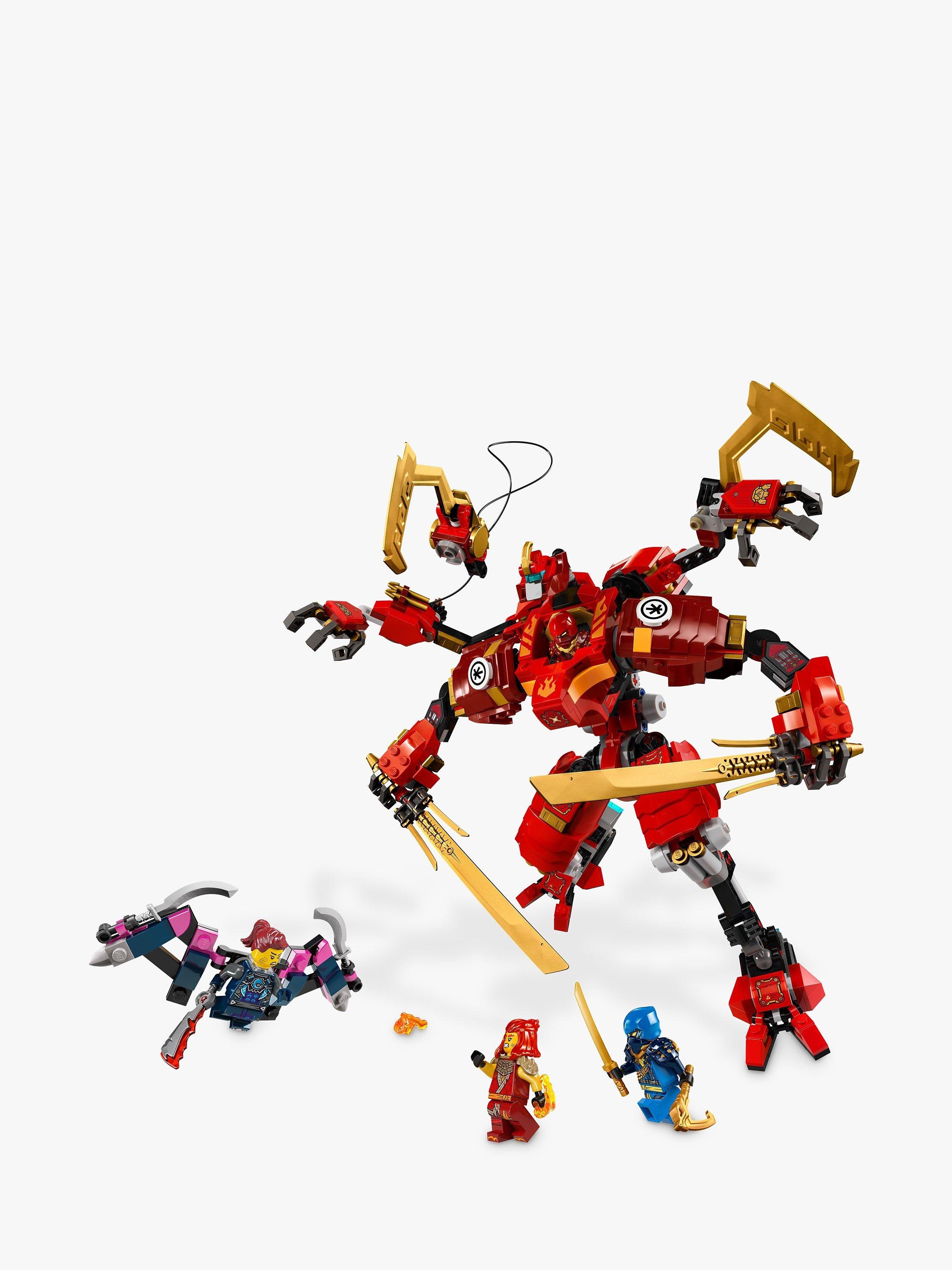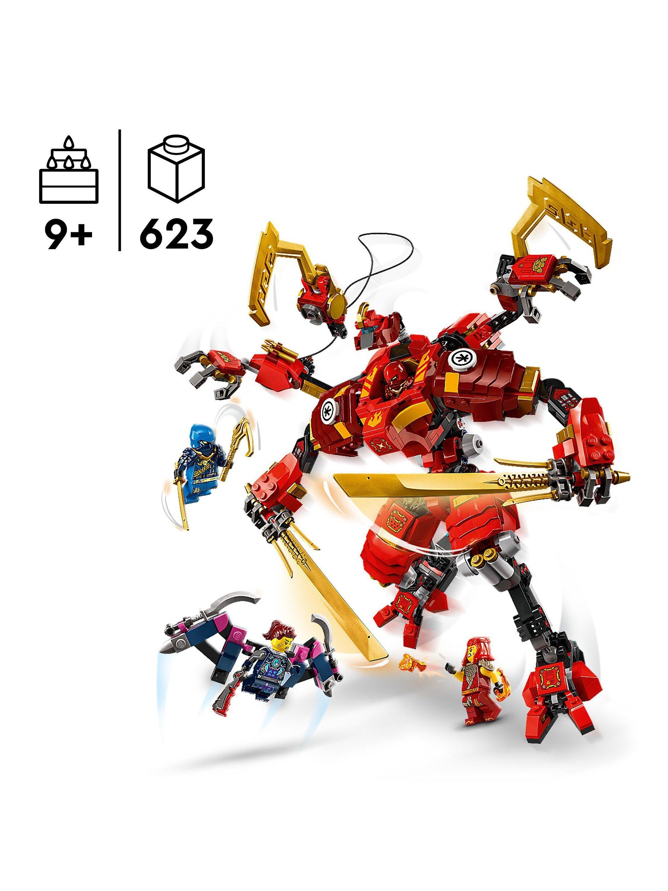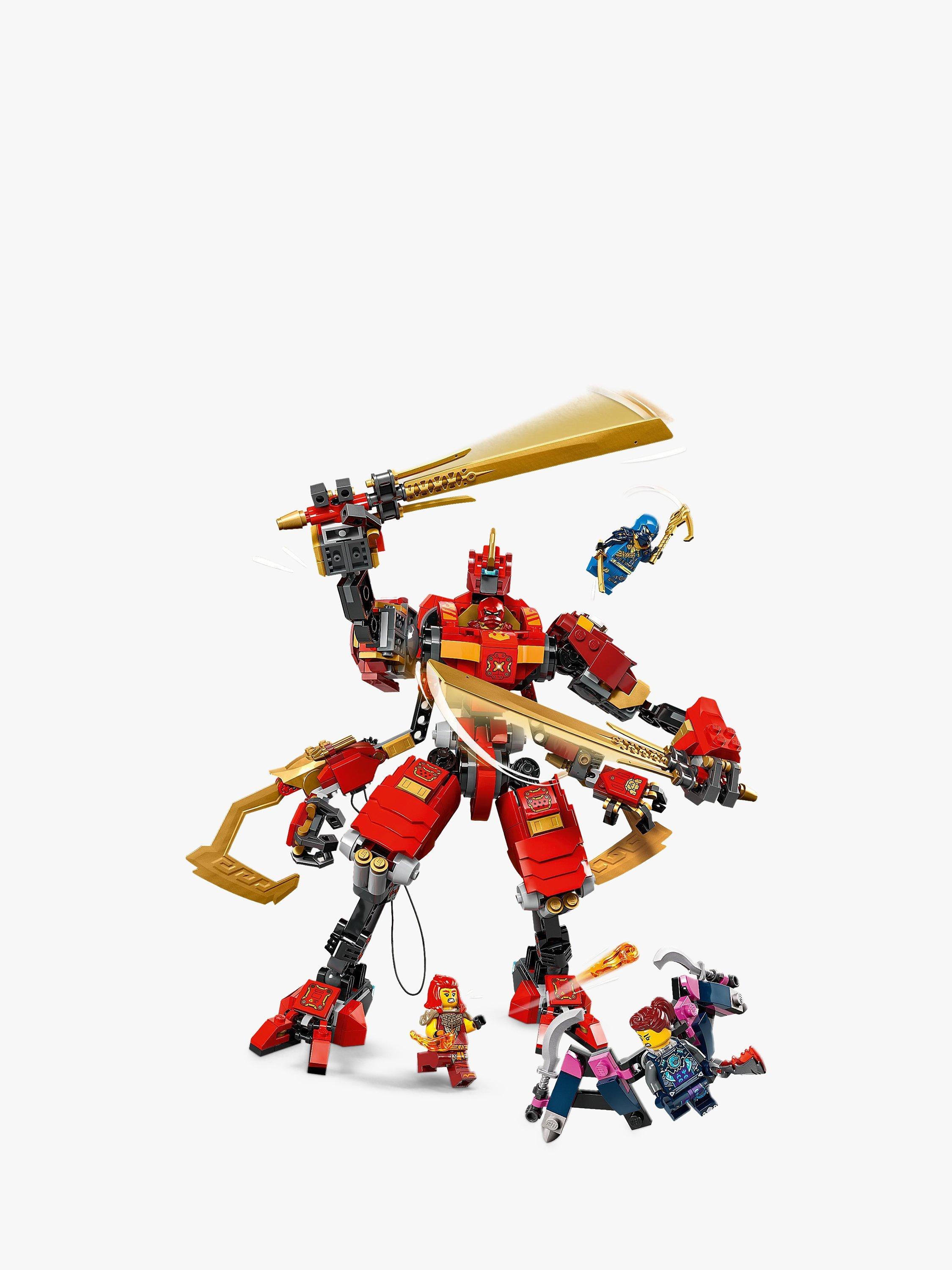 - Features a red Mech figure with 2 ninja hooks, posable arms, legs, torso, head and feet, 2 big katana sword accessories and a cockpit for a minifigure