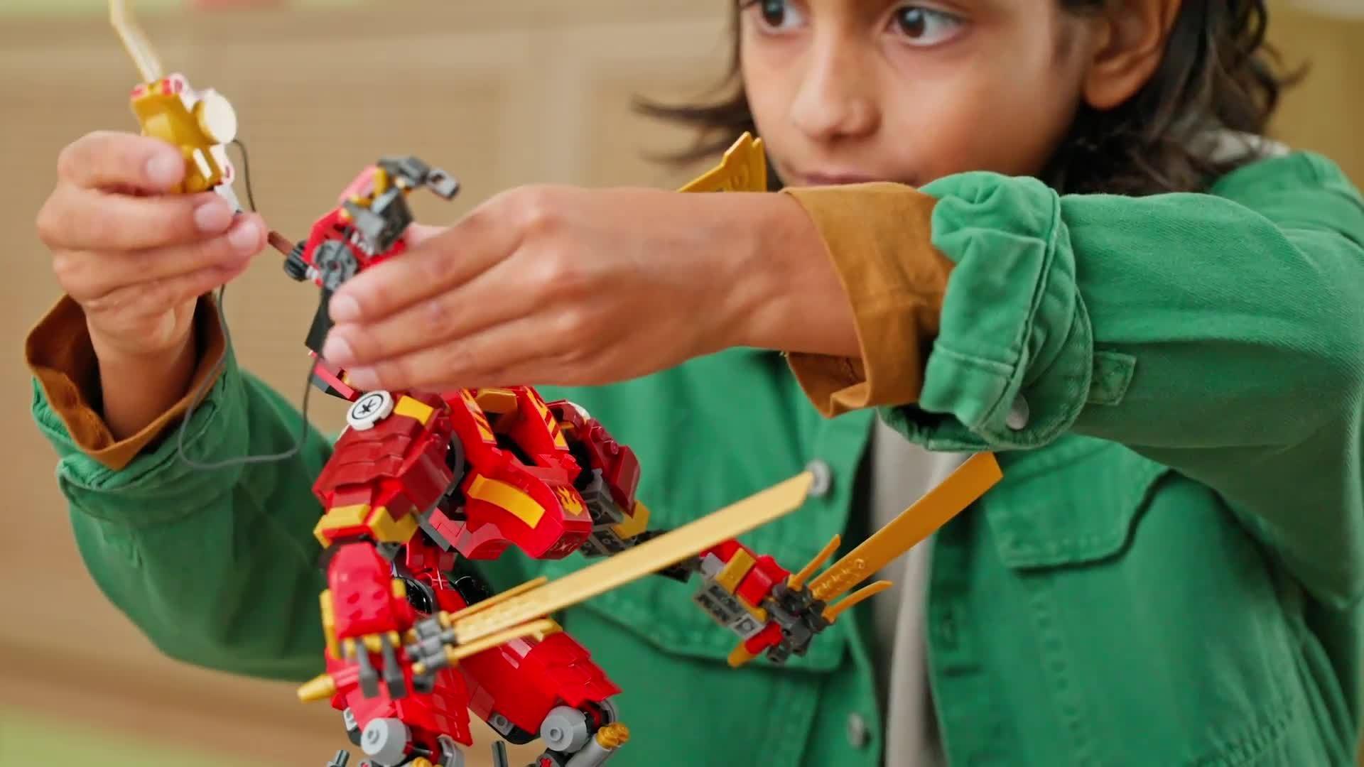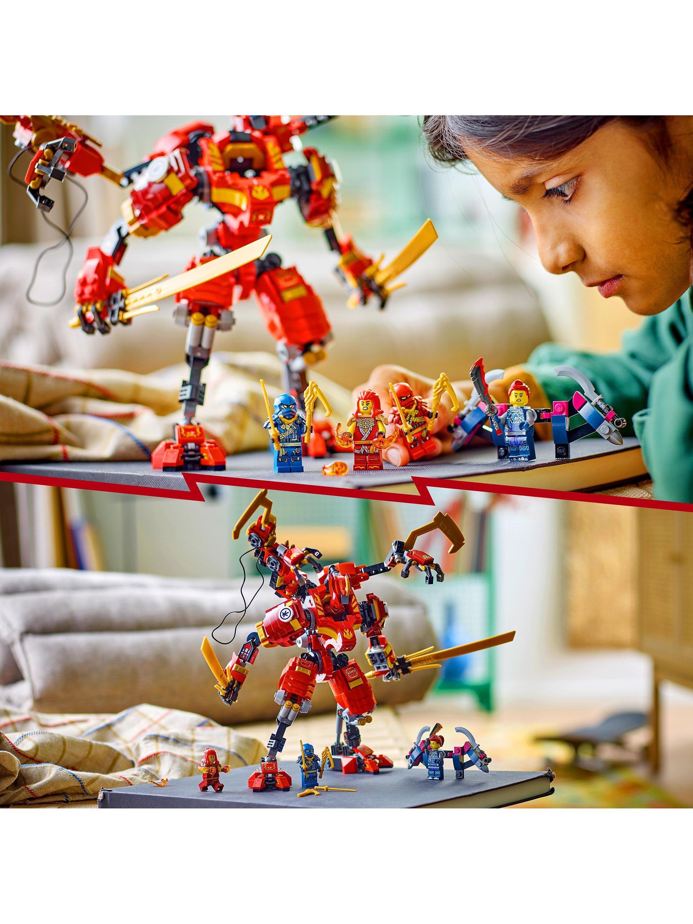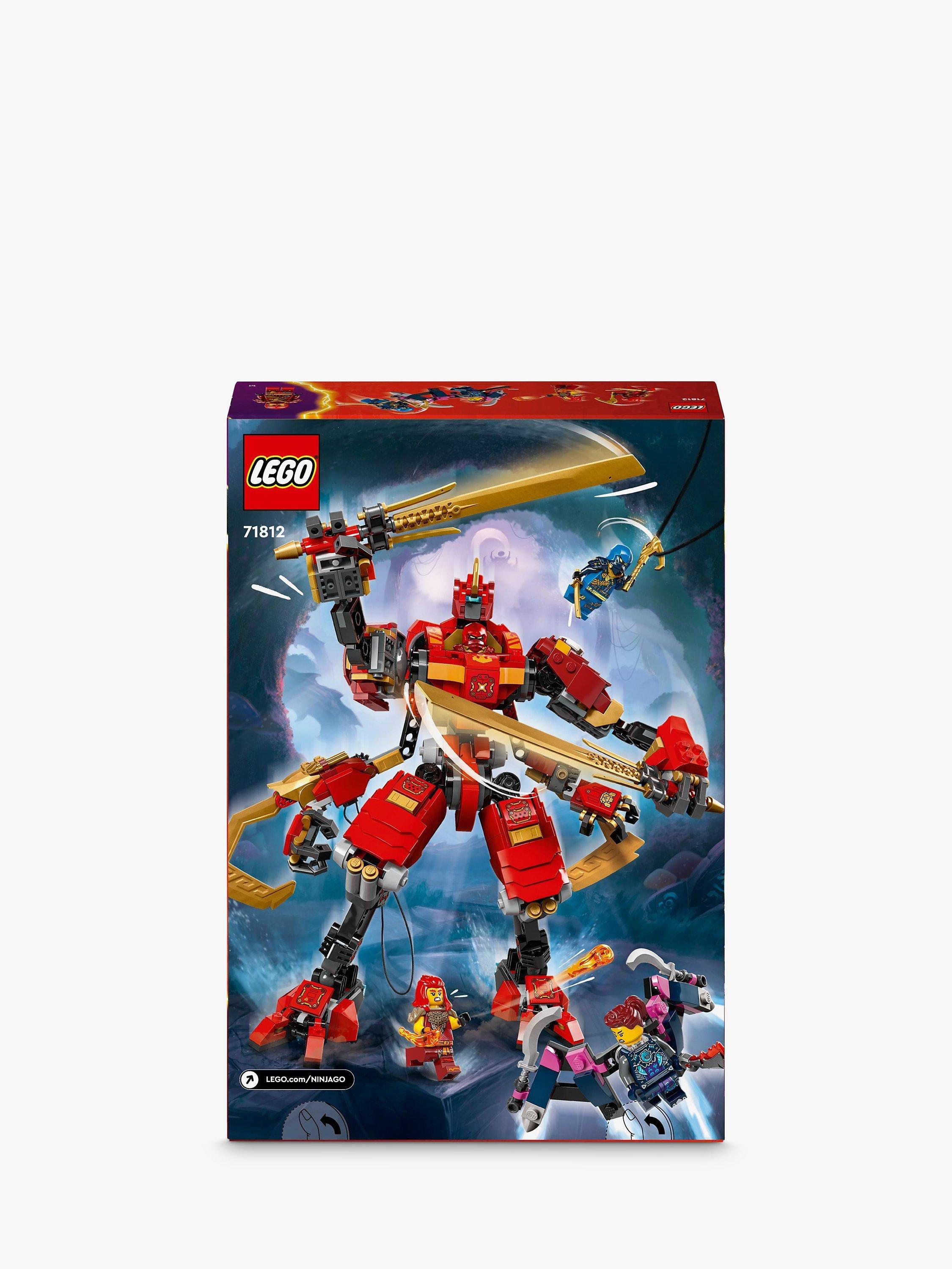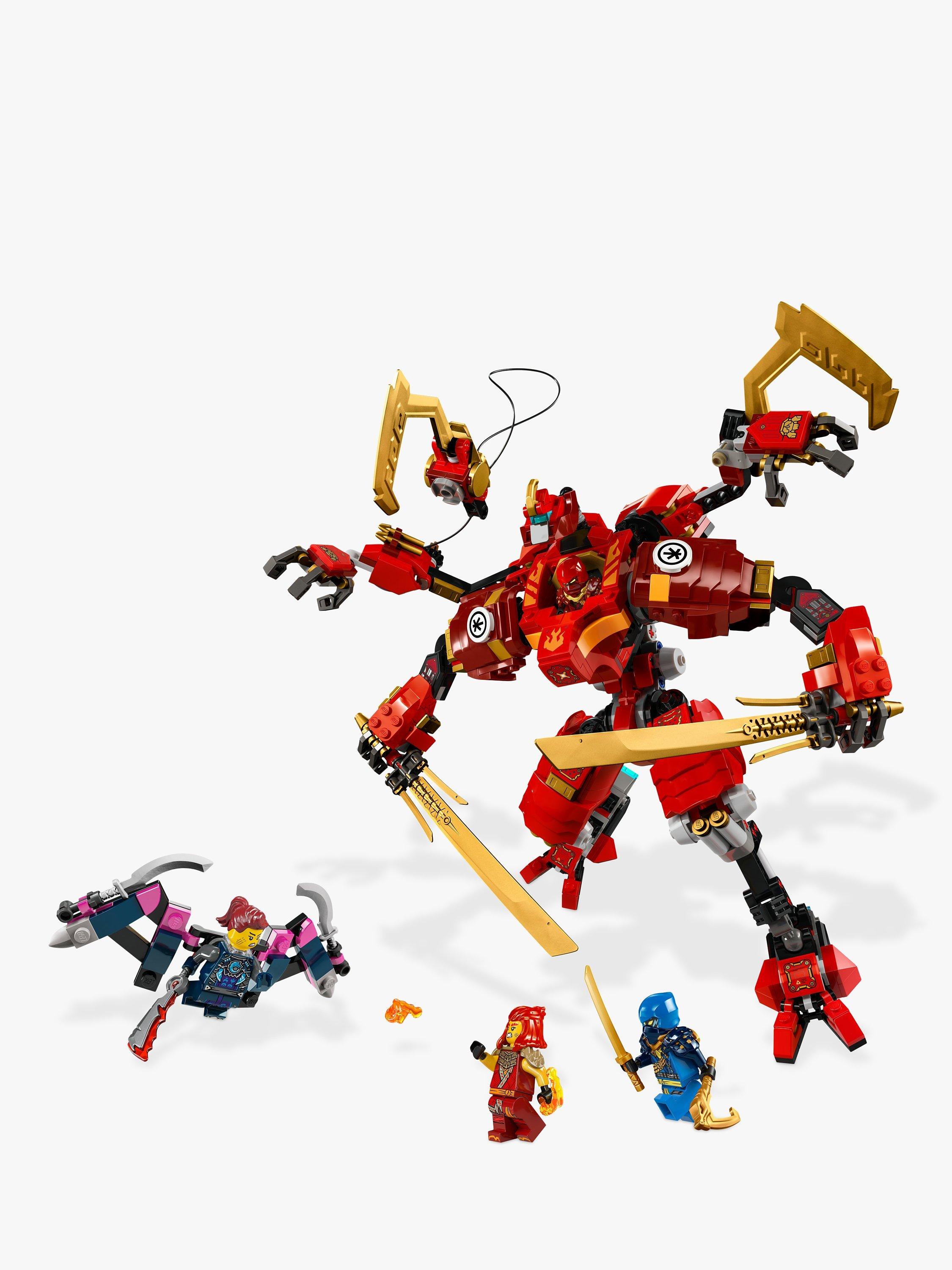 - Features a red Mech figure with 2 ninja hooks, posable arms, legs, torso, head and feet, 2 big katana sword accessories and a cockpit for a minifigure