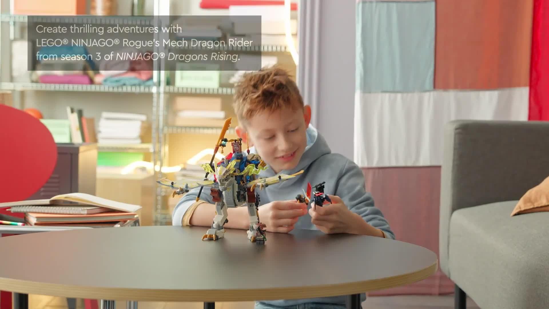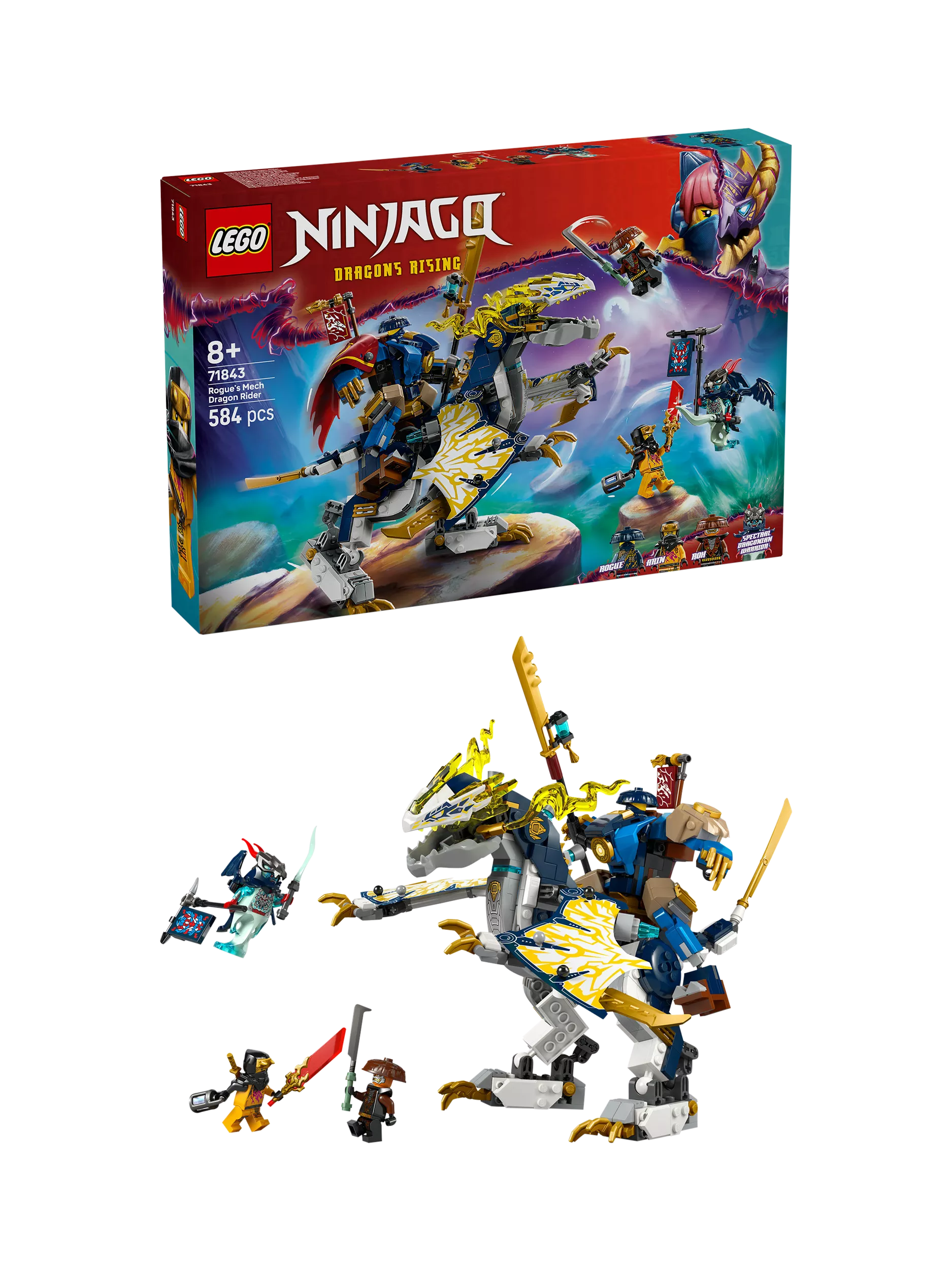 LEGO NINJAGO Rogue's Mech Dragon Rider (71843) ninja toy for 8+ year olds lets fans enact tales from season 3 of the NINJAGO Dragons Rising TV show. Kids can separately play with a mech toy and the first-ever NINJAGO robot dragon toy before combining them into the awesome Rogue’s Mech Dragon Rider.