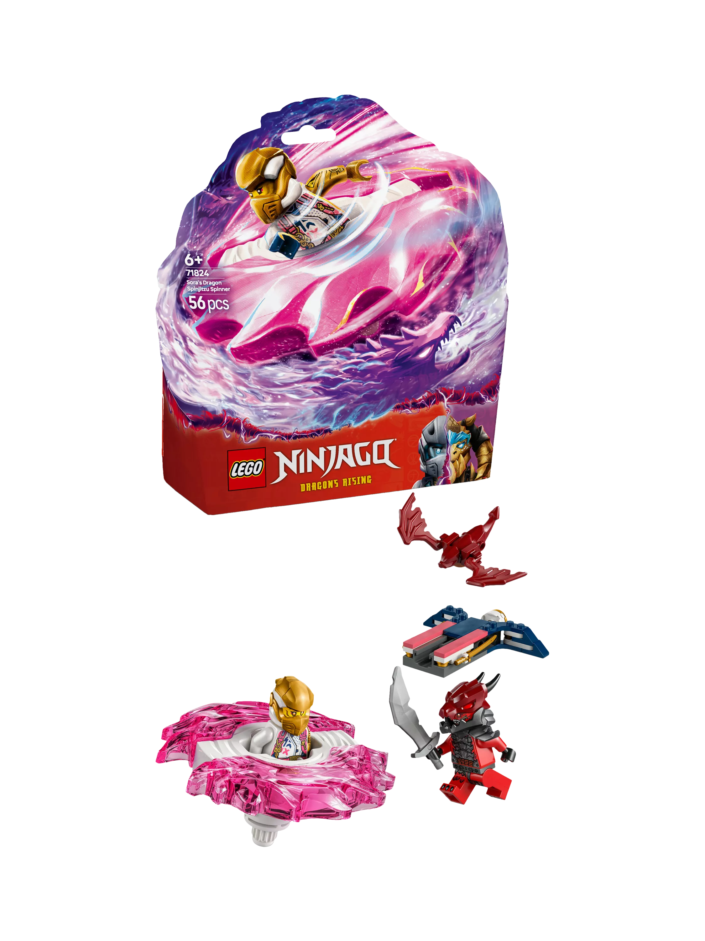 The set also comes with 2 LEGO minifigures: Sora, who rides inside the dragon Spinjitzu spinner and has a sword accessory, a villainous Dragonian Warrior with a sword accessory, plus a small dragon model. Kids can enjoy great role-play action as they stage good vs. evil battles with these popular NINJAGO characters. Printed building instructions are included in the box.