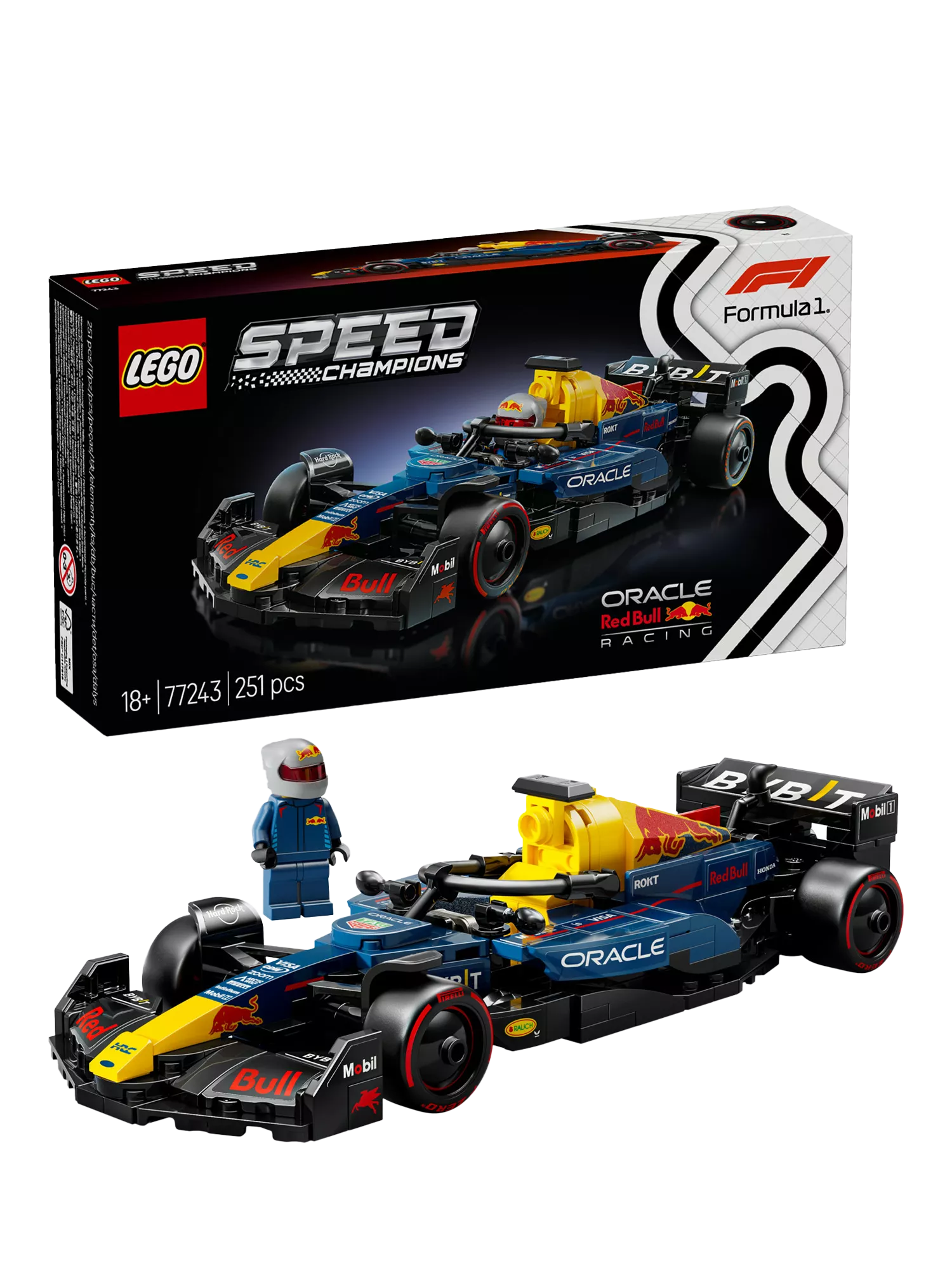 Explore the incredible features of this F1 model car, including a cockpit that opens by lifting the halo bar, a rear wing, wishbone suspension, sponsor stickers and wider rear tyres imprinted with “Pirelli.” The model car kit for adults to build also comes with an F1 driver minifigure wearing a Red Bull outfit and a winged helmet to place inside the cockpit.