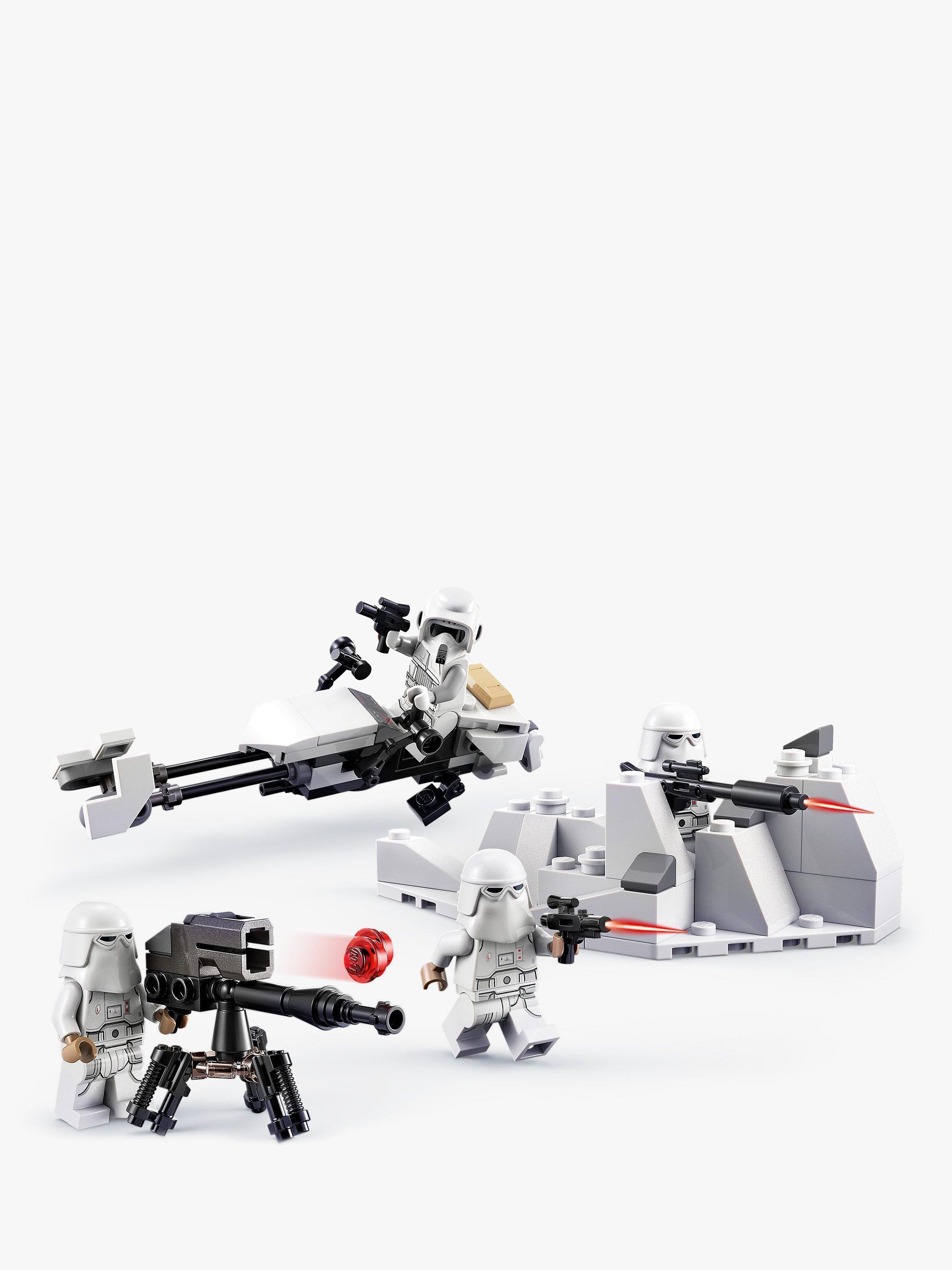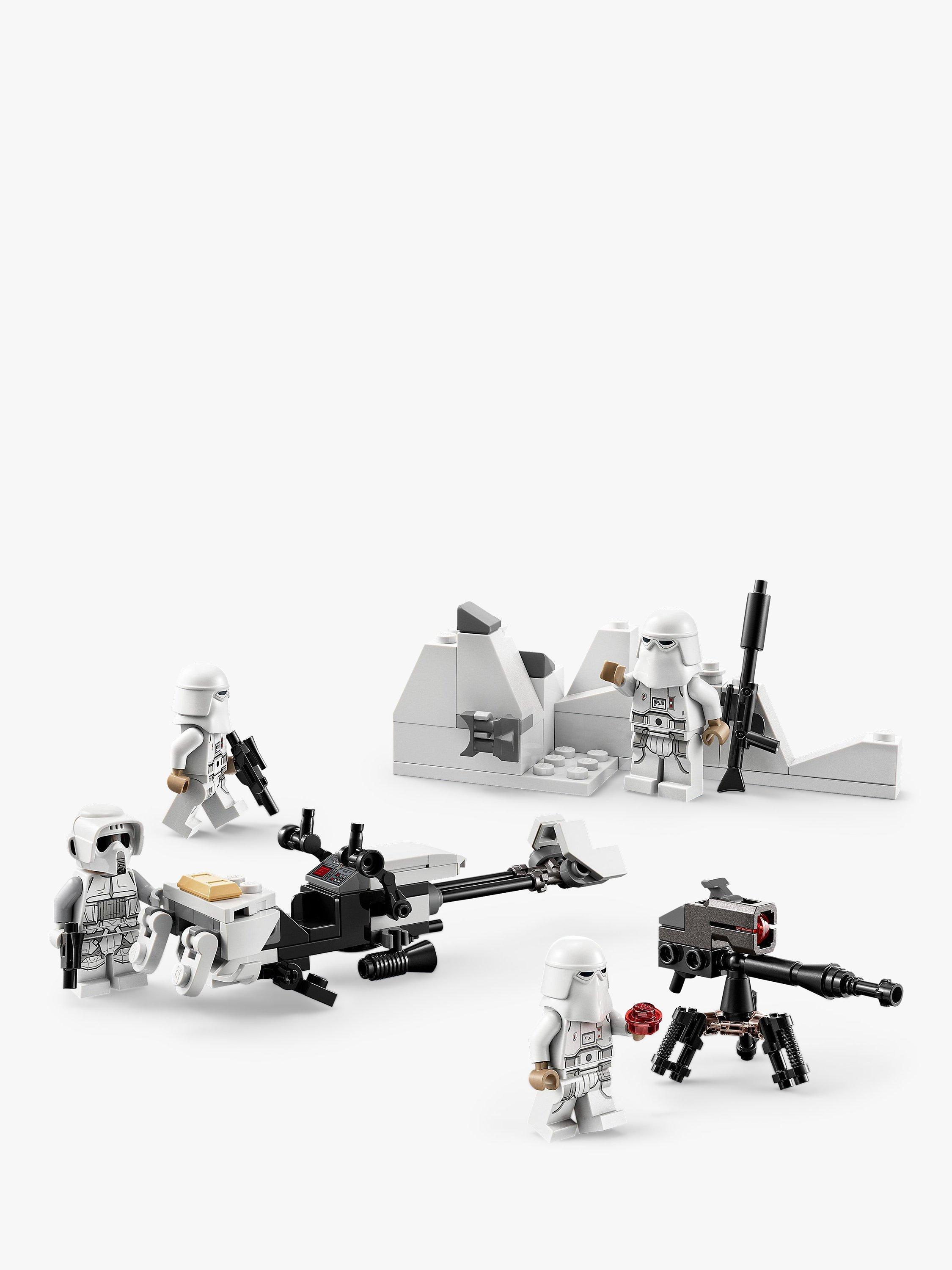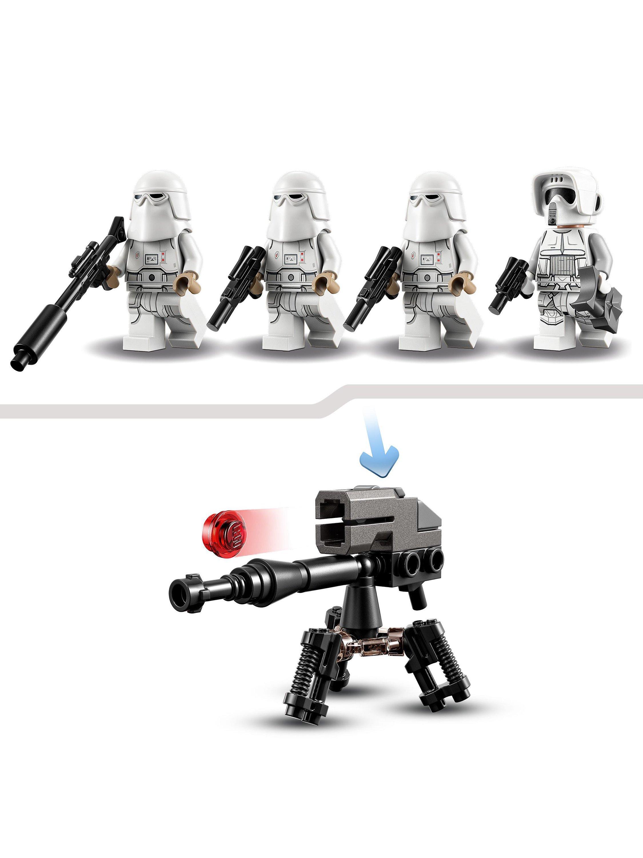- Contains 105 pieces and comes with a Hoth Scout Trooper and 3 Snowtroopers, plus 2 blaster guns, a blaster rifle and blaster pistol