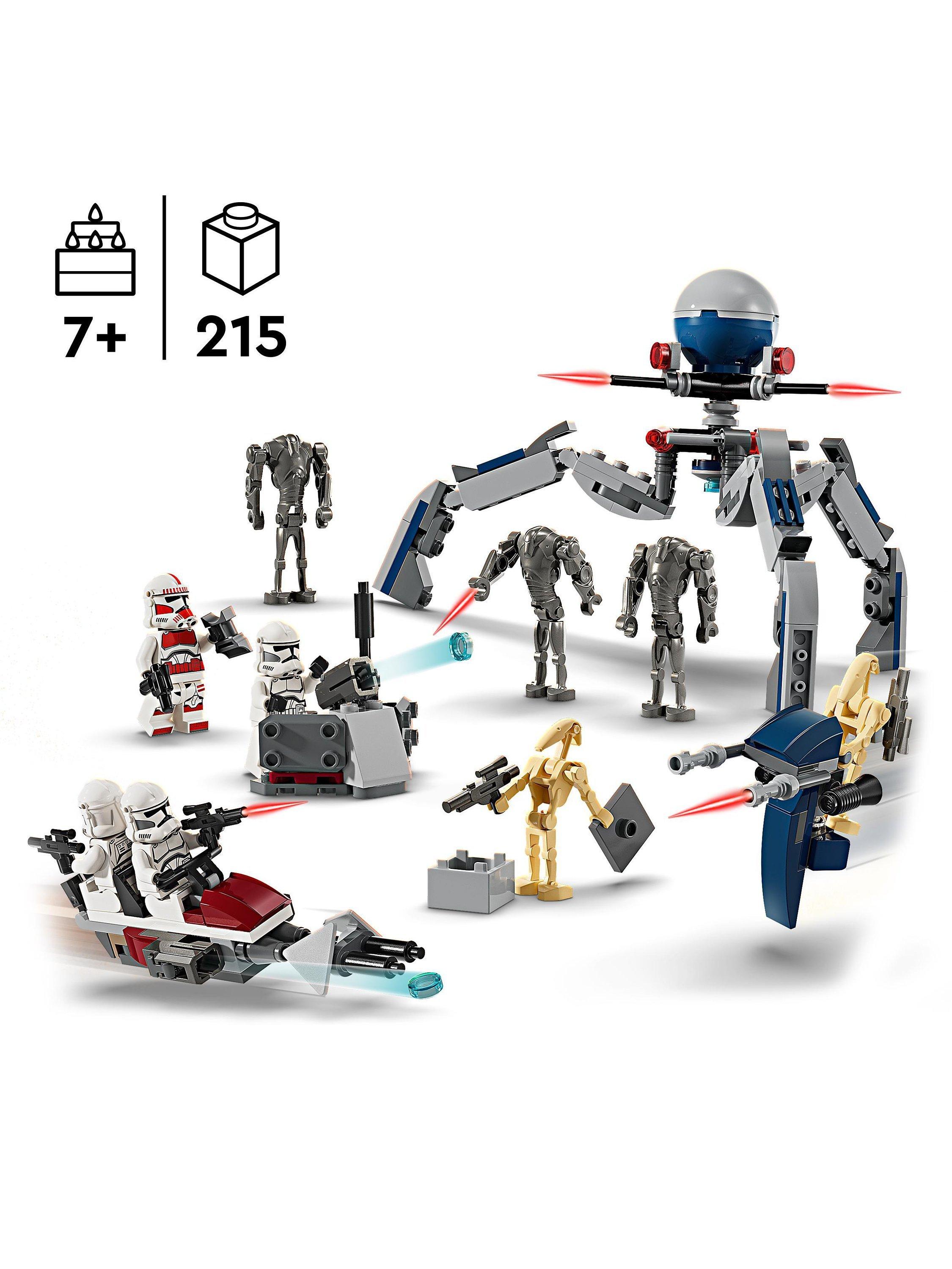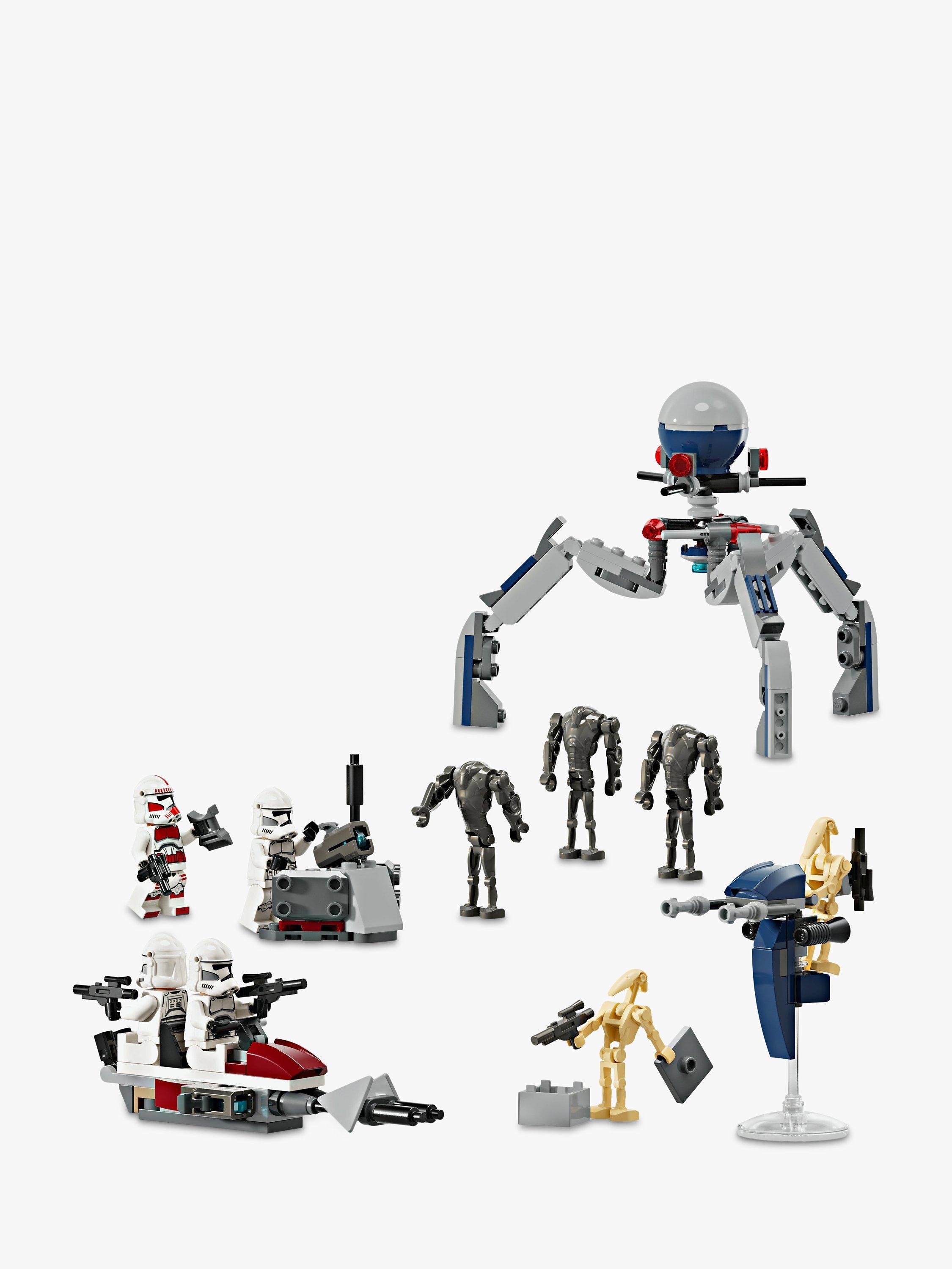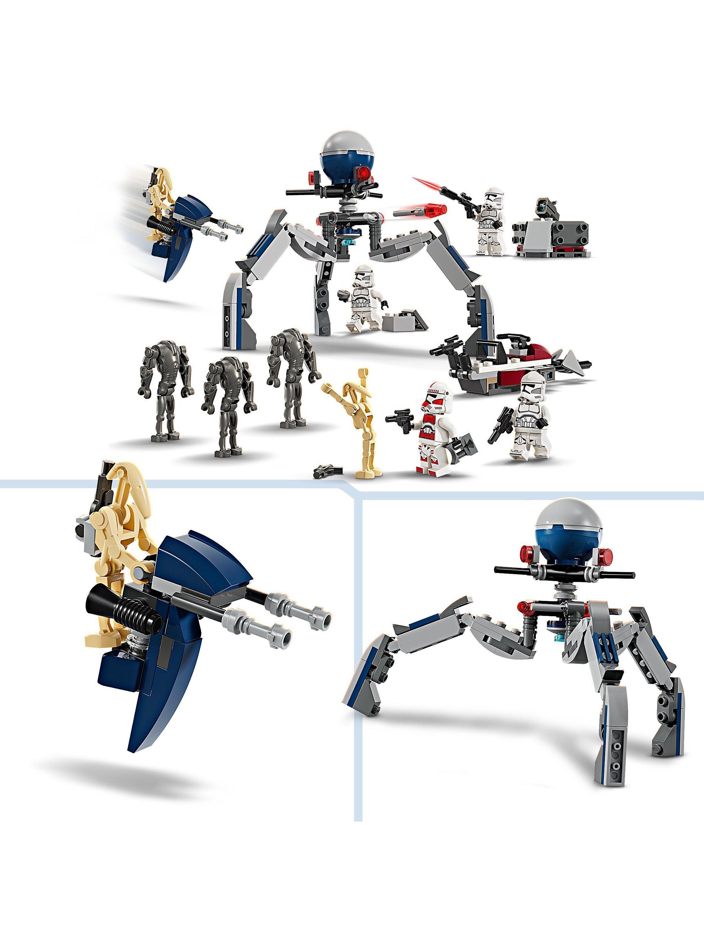 - Set includes 4 LEGO® Star Wars™ minifigures and 5 LEGO figures for action play – A Clone Shock Trooper, 3 Clone Troopers, 3 Super Battle Droids and 2 Battle Droids