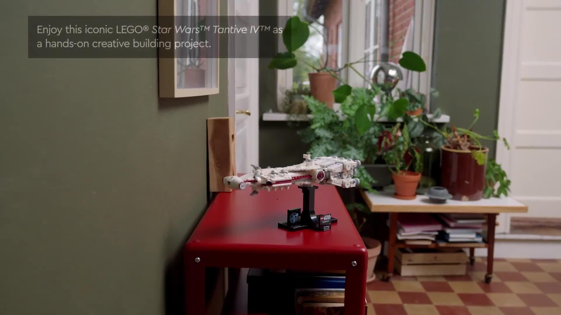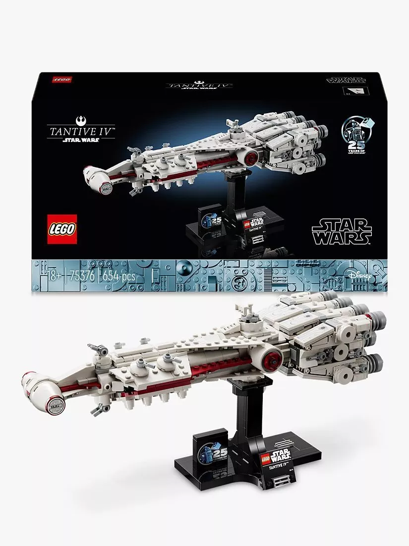 Build the excitement you felt when you watched the opening scene of Star Wars: A New Hope all over again with this buildable LEGO® brick model of the Tantive IV starship. Feel the power of your creative force as you capture instantly recognisable details of an iconic starship, first seen being chased by a Star Destroyer. Place your Star Wars™ vehicle on the buildable stand and add the nameplate and a LEGO Star Wars 25th anniversary brick to complete an attention-grabbing centrepiece.