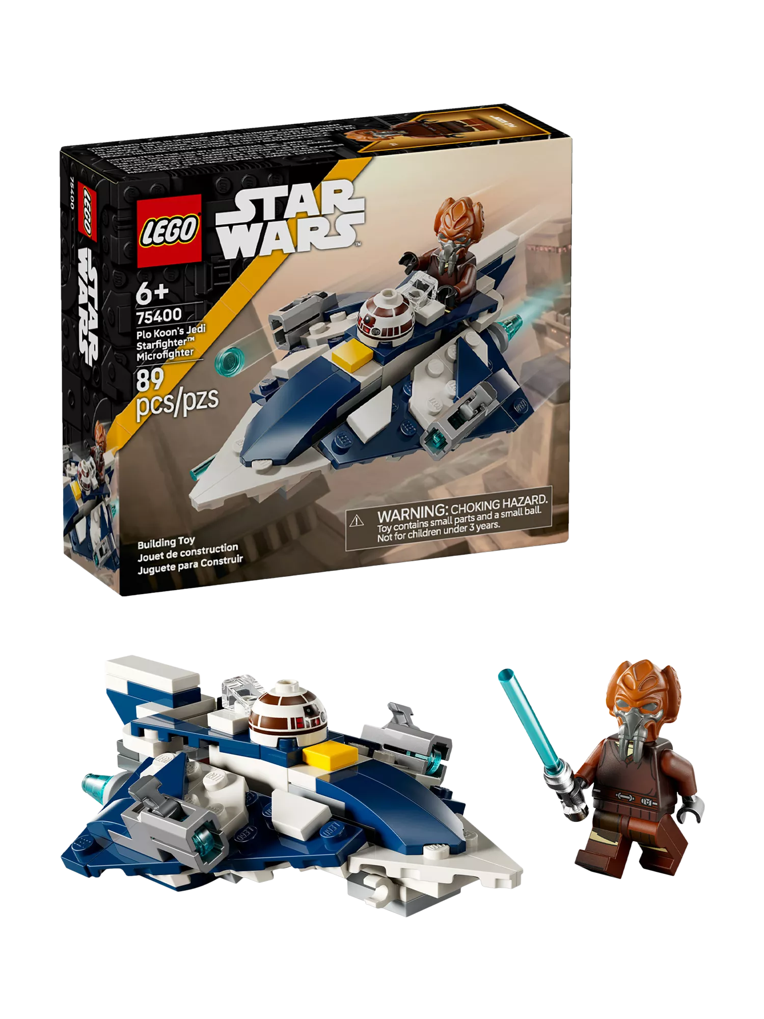 This fantasy building set also includes a Plo Koon LEGO minifigure with a blue Lightsaber™ that clips to the underside of the Microfighter. There is also an R7-D4 head element that attaches to the fuselage in front of the cockpit to make it seem as if that trusty Star Wars droid is Plo Koon’s co-pilot on his missions.