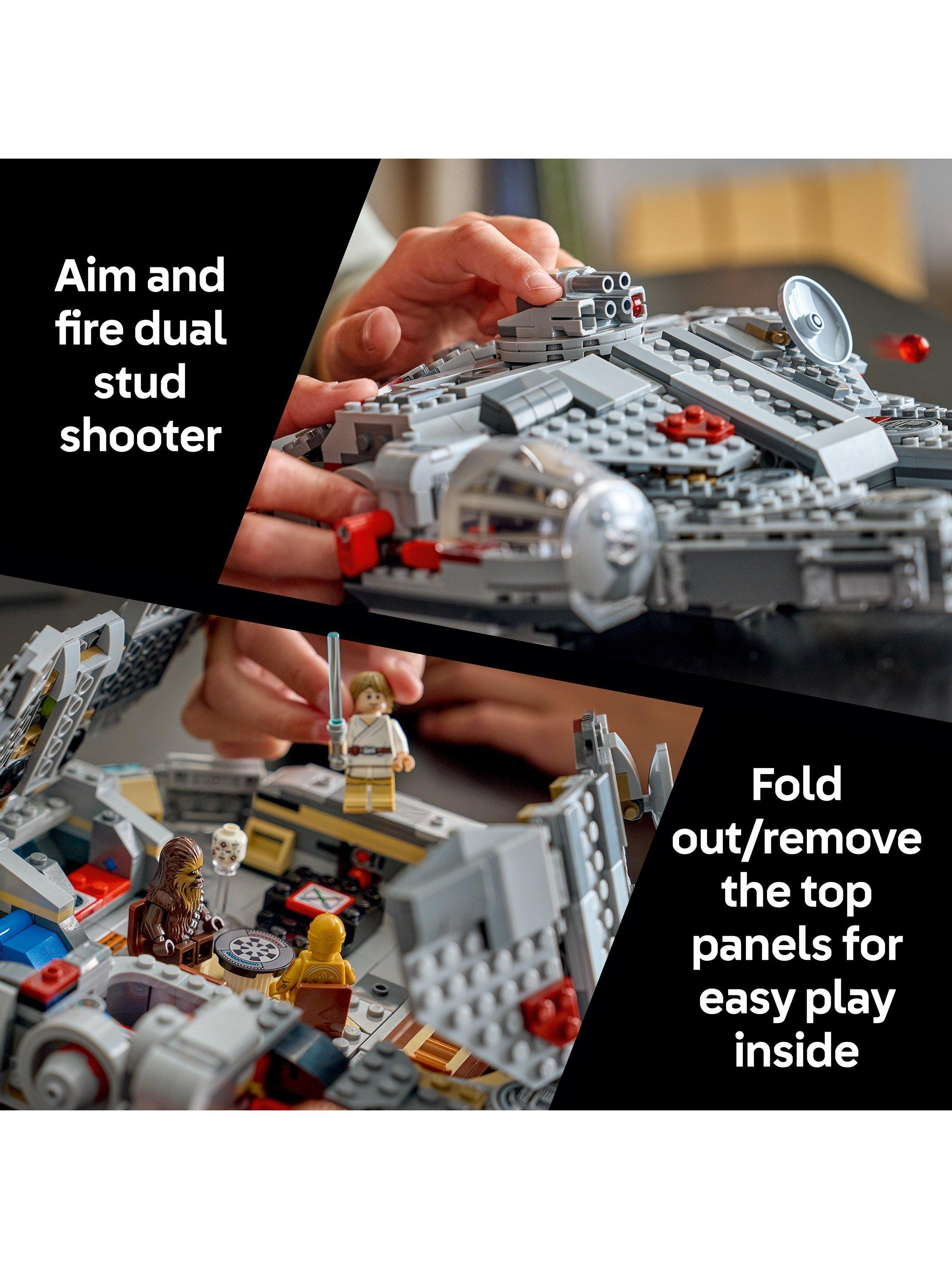Role-play as iconic characters on the Millennium Falcon (75426) with this endlessly playful LEGO Star Wars building toy for kids. The brick-built model of the famous starship has two stud shooters and lift-off/foldout top sections for easy access to the detailed interior. Play holochess, practise Lightsaber skills or just relax in the seating area.