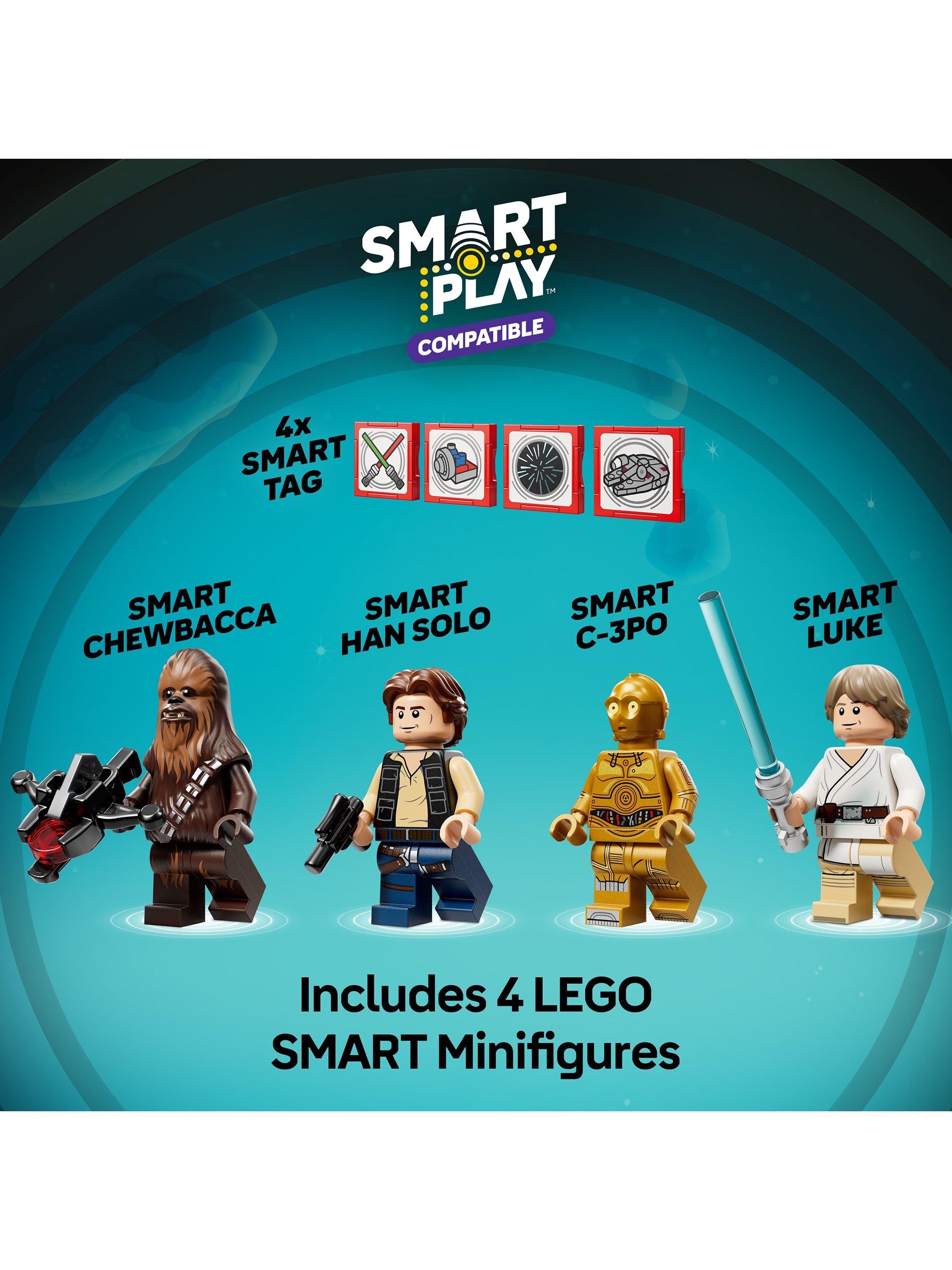 This LEGO SMART Play Compatible Set includes four LEGO SMART minifigures: SMART Han Solo, SMART Chewbacca, SMART Luke Skywalker and SMART C-3PO, and four SMART Tags. Add a SMART Brick from All-In-One Sets 75421, 75423 or 75427, sold separately, for interactive play with dynamic lights and sounds, including the hyperdrive leaping to light speed, laser-shooting battles, fuel explosions, Lightsaber clashes and more.