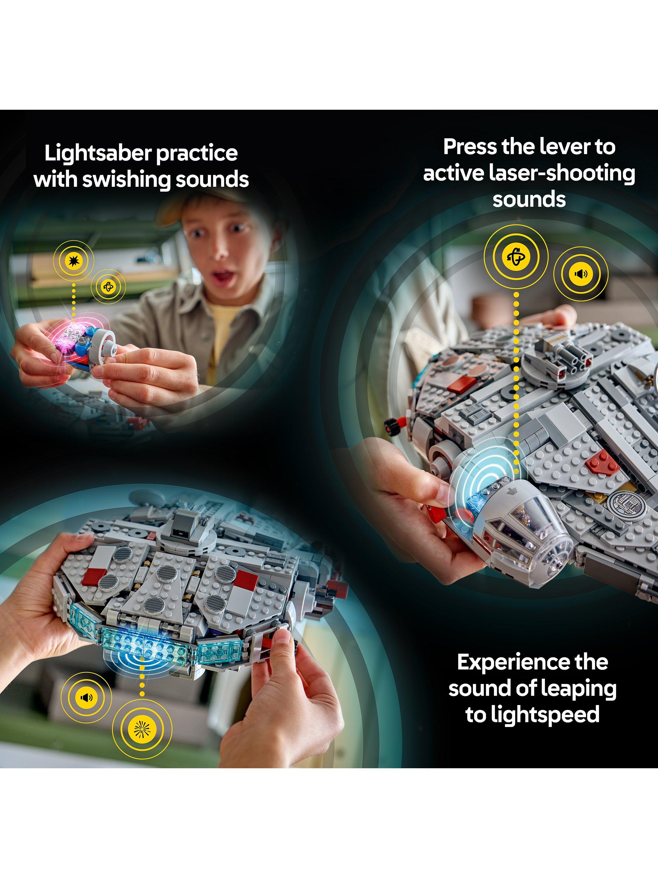 Team up with iconic characters and swoosh into action with the Millennium Falcon in this LEGO Star Wars SMART Play Compatible Set for kids.