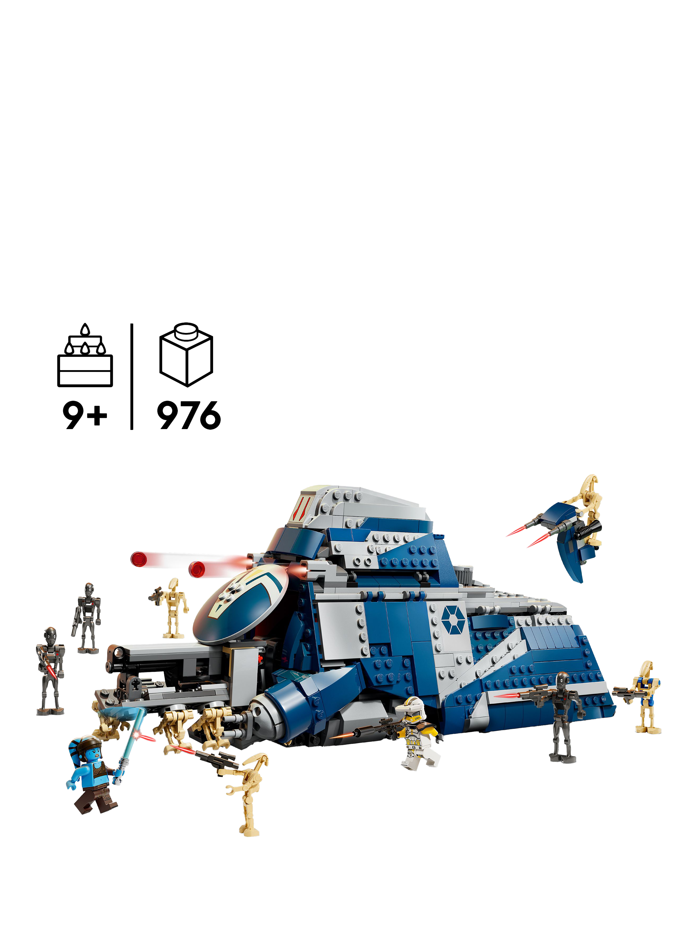 A cool Star Wars™ gift for nine+ year old kids, the building set includes two LEGO® minifigures — Aayla Secura with a Lightsaber and Commander Bly with a blaster rifle — plus three Commando Droid and six Battle Droid LEGO® figures, all with blasters, and a Pilot Battle Droid figure.