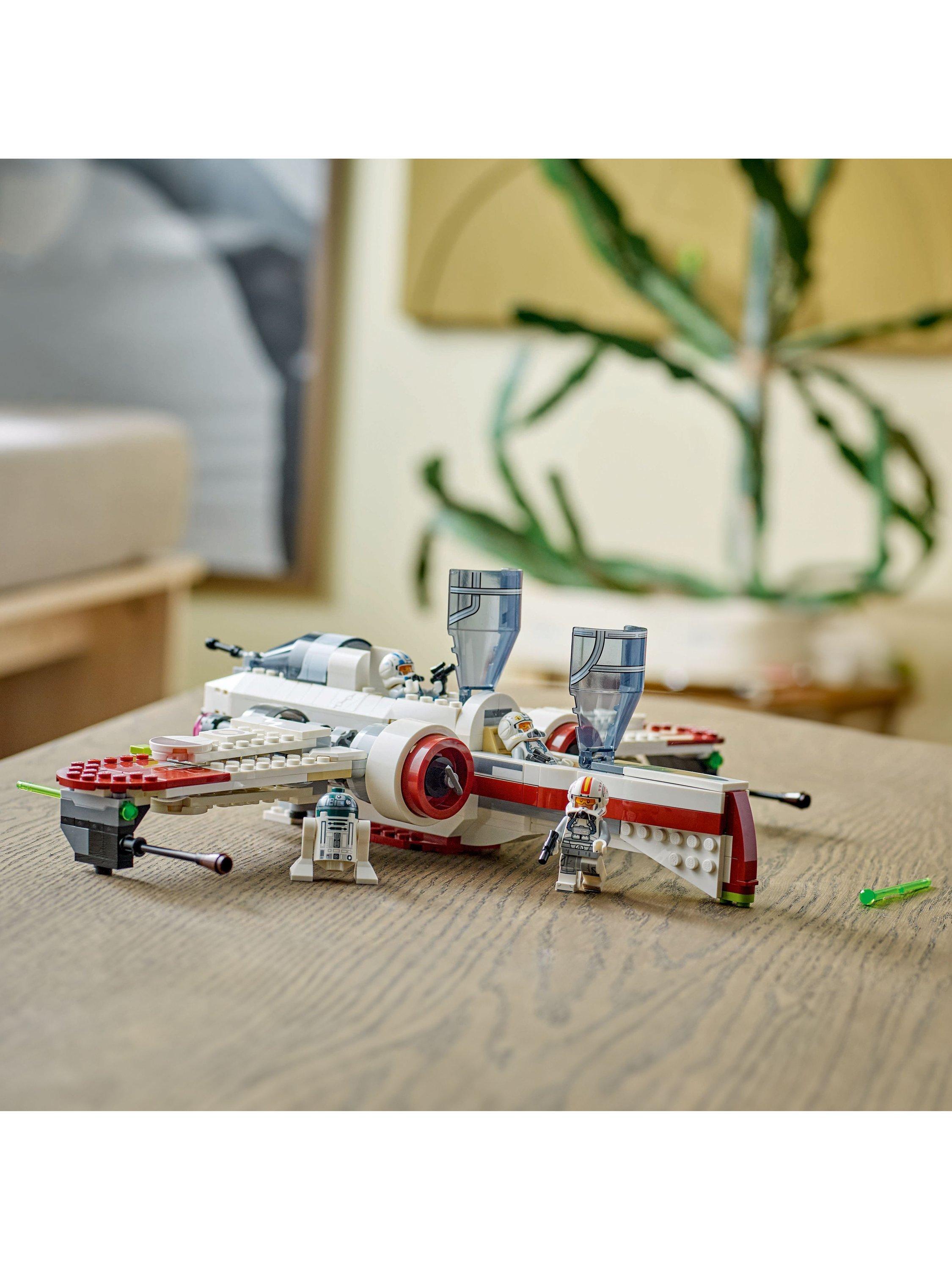 The buildable starship playset includes 4 LEGO Star Wars characters. The Clone Pilot Odd Ball, Clone Pilot Jag and Clone Pilot LEGO minifigures can be placed in the cockpits, and there is also space on board for the R4-P44 LEGO droid figure.