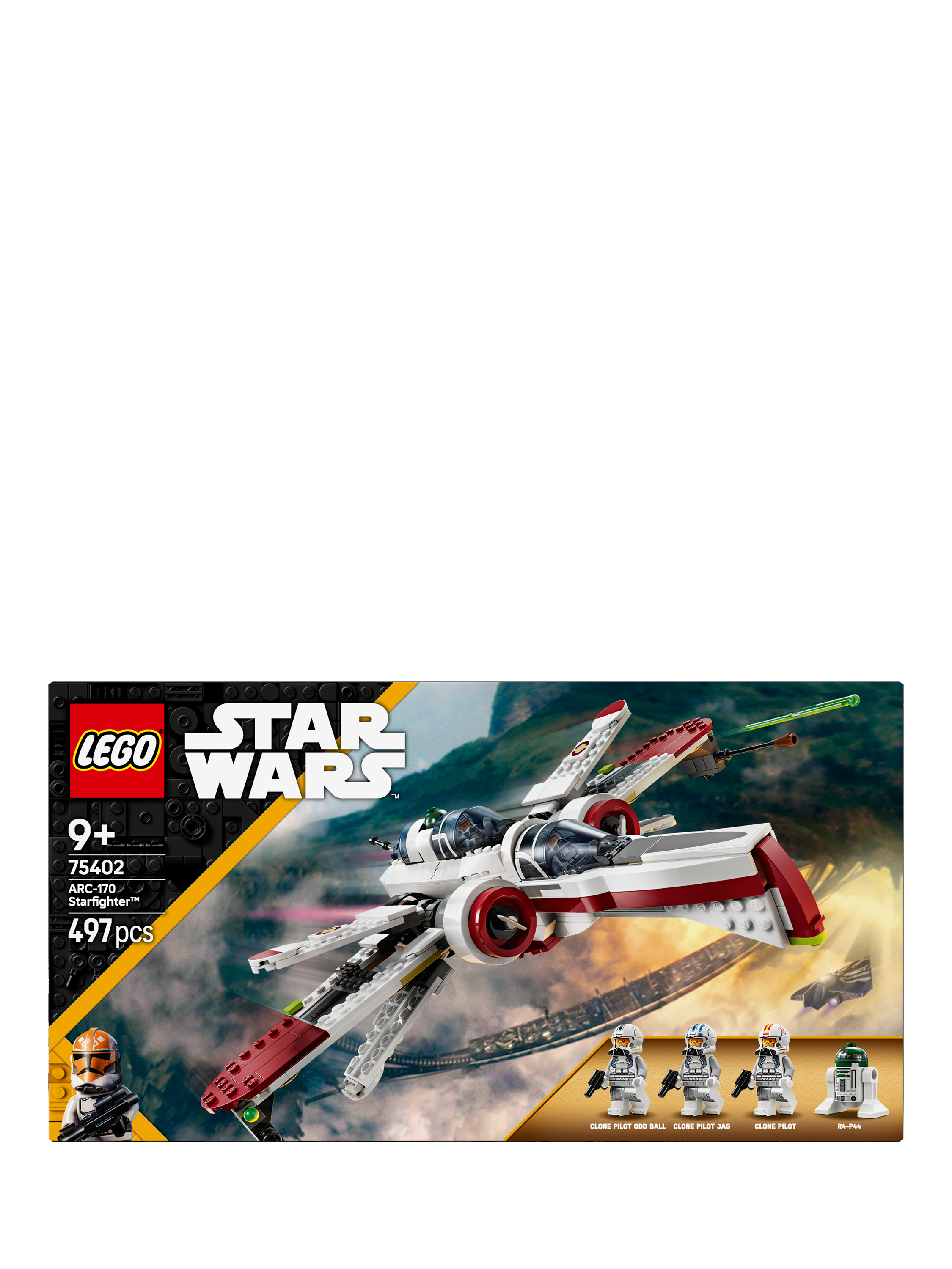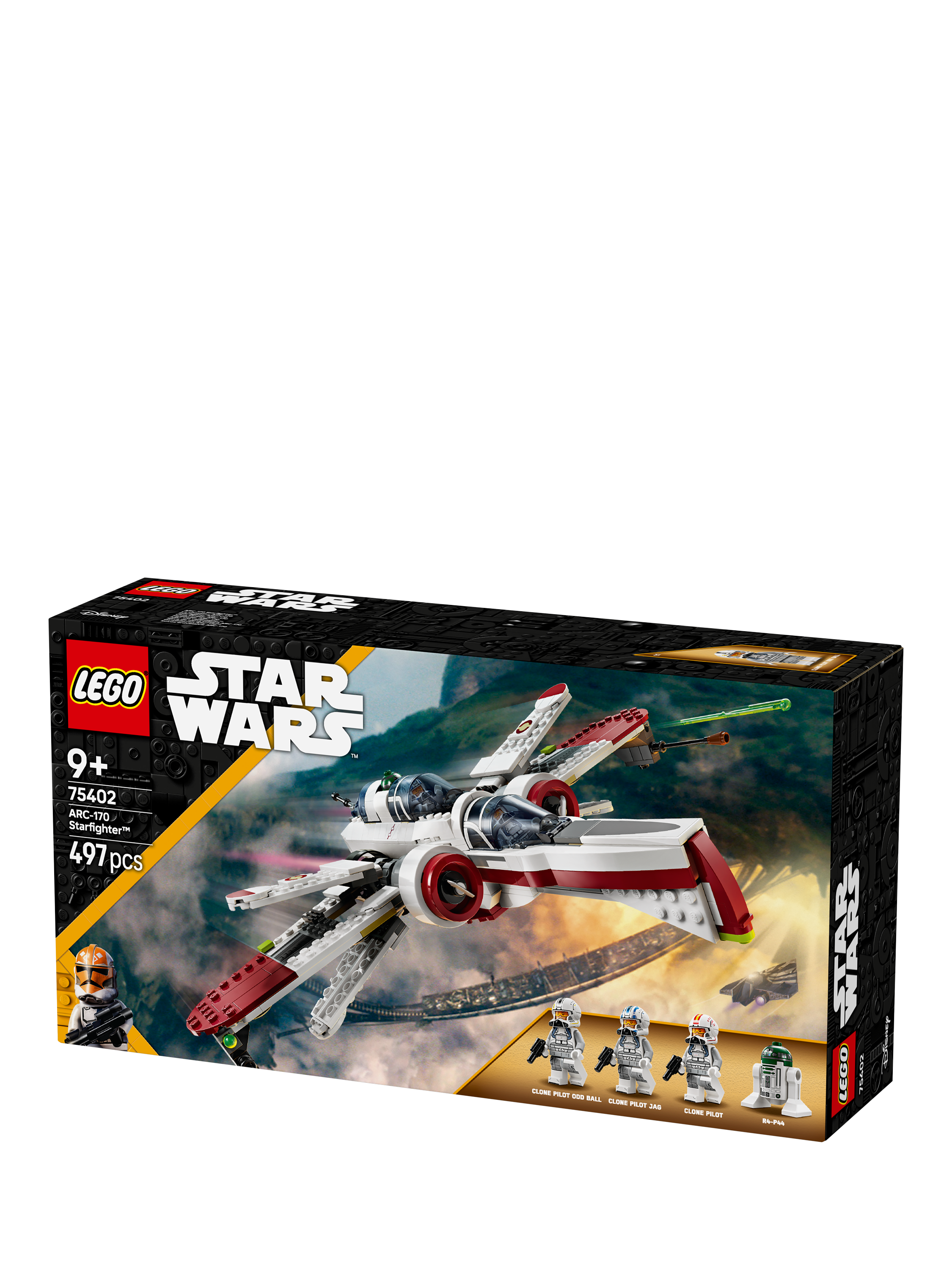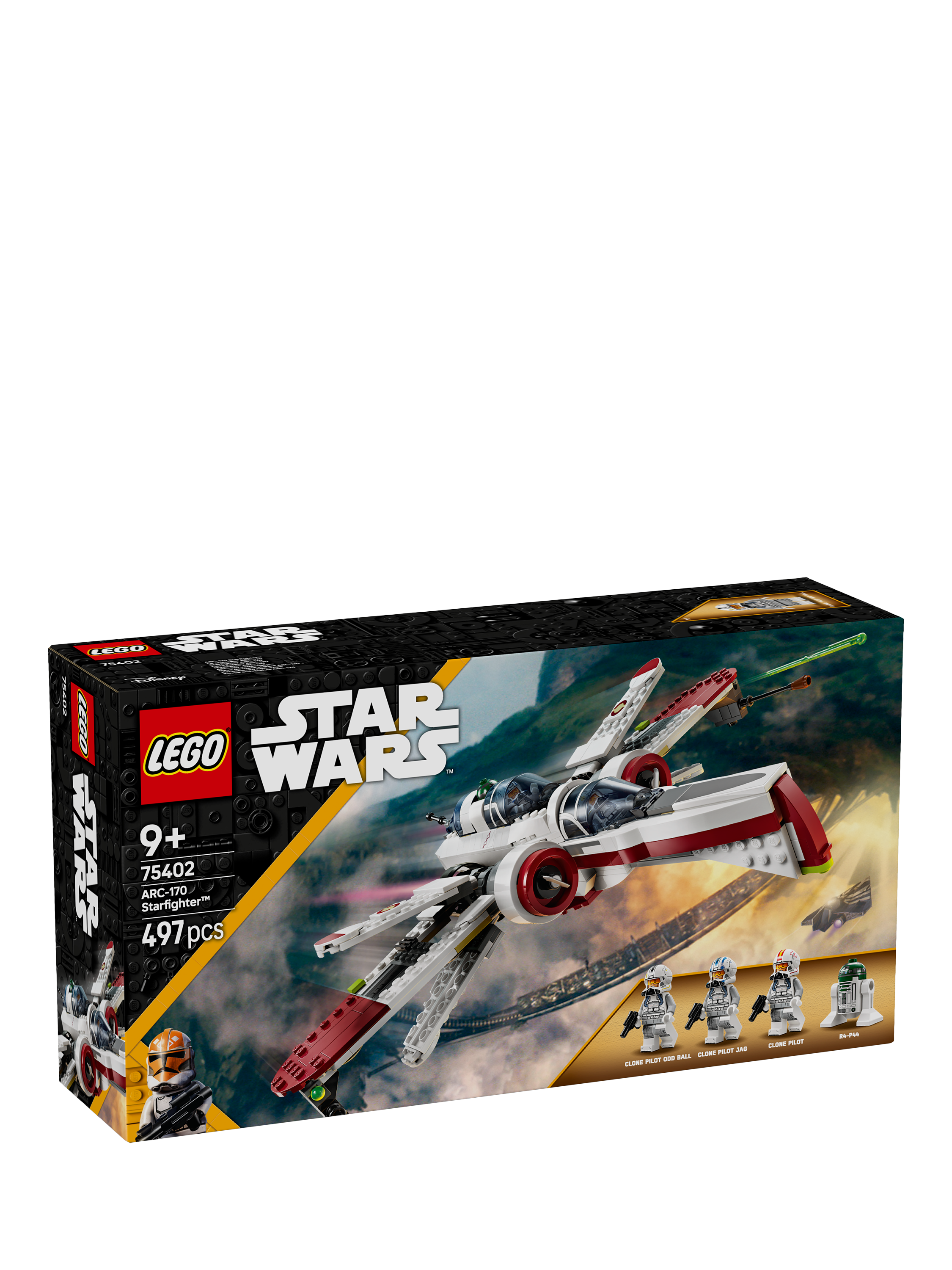 Recreate Star Wars: Revenge of the Sith™ missions with this ARC-170 Starfighter building toy (75402) for kids. A top LEGO® Star Wars™ gift idea for boys, girls and fans aged 9 and over, the brick-built starfighter features 3 opening cockpits, 6 wings, including 4 lever-operated adjustable wings for attack and cruise modes, and 2 spring-loaded shooters.