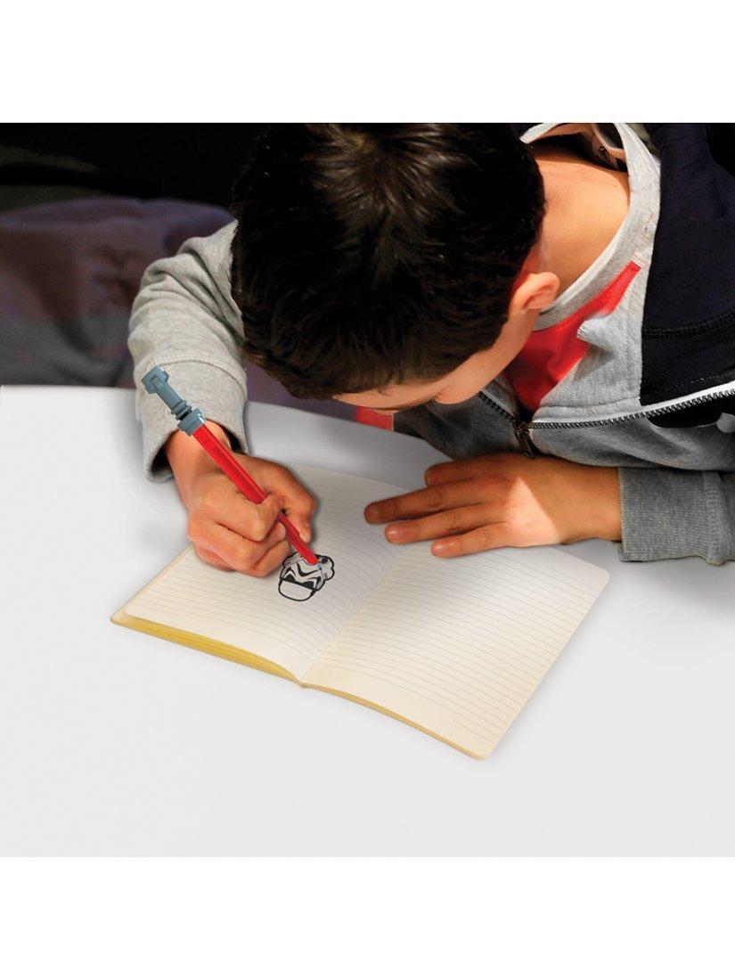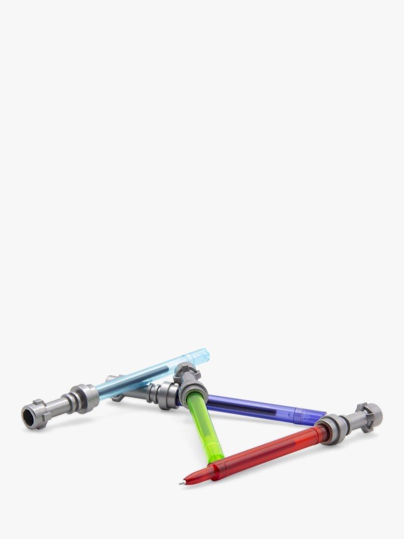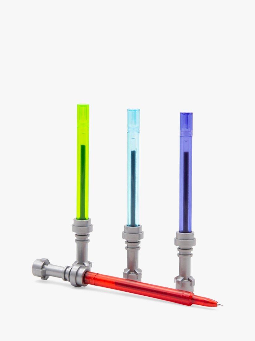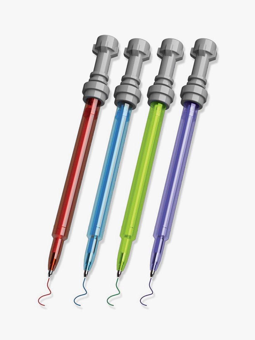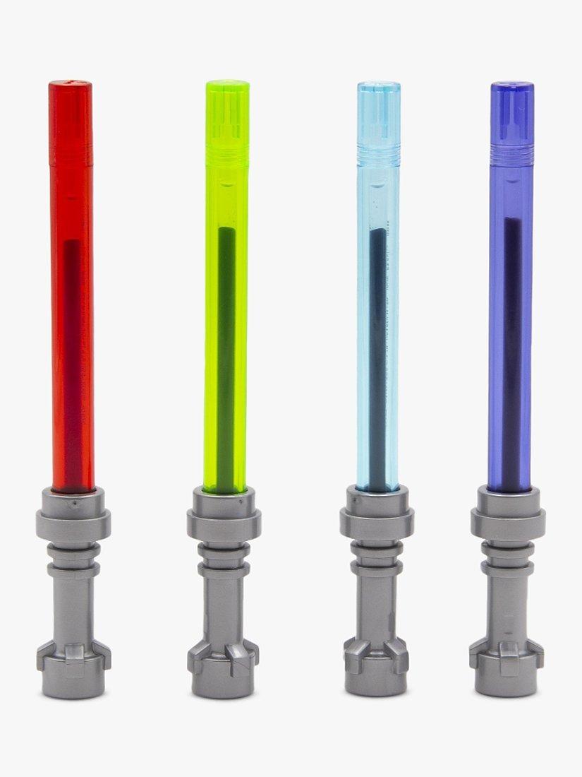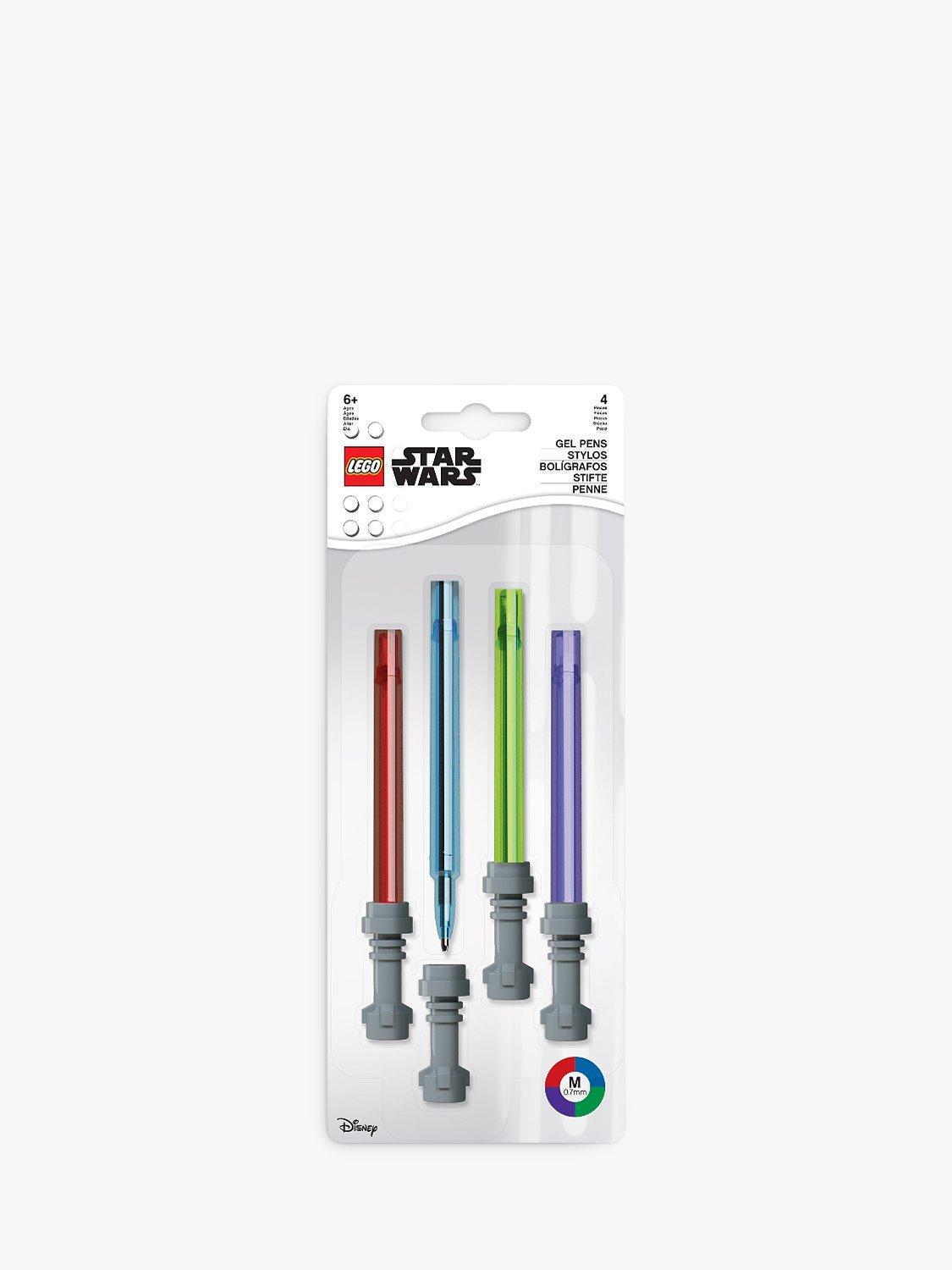 Get ready and expand your Star Wars collection with this set. It includes 4 Lightsaber Gel Pens in Red, Blue, Green & Purple measuring approximately 5.25" each. Each pen ink colour matches the colour of the Lightsaber. Take this awesome LEGO STAR WARS Stationery with you on all your galactic adventures! Be one with the force!