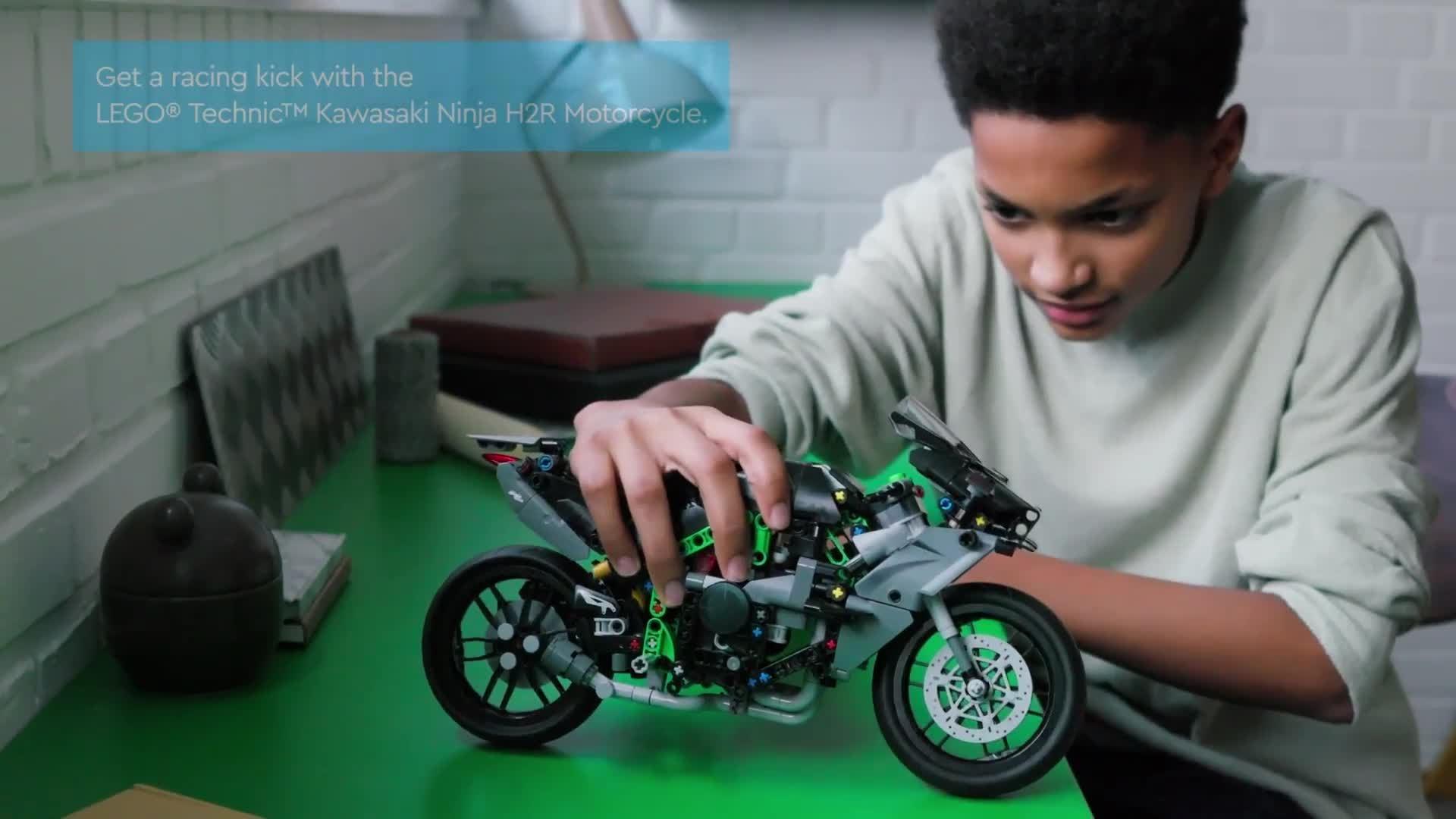 Get to know one of the fastest production motorcycles in the world as you build the LEGO® Technic Kawasaki Ninja H2R Motorcycle. With amazing attention-to-detail, this 1:8 scale model offers steering, suspension, a 2-speed gearbox, a 4-piston articulated engine and turbocharger. Have fun recreating the features of a cutting-edge motorcycle, then use the kickstand to display your model with pride.