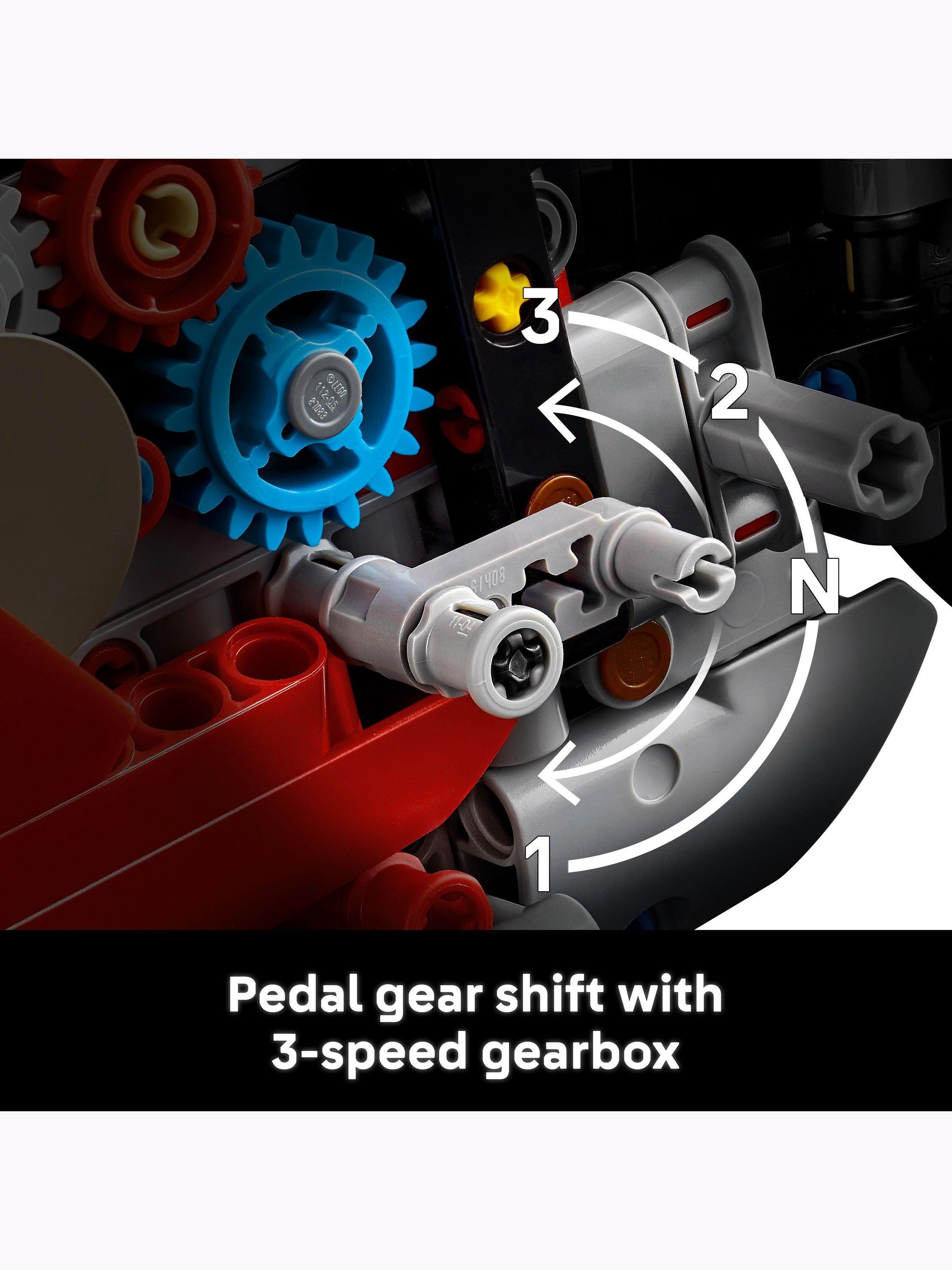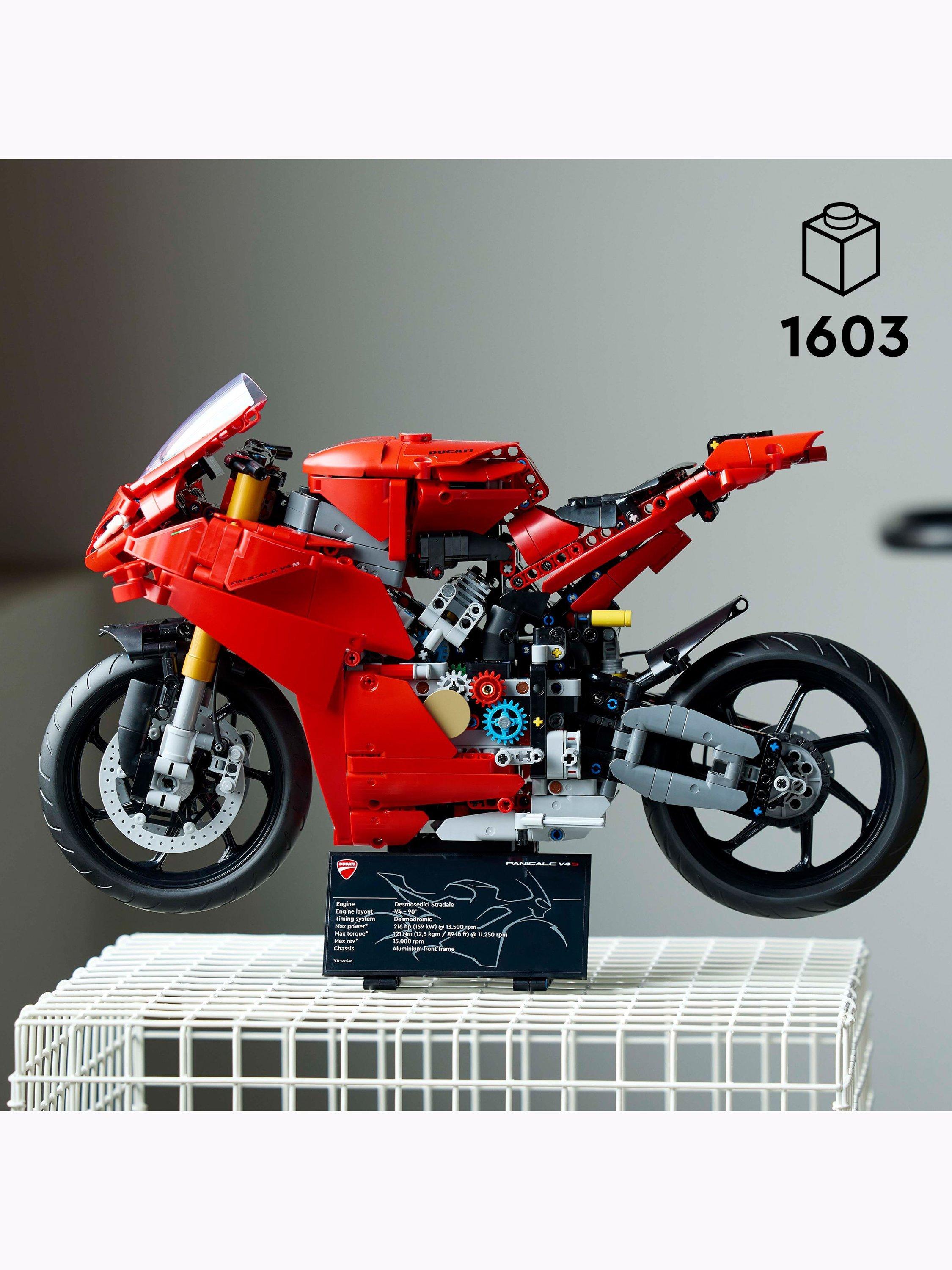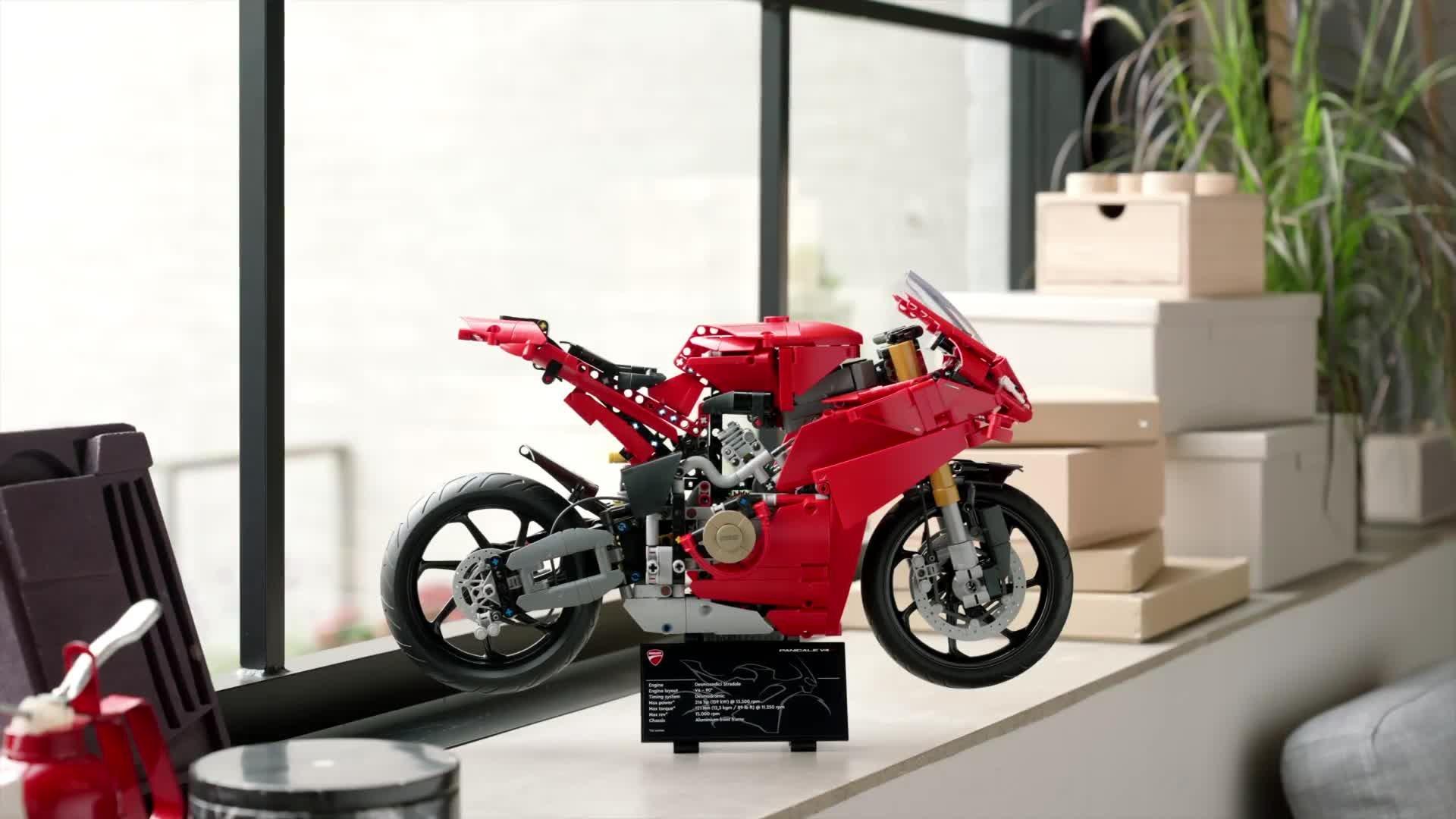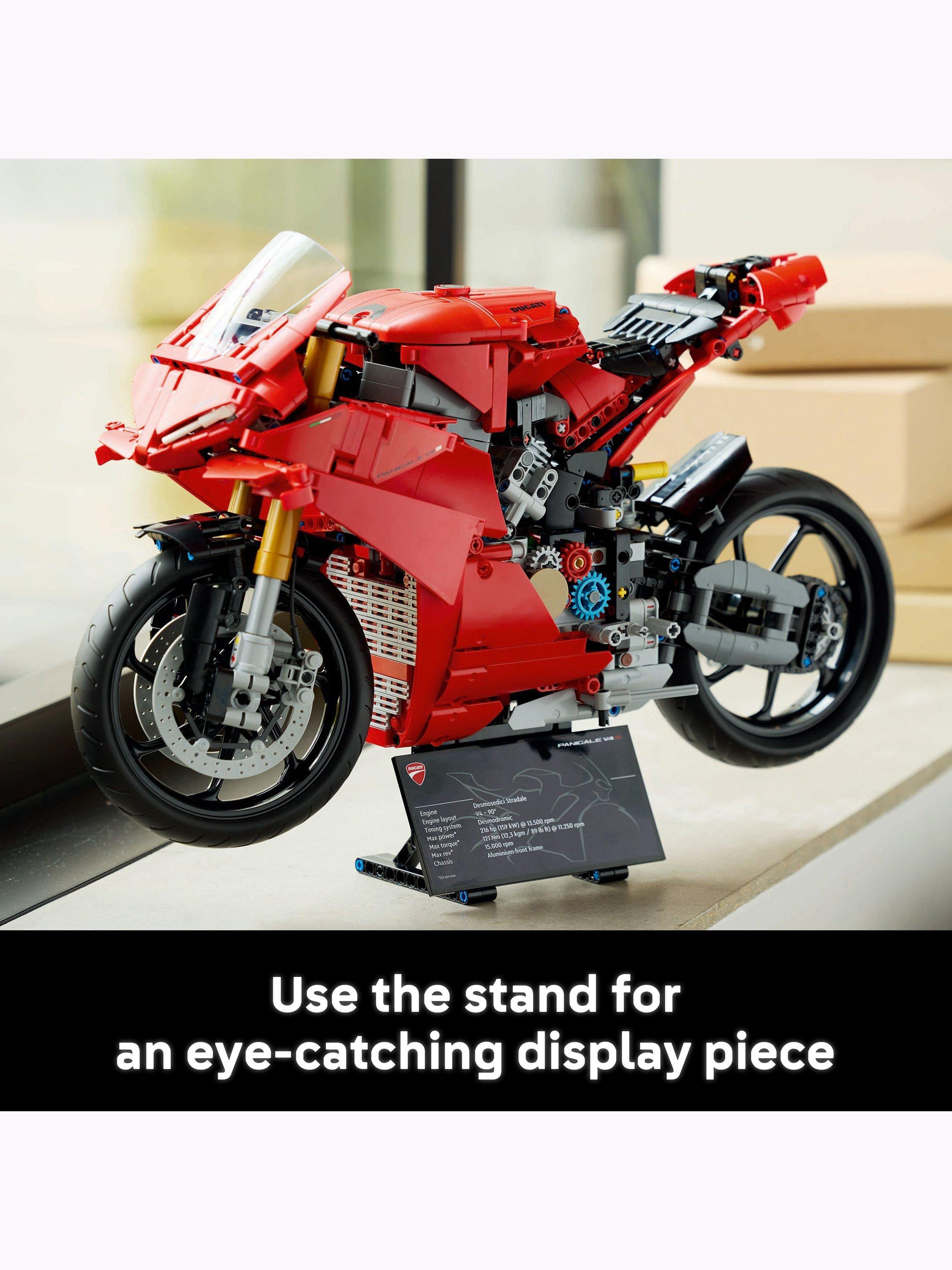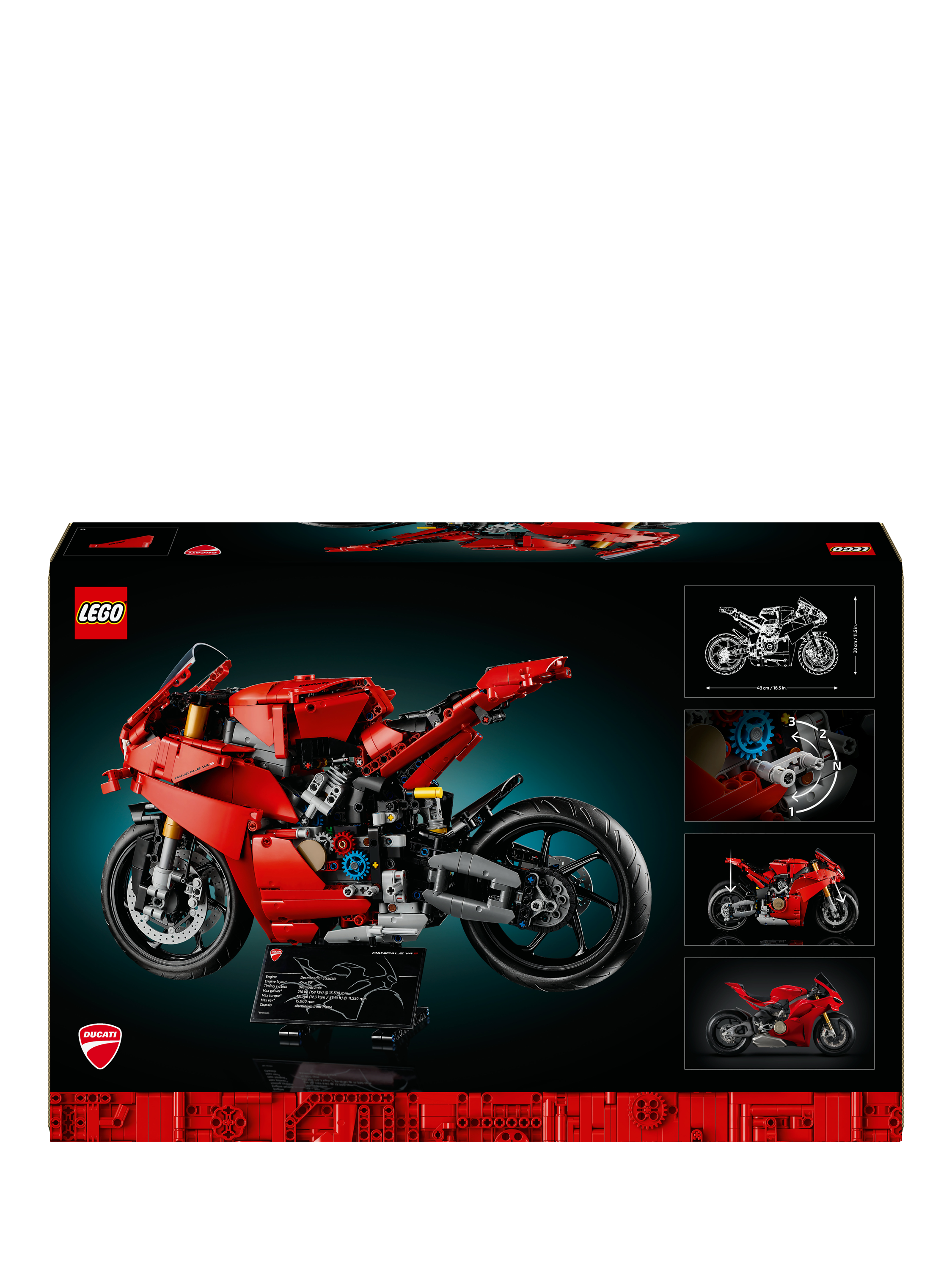 Explore the front and rear suspension and steering on the LEGO motorcycle. Check out the pedal gear shift with its 3-speed (plus neutral) gearbox. Use the back wheel to drive the chain, which connects to the gearbox and the V4 engine. With its iconic Ducati red colour, this motorbike model is a great gift idea for men and women who are racing fans and comes with a stand to create an eye-catching display piece.