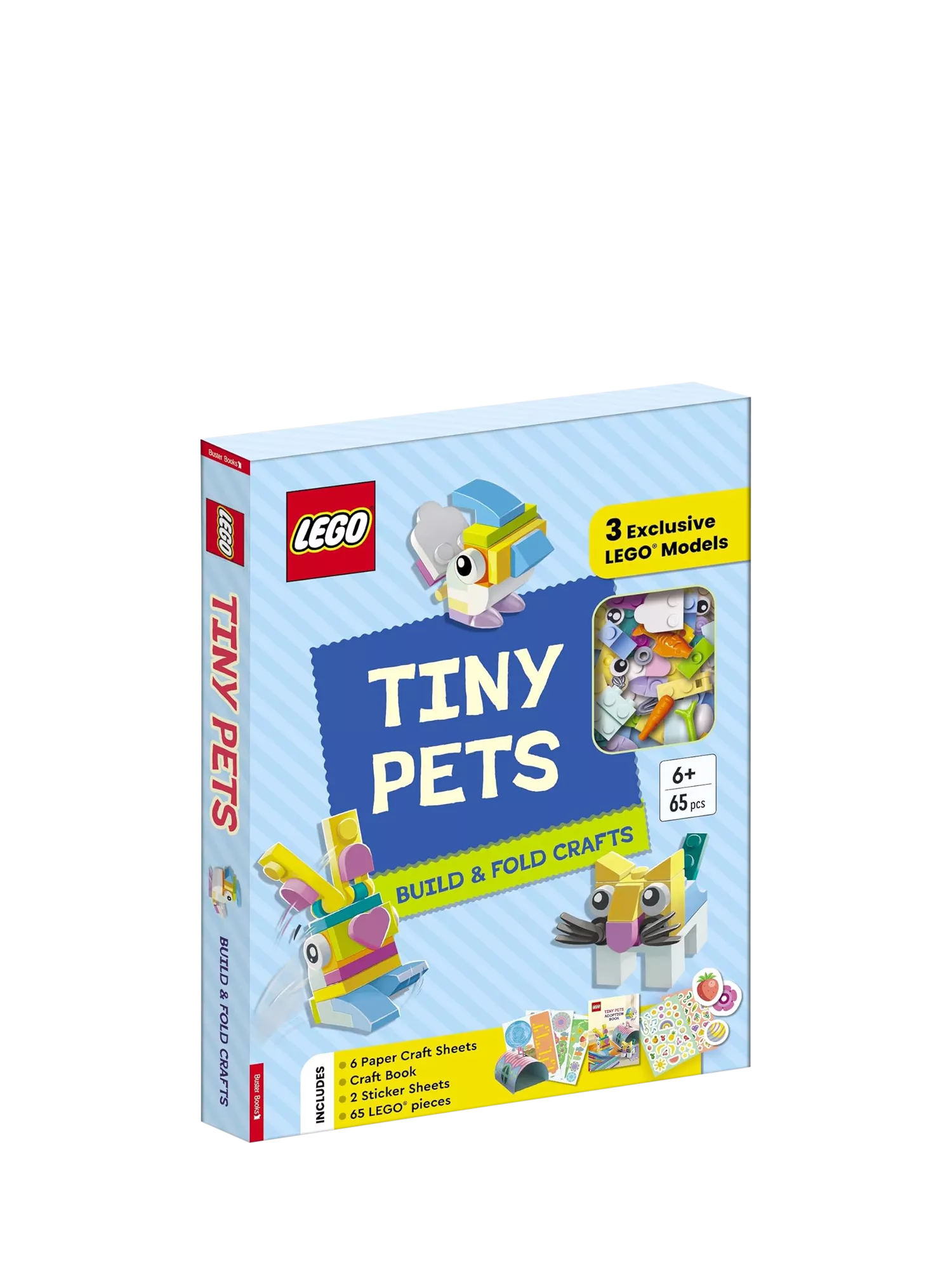Build your very own LEGO miniature pets with this build and craft set. Included inside are 65 LEGO pieces plus all the instructions you need to build your own cat, bunny and bird models. The fun, colourful Pet Adoption Book includes lots of fun craft and play ideas for you to try at home with your lovable new pets. Also inside are six paper craft sheets that you can use to create homes, toys and other cool accessories for your pets. Plus, there are two sticker sheets so that you can use to decorate your paw-some new crafts.