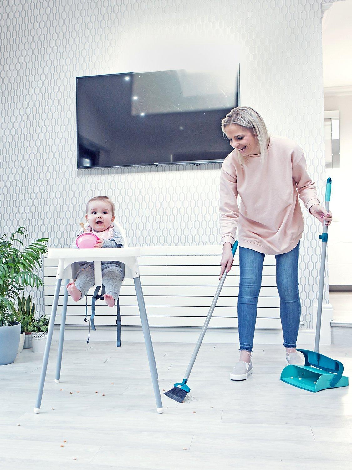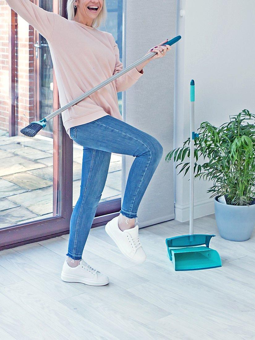 The broom has an adjustable head joint for flexible sweeping angles and a soft lip on the front edge of dust pan to ensure nothing gets left behind. The dust pan closes when raised from the floor to keep odours and sweepings in until you're ready to empty.