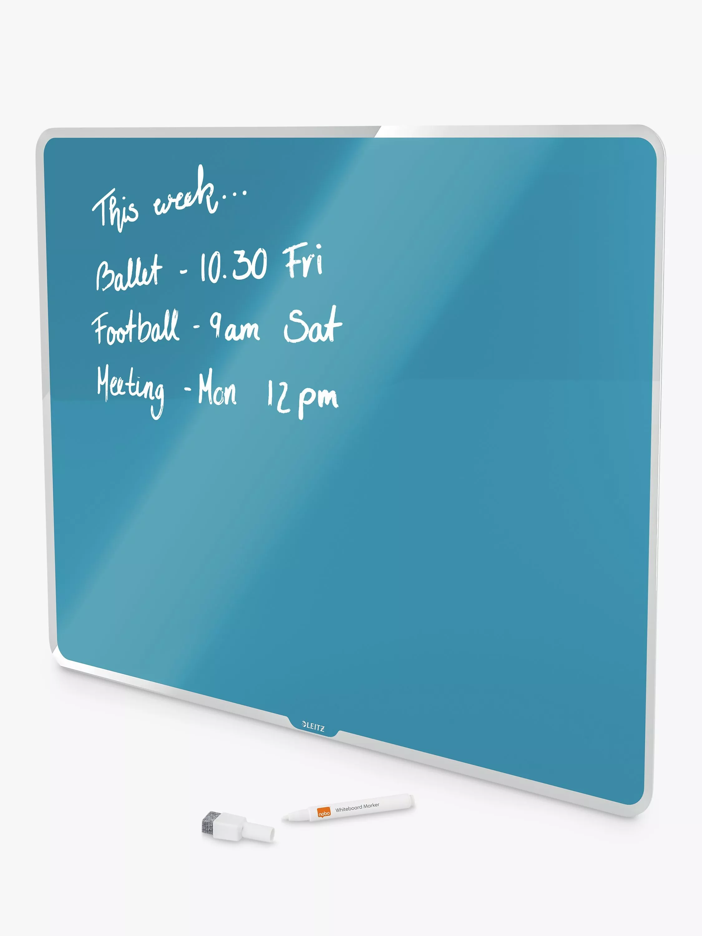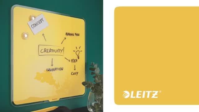 A Leitz Cosy Magnetic Whiteboard. The frameless whiteboard design is ideal for writing or sticking notes directly onto the magnetic whiteboard surface with ultra-erasability and the highest resistance to ink stains and pen marks. Includes a Nobo Dry Erase White Marker pen.