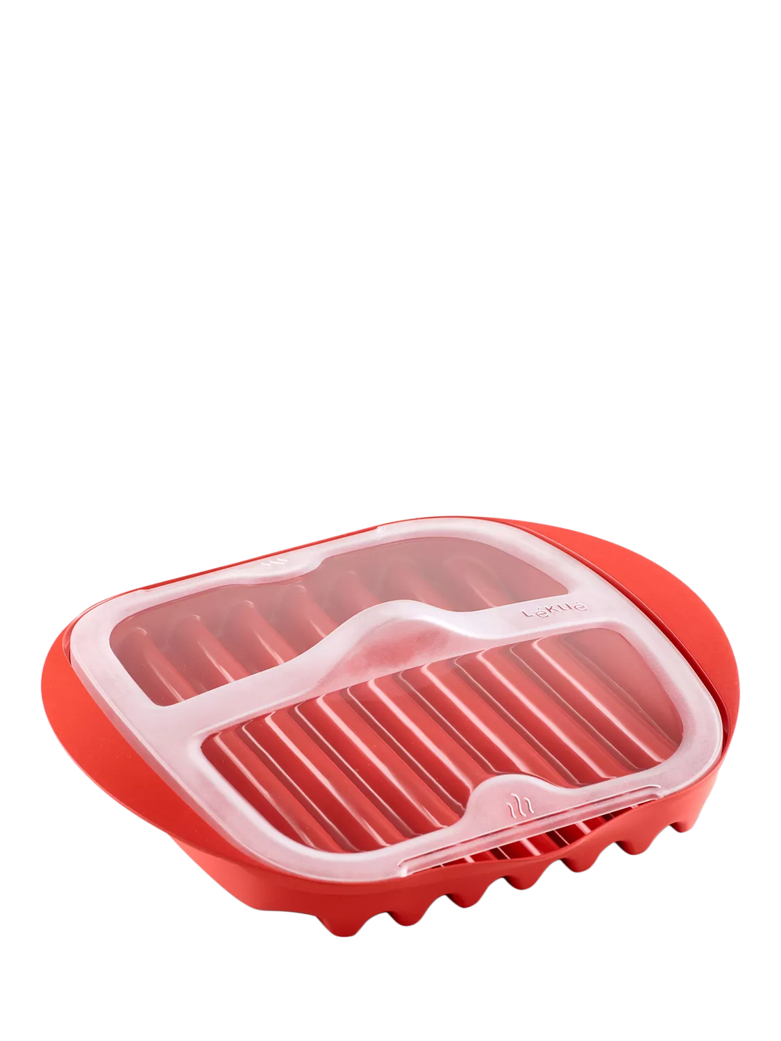 The grill-shaped base of the Bacon Microwave Cooker drains excess fat from bacon to ensure a crunchy effect. Simply pour the fat and excess liquid through the channel at the base. The handles are comfortable for convenient transportation and the lid is designed to prevent splashing, making cooking bacon cleaner.