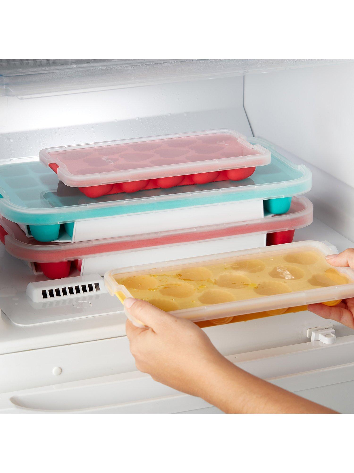 Made of rubber, the tray is flexible so it's easy and quick to remove the ice cubes. It's effortless: just press on the ice cube mould. The tray makes up to 14 rectangular cubes in one go. The included lid prevents odours from transferring from frozen foods to ice cubes in the freezer. It also allows you to stack the ice cube trays and other containers, saving storage space. It's stable, so you can move the ice cube tray and position it in the freezer drawers without any water leaks.