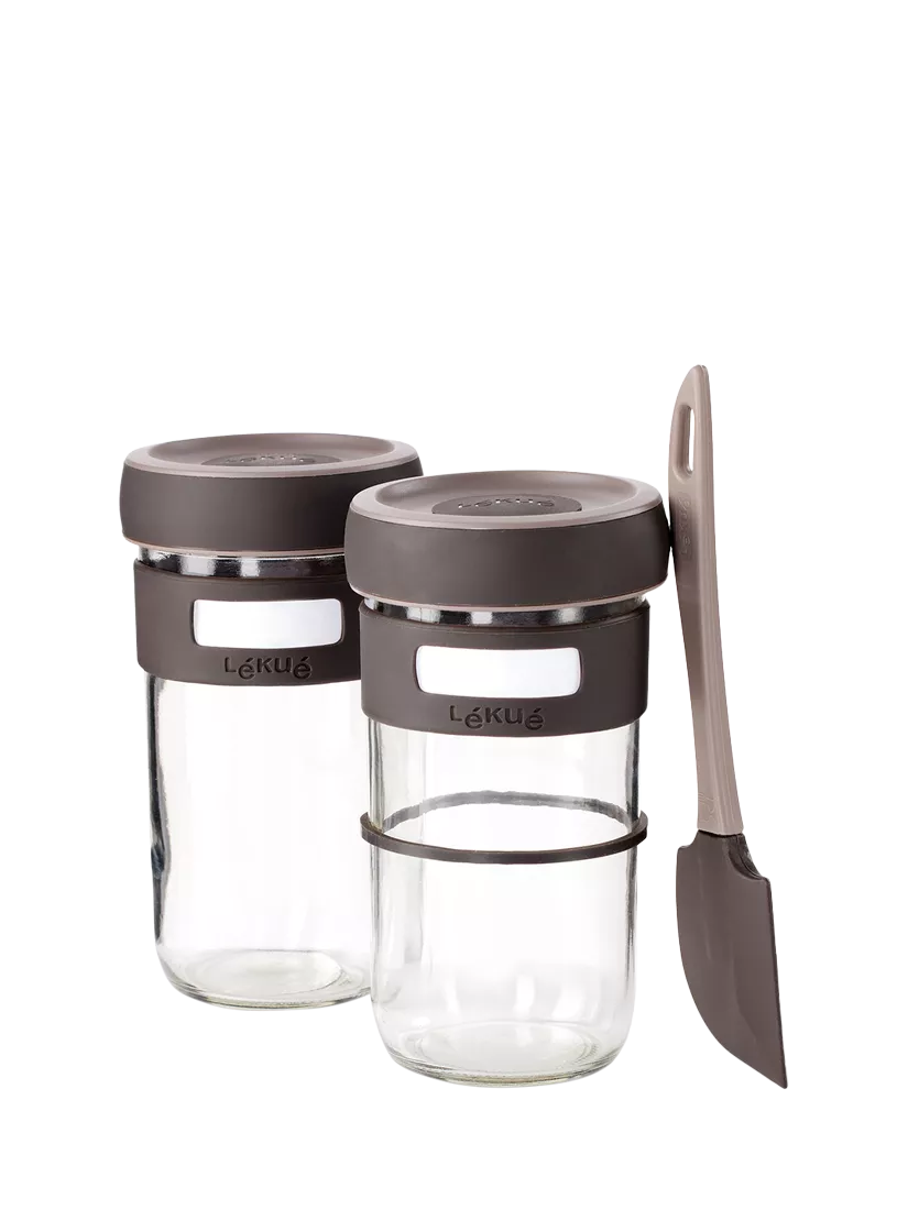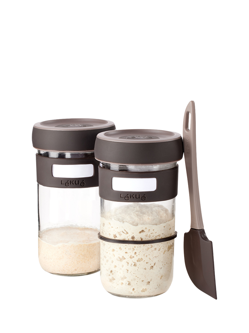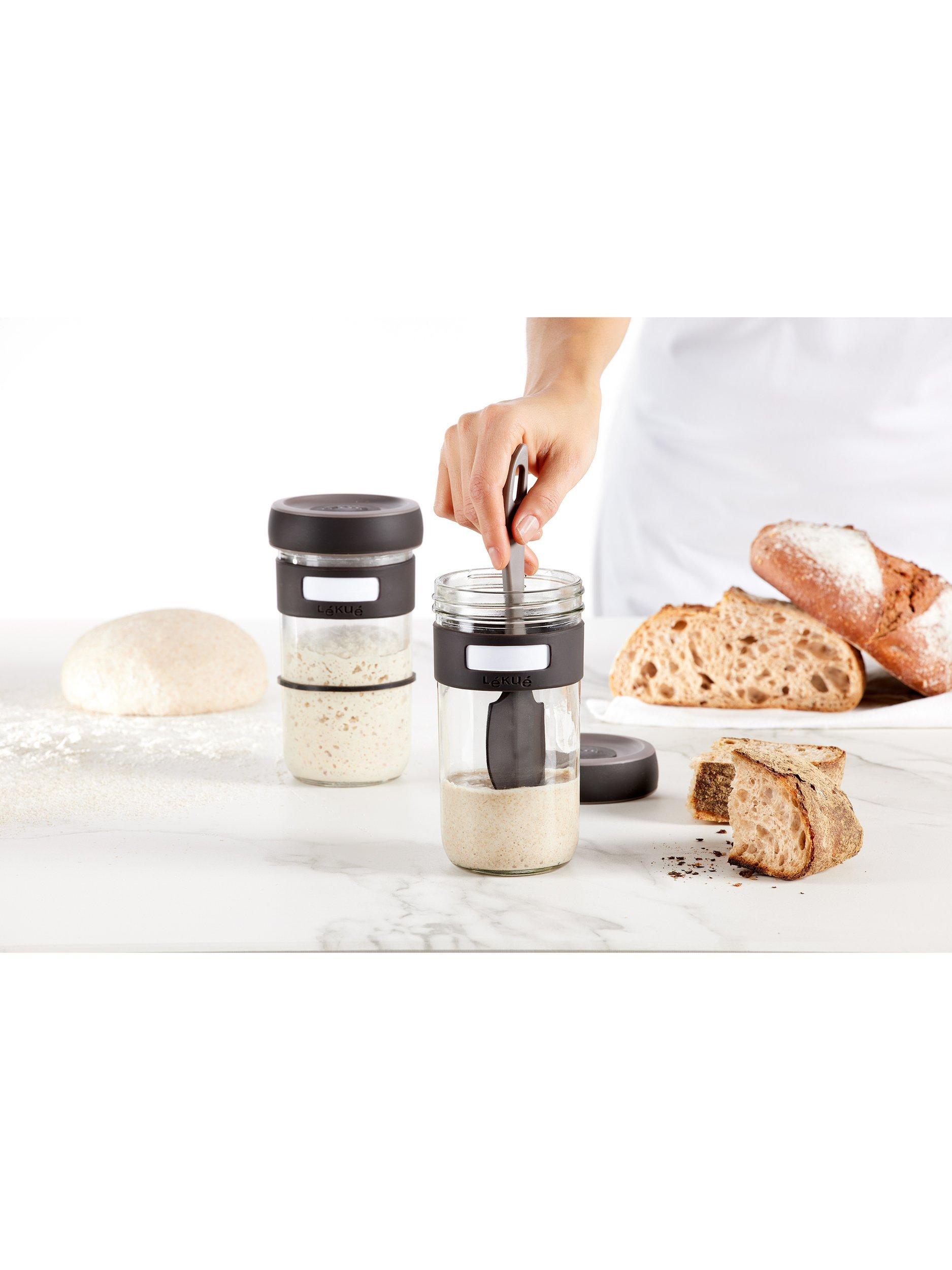 With this practical kit, it's easy to make your own sourdough at home. This starter kit contains two glass jars and a spatula. Each jar includes a lid with a valve to vent the gases, a silicone strip that acts as a marker, and a silicone ring which you can use to track the dough as it rises. Dishwasher-safe for easy cleaning.