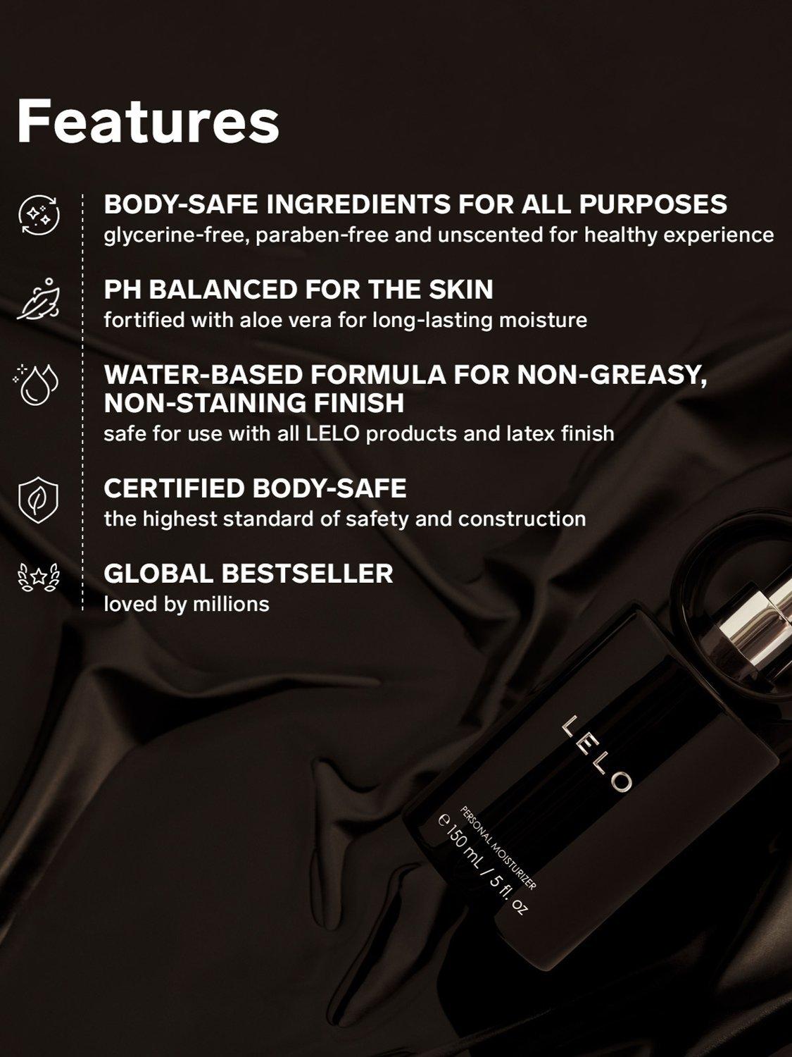 LELO's Personal Moisturizer has a non-greasy, non-staining finish safe for your skin or fabrics. This dual-purpose, water-based moisturizer is perfect for use with your pleasure products, your partner, or for enhanced sensations that add extra smoothness to your self-loving routine.