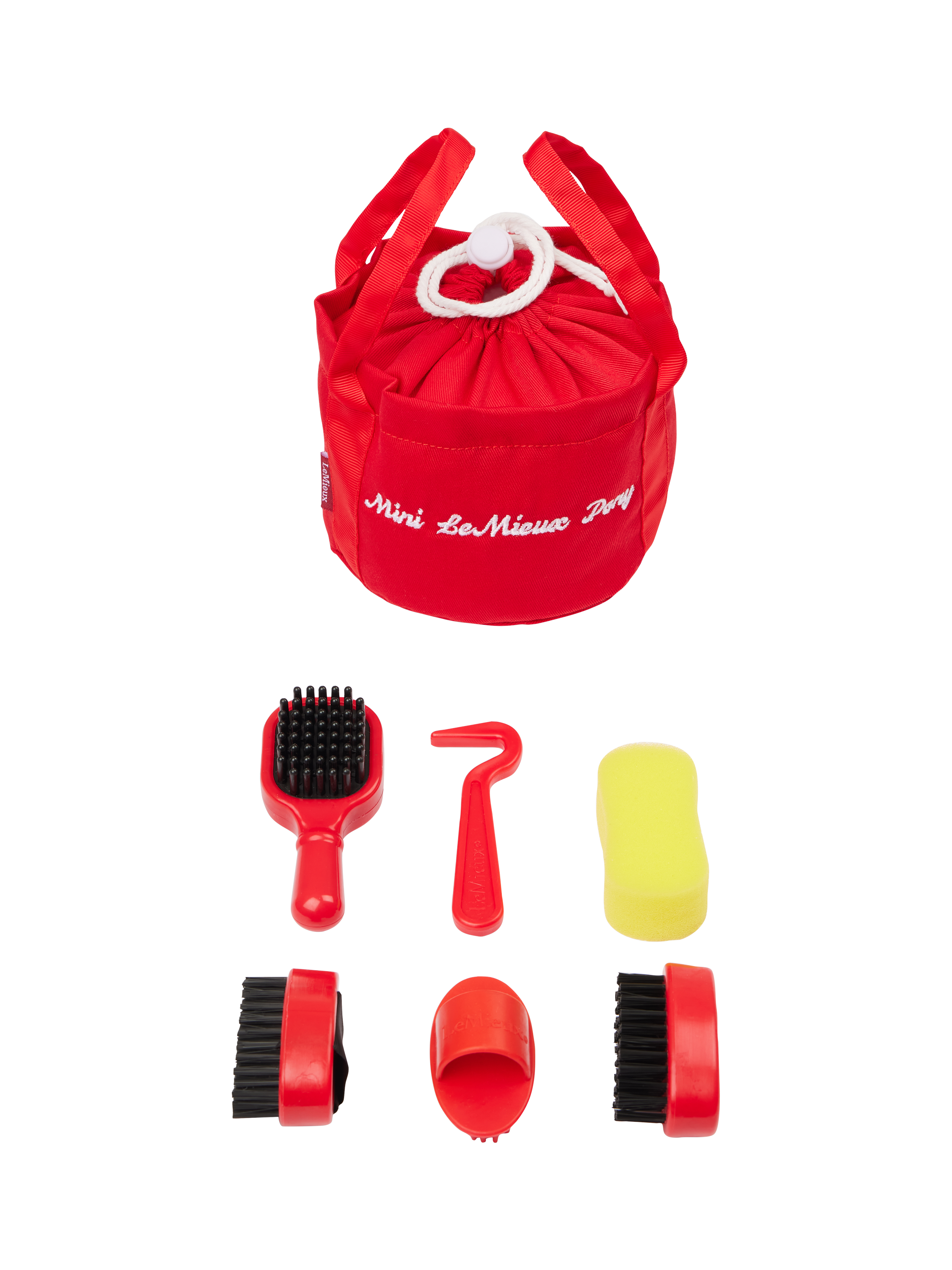 Miniature grooming kit for your LeMieux Toy Pony. Includes: brushes, curry comb, sponge, tangle tidy and hoof pick. Presented in a mini drawstring grooming bag for storage.