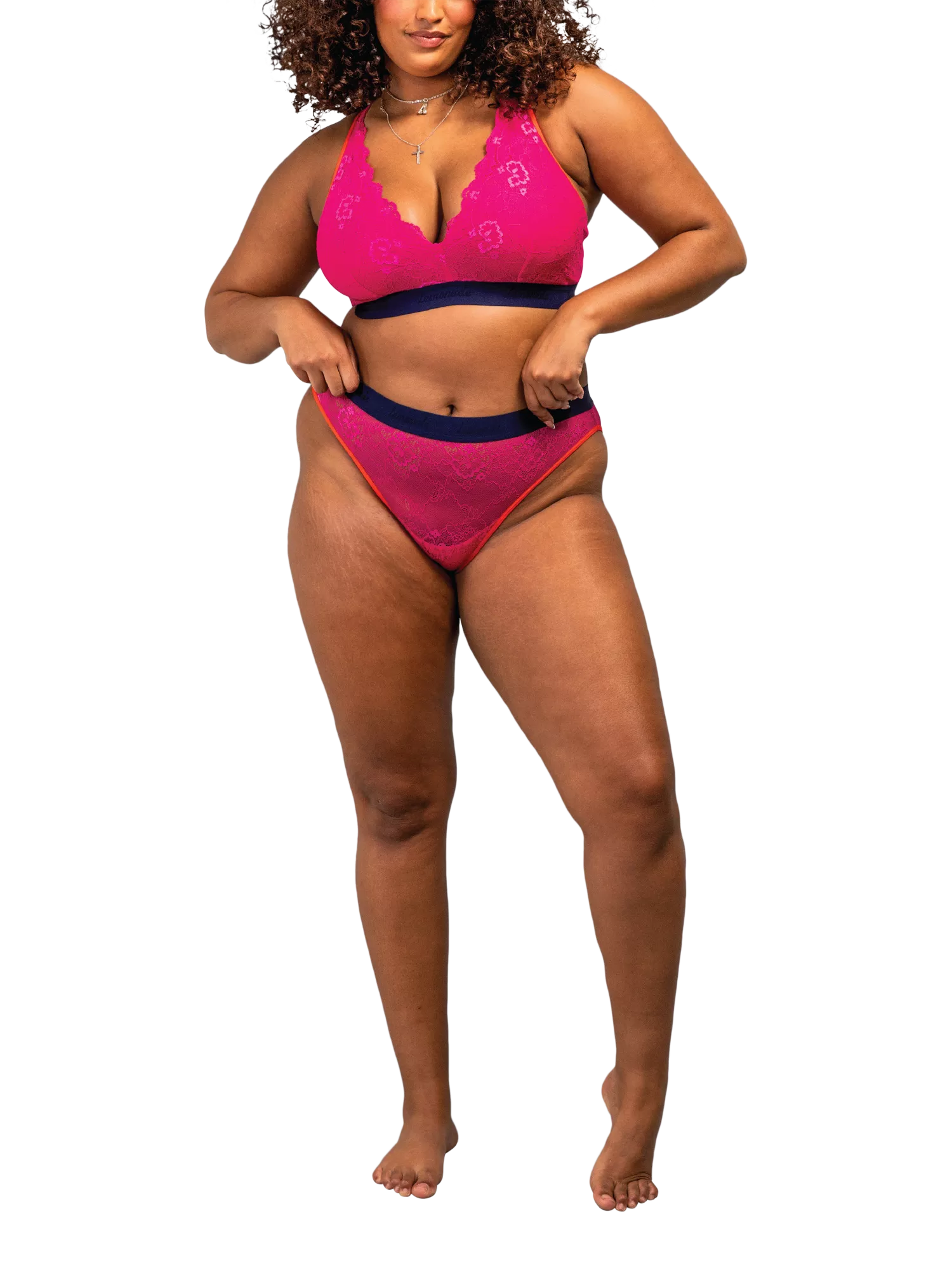 Specially designed for DD+ cup sizes and a real triple threat, the Trilogy Lace collection is a sexy and fun reinvention of Lemonade Dolls's signature picot lace, with eye-catching contrast detailing.