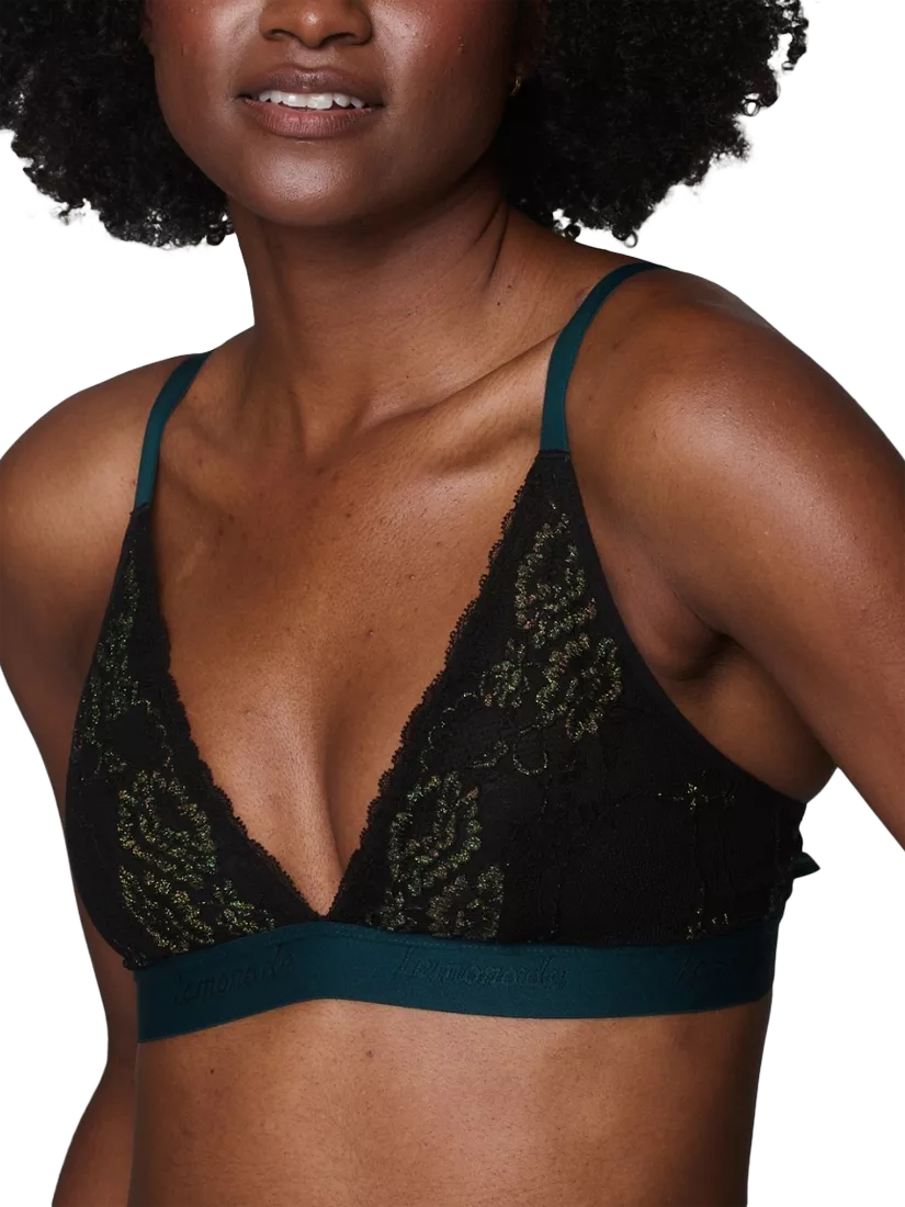 This non-wired plunge bra is crafted from the Lemonade Dolls' signature black lace, dusted with a shimmer of green glitter. Designed for comfort and style, it features a deep V-neckline, adjustable shoulder straps, and a soft 2-row hook and eye closure. Finished with the iconic Lemonade elastic band and an exclusive Wicked tab stitched into the wing.